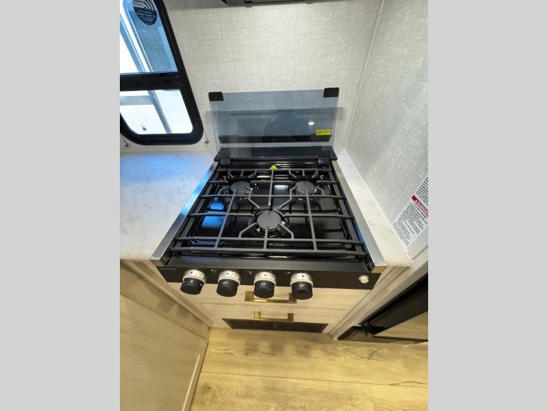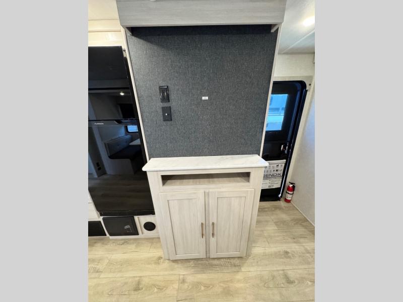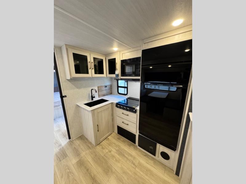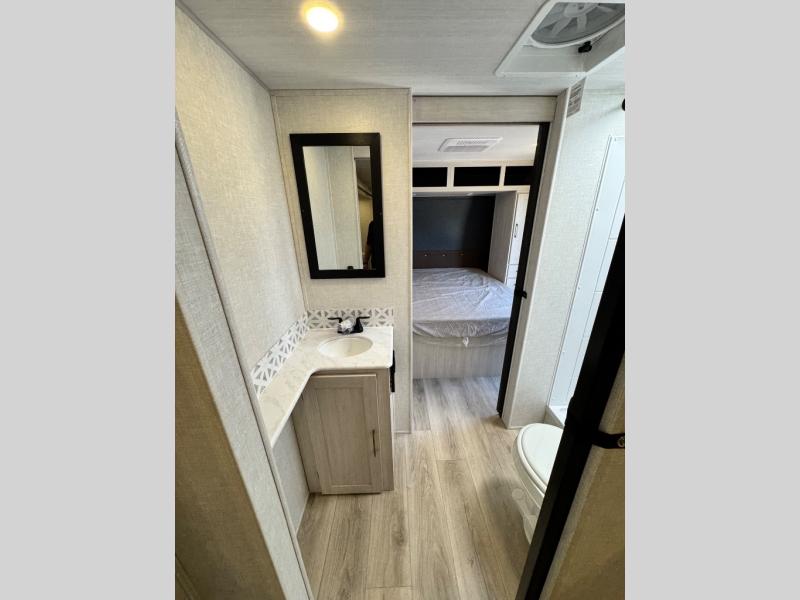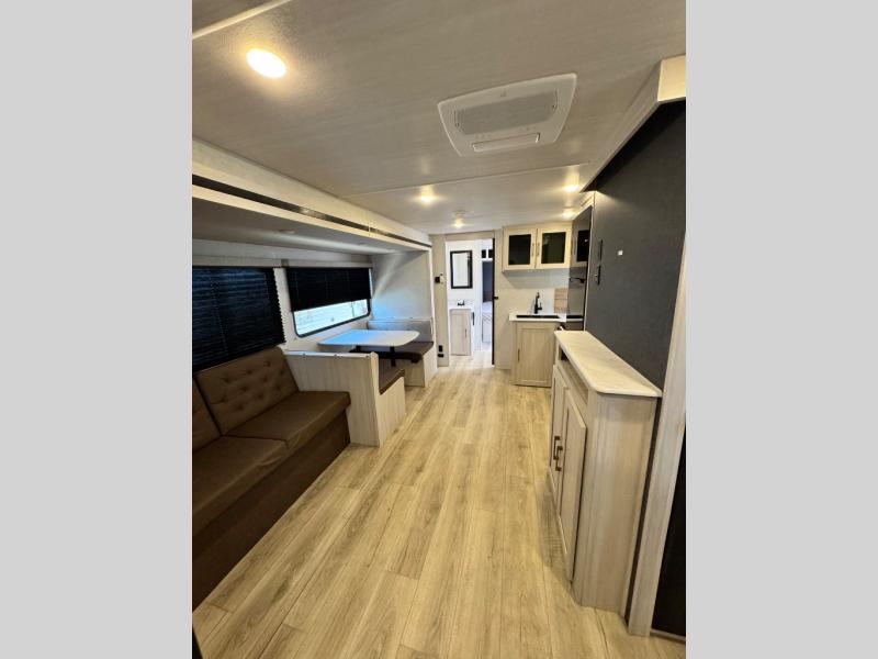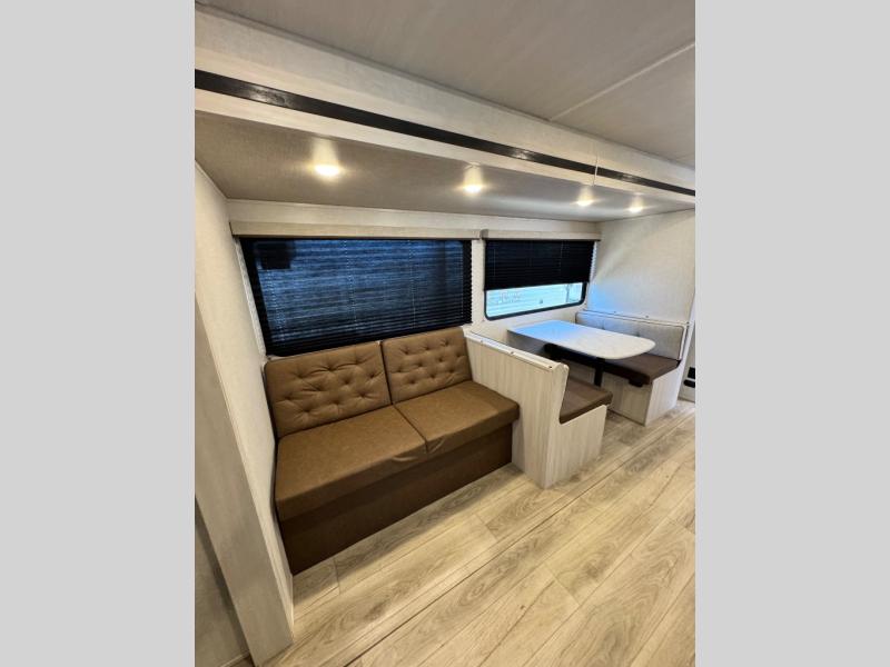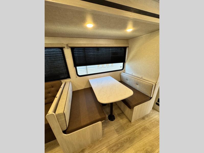 Head to your favorite camping spot with your favorite people in this spacious, dual entry travel trailer! The large slide out houses the booth dinette and sofa where you can relax in the evenings and even let guests sleep over who haven't claimed the quad bunks in the rear bunkhouse. A walk-thru bath is convenient for all, and the full kitchen lets you whip up your best meals in the microwave with an air fryer. And a walk-in pantry with washer and dryer prep makes it easier to go full-time if you choose! When it's time to call it a night, the front master bedroom with a queen bed will provide you with your own space to retreat to, and there are dual bedside wardrobes to keep your clothes organized.