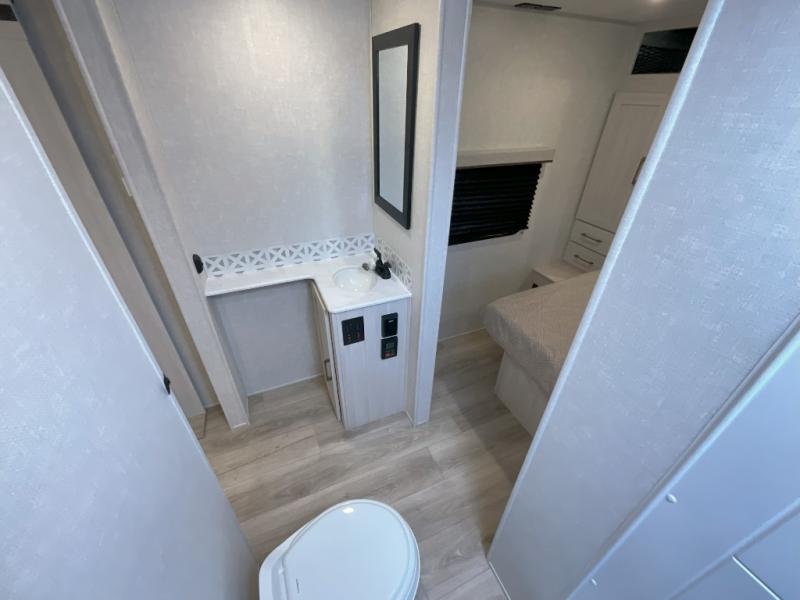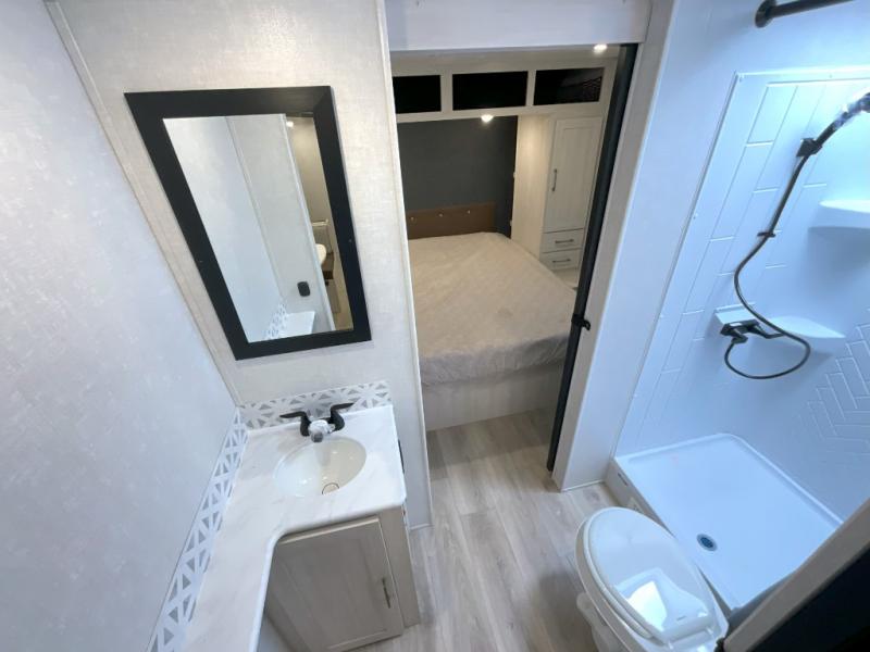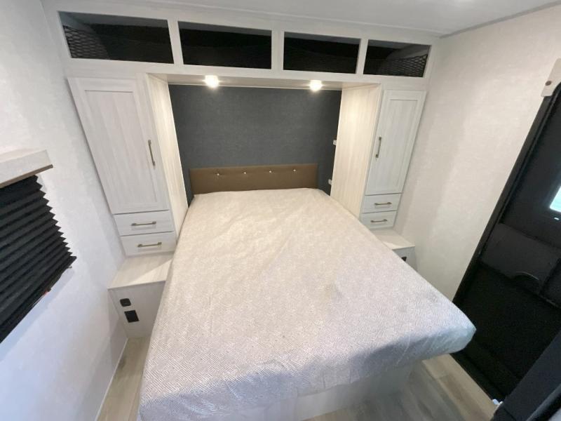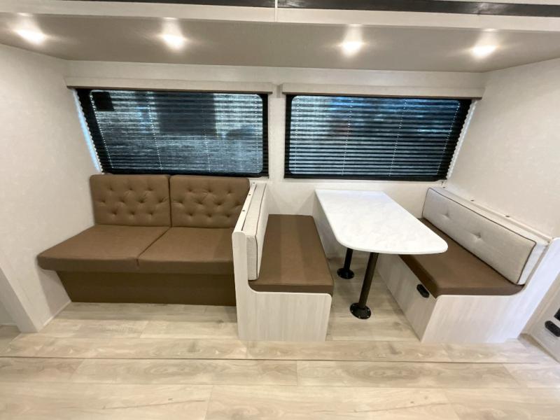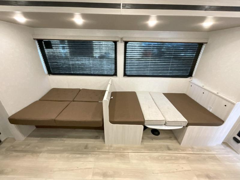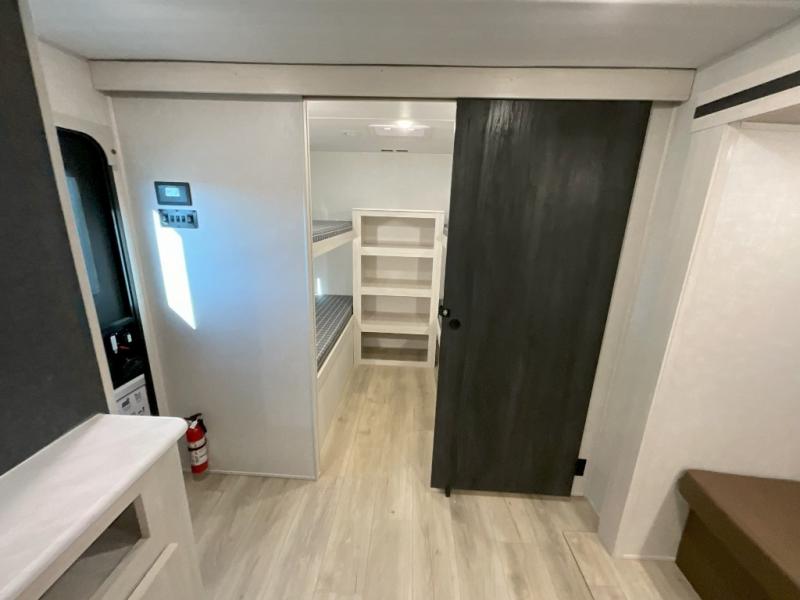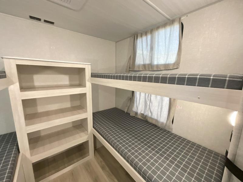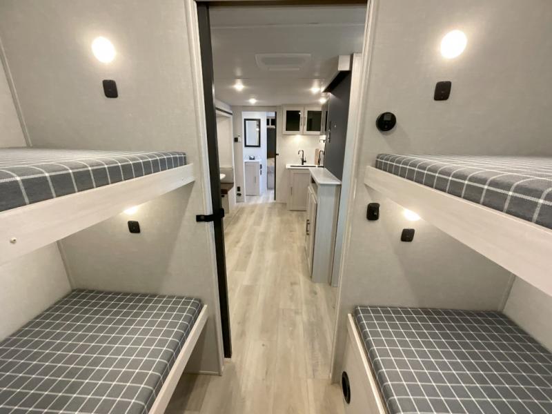 Head to your favorite camping spot with your favorite people in this spacious, dual entry travel trailer! The large slide out houses the booth dinette and sofa where you can relax in the evenings and even let guests sleep over who haven't claimed the quad bunks in the rear bunkhouse. A walk-thru bath is convenient for all, and the full kitchen lets you whip up your best meals in the microwave with an air fryer. And a walk-in pantry with washer and dryer prep makes it easier to go full-time if you choose! When it's time to call it a night, the front master bedroom with a queen bed will provide you with your own space to retreat to, and there are dual bedside wardrobes to keep your clothes organized.