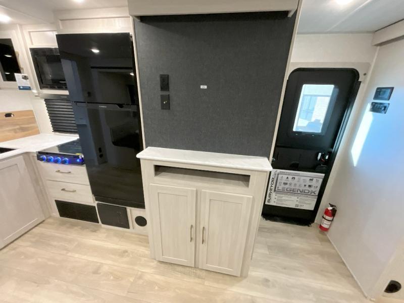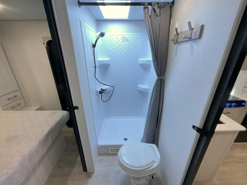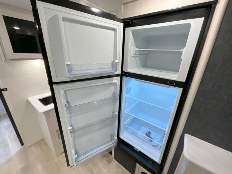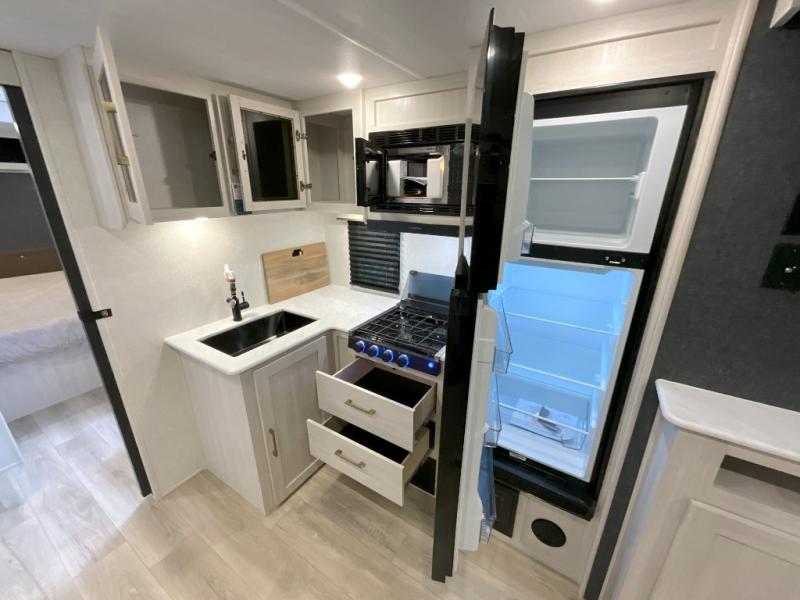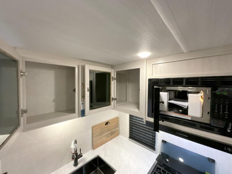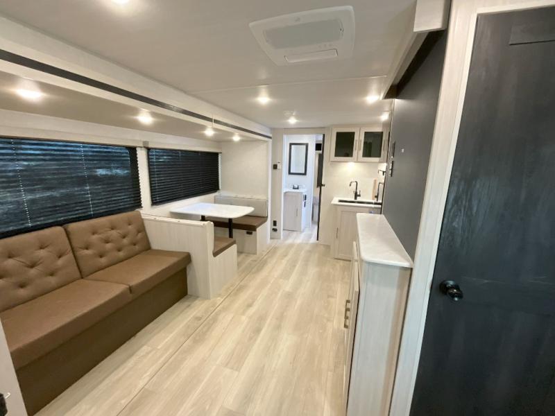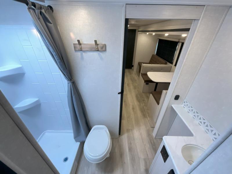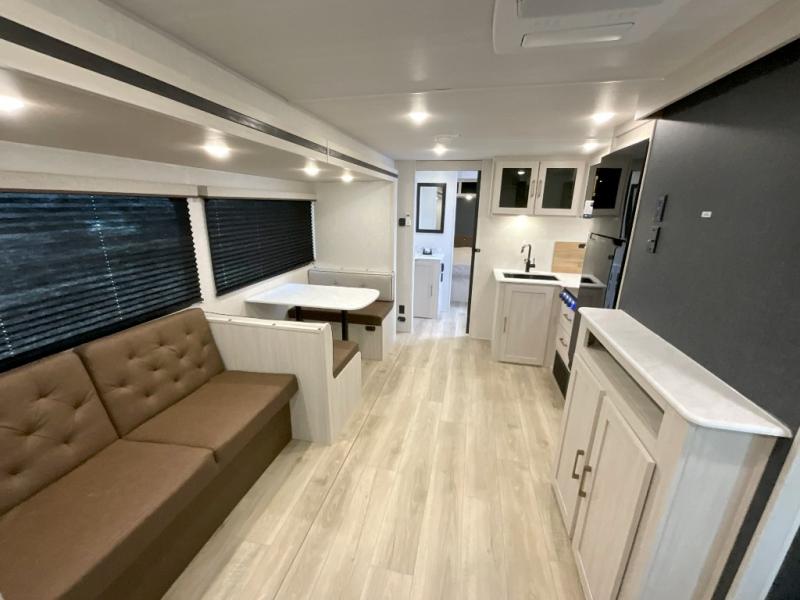 Head to your favorite camping spot with your favorite people in this spacious, dual entry travel trailer! The large slide out houses the booth dinette and sofa where you can relax in the evenings and even let guests sleep over who haven't claimed the quad bunks in the rear bunkhouse. A walk-thru bath is convenient for all, and the full kitchen lets you whip up your best meals in the microwave with an air fryer. And a walk-in pantry with washer and dryer prep makes it easier to go full-time if you choose! When it's time to call it a night, the front master bedroom with a queen bed will provide you with your own space to retreat to, and there are dual bedside wardrobes to keep your clothes organized.