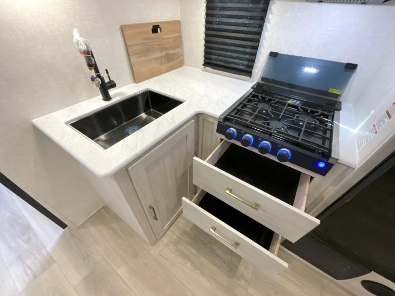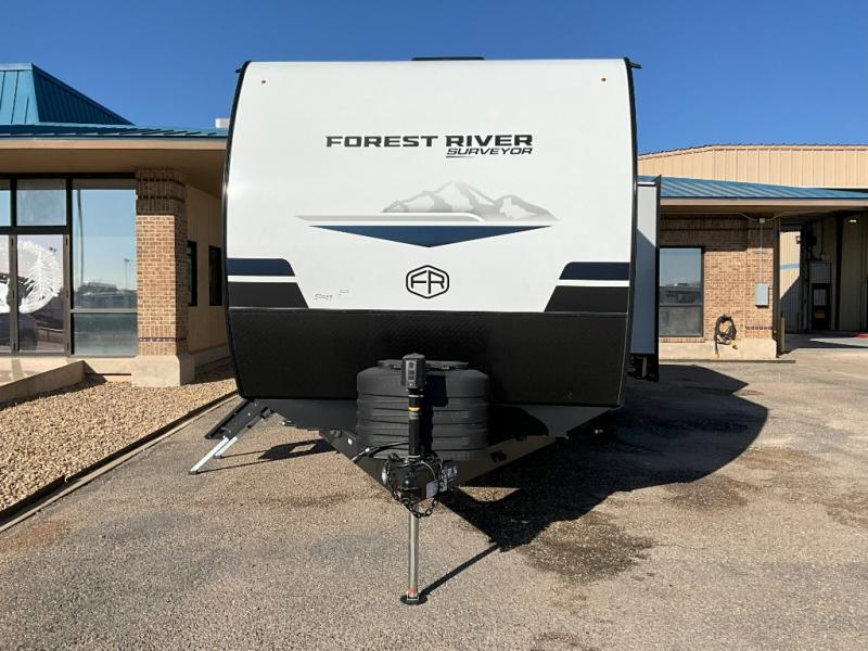 Value and versatility go hand-in-hand with the Surveyor Legend X travel trailers by Forest River. The solid construction includes a 2" aluminum framed floor with block foam insulation and a sealed underbelly with forced heat and radiant foil insulation. A 100-watt roof mounted solar panel will provide some off-grid power, and the power tongue jack will let you easily hitch up and go whenever you're ready. Additional stand-out features include Surf(X) seamless countertops throughout, two A/C units, an electric awning with LED light strip, black glass friction hinge entry door(s), and so much more!