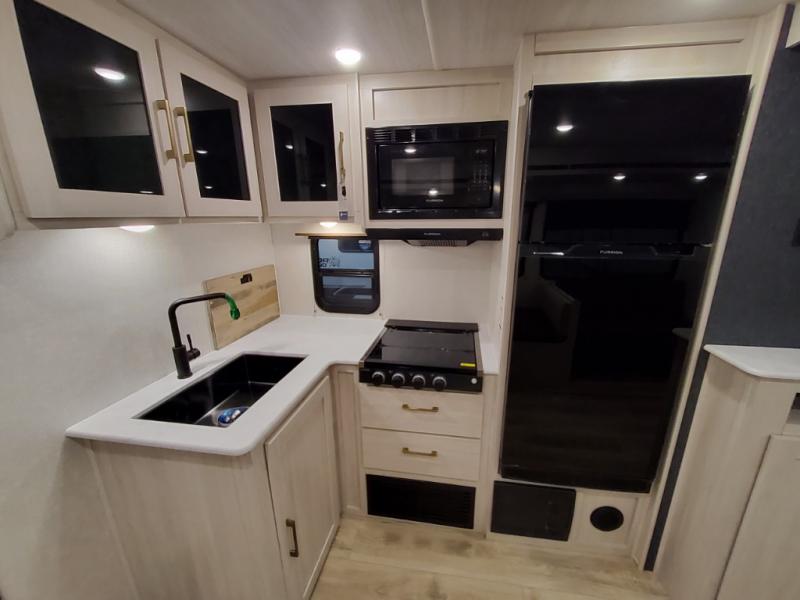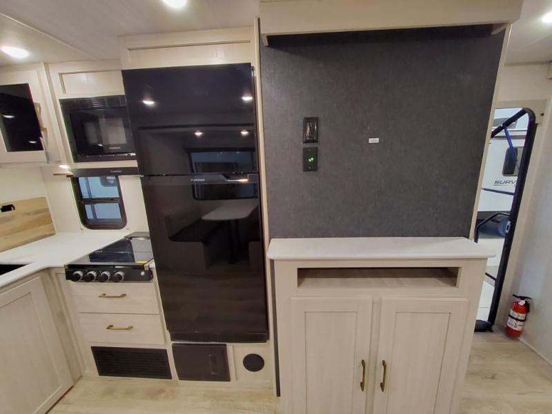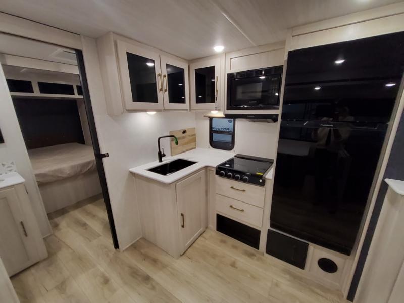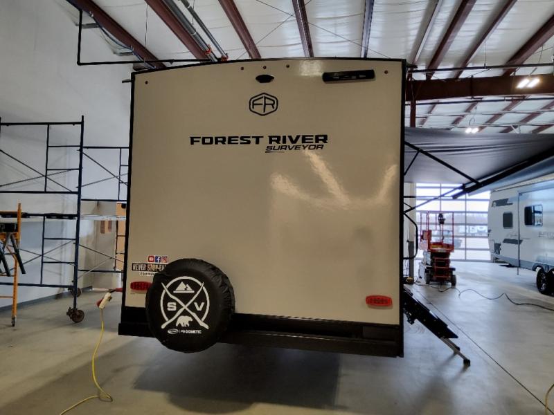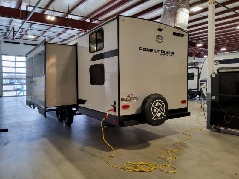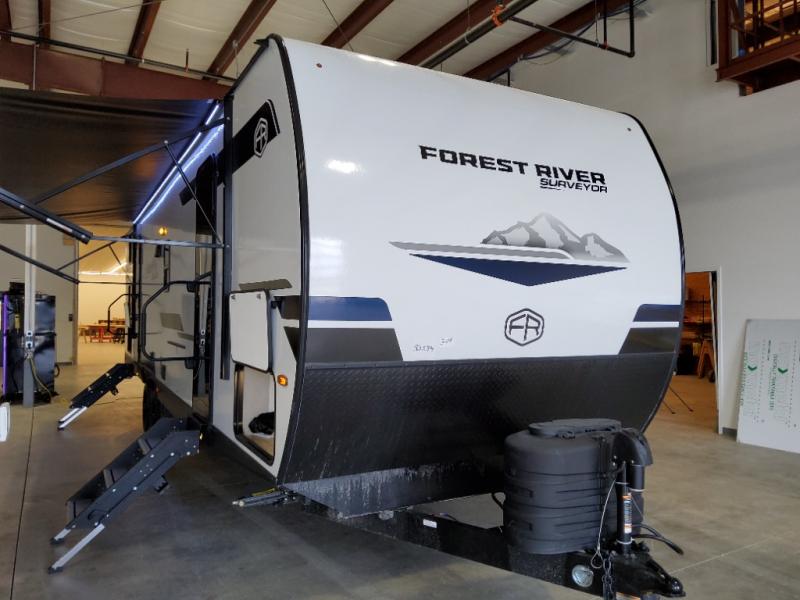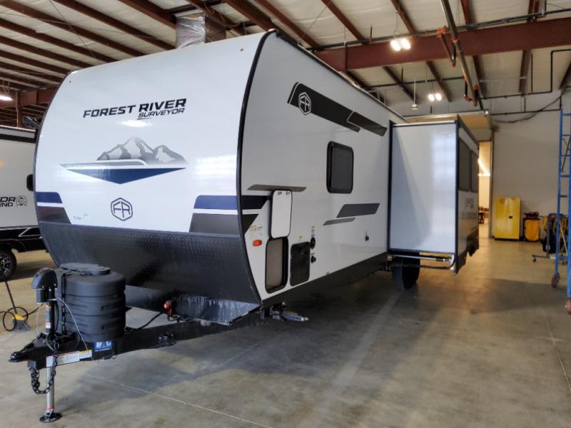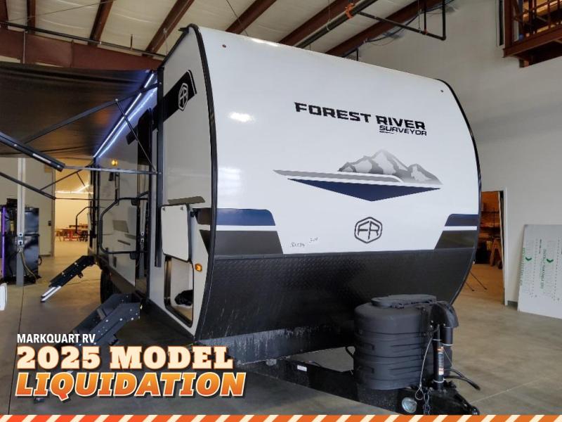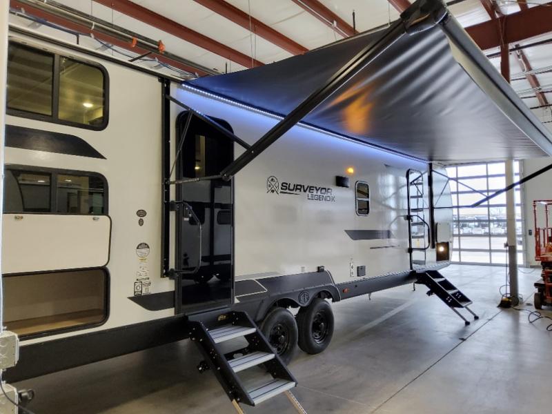Value and versatility go hand-in-hand with the Surveyor Legend X travel trailers by Forest River. The solid construction includes a 2" aluminum framed floor with block foam insulation and a sealed underbelly with forced heat and radiant foil insulation. A 100-watt roof mounted solar panel will provide some off-grid power, and the power tongue jack will let you easily hitch up and go whenever you're ready. Additional stand-out features include Surf(X) seamless countertops throughout, two A/C units, an electric awning with LED light strip, black glass friction hinge entry door(s), and so much more!