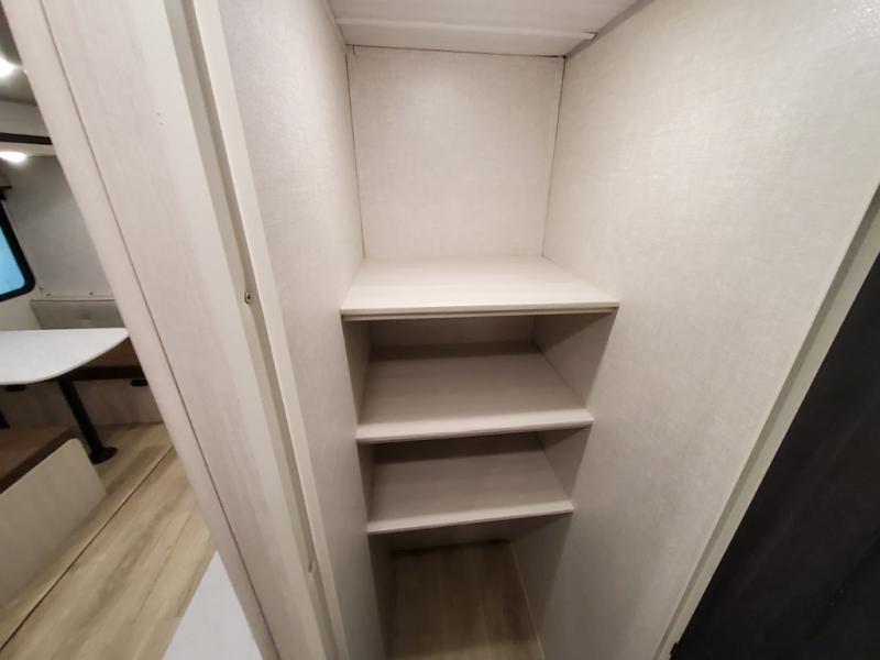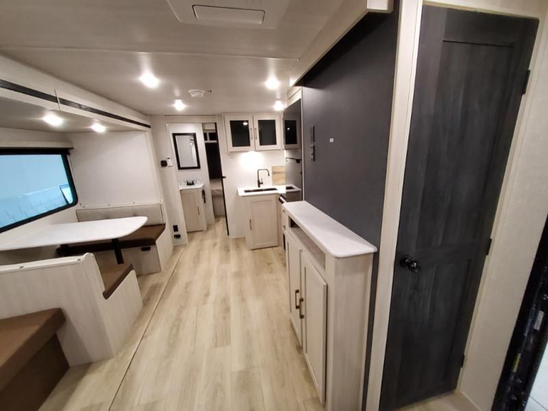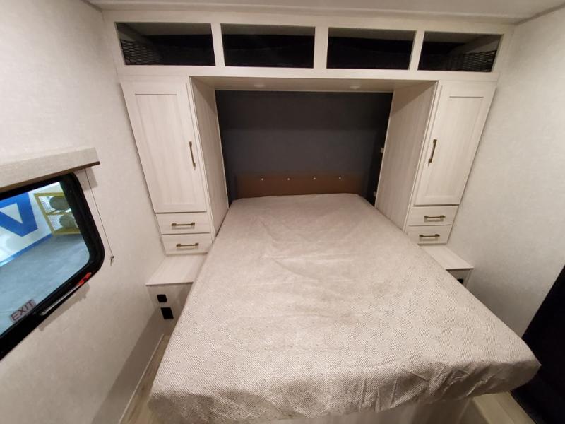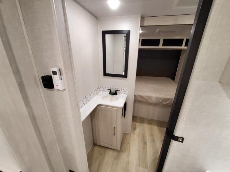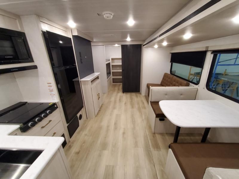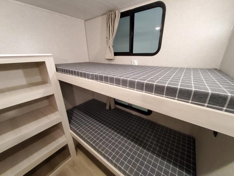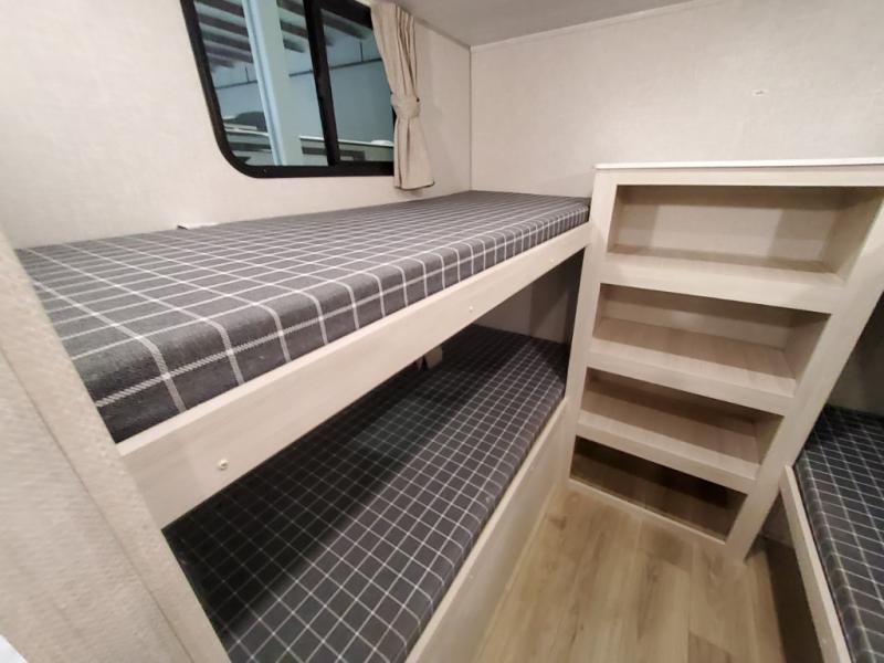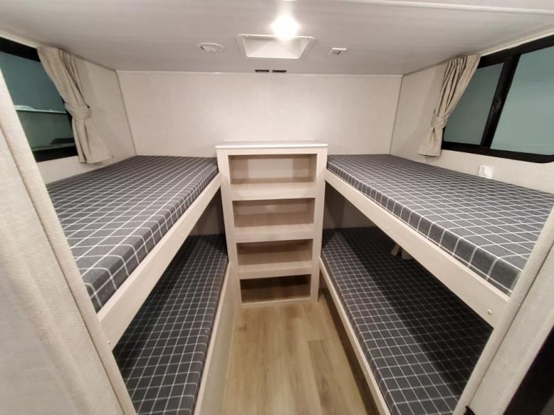 Head to your favorite camping spot with your favorite people in this spacious, dual entry travel trailer! The large slide out houses the booth dinette and sofa where you can relax in the evenings and even let guests sleep over who haven't claimed the quad bunks in the rear bunkhouse. A walk-thru bath is convenient for all, and the full kitchen lets you whip up your best meals in the microwave with an air fryer. And a walk-in pantry with washer and dryer prep makes it easier to go full-time if you choose! When it's time to call it a night, the front master bedroom with a queen bed will provide you with your own space to retreat to, and there are dual bedside wardrobes to keep your clothes organized.