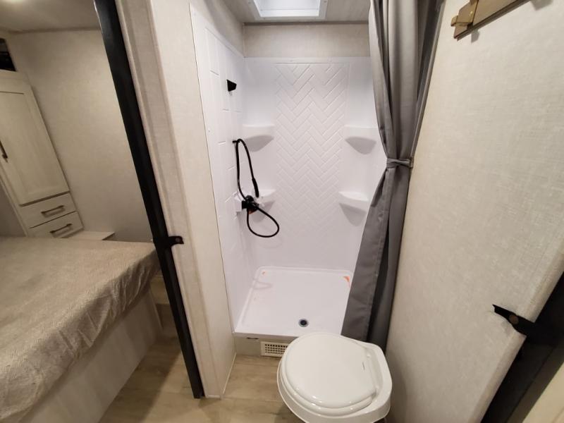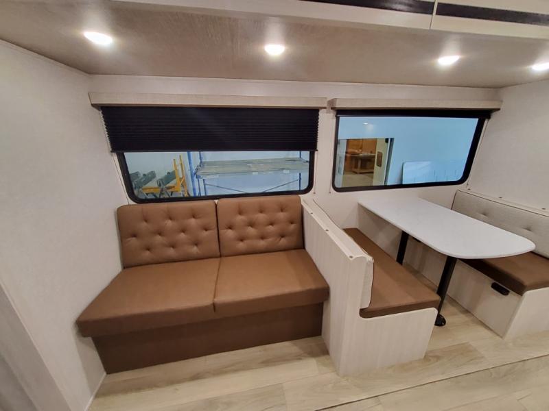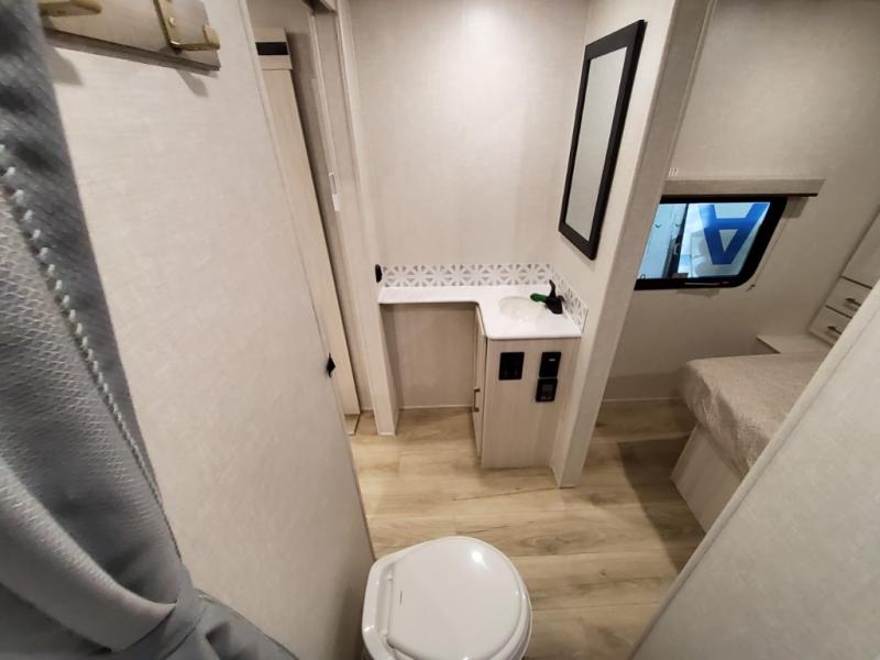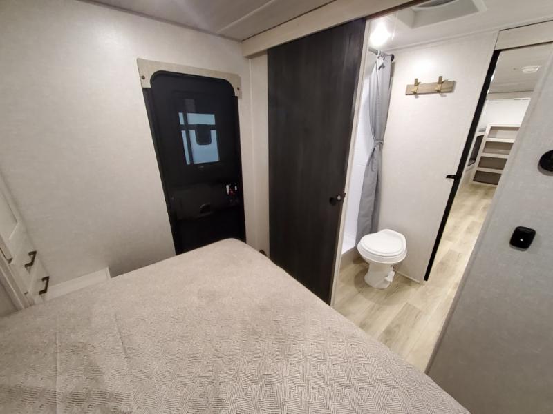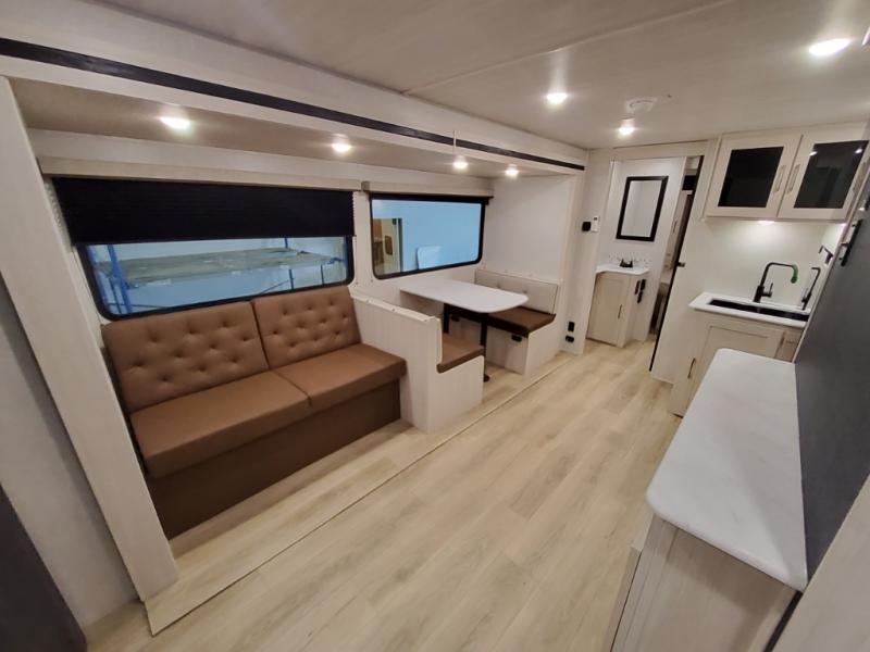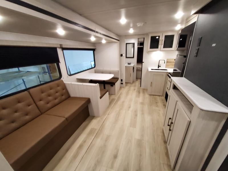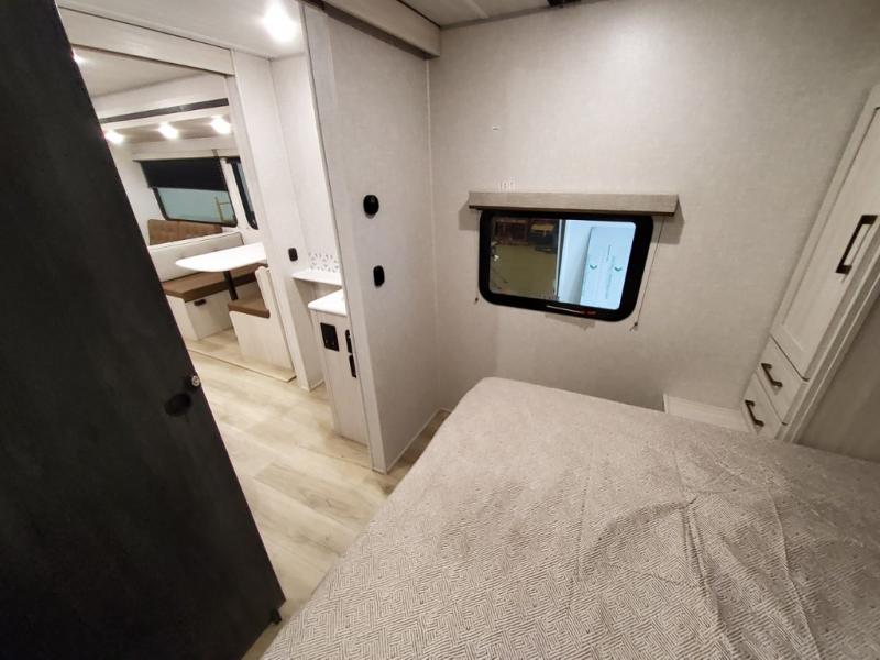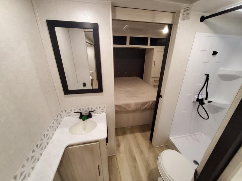 Head to your favorite camping spot with your favorite people in this spacious, dual entry travel trailer! The large slide out houses the booth dinette and sofa where you can relax in the evenings and even let guests sleep over who haven't claimed the quad bunks in the rear bunkhouse. A walk-thru bath is convenient for all, and the full kitchen lets you whip up your best meals in the microwave with an air fryer. And a walk-in pantry with washer and dryer prep makes it easier to go full-time if you choose! When it's time to call it a night, the front master bedroom with a queen bed will provide you with your own space to retreat to, and there are dual bedside wardrobes to keep your clothes organized.