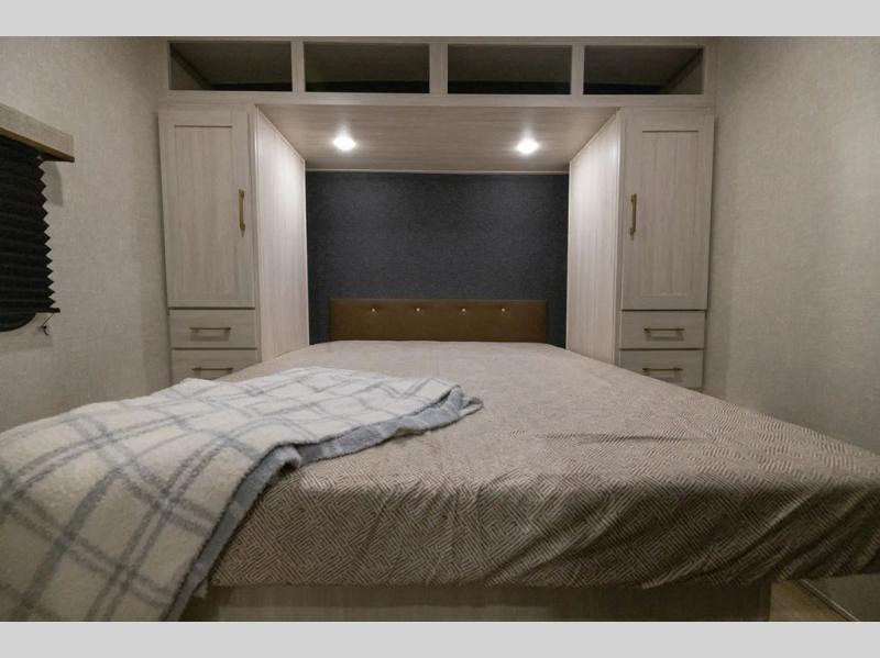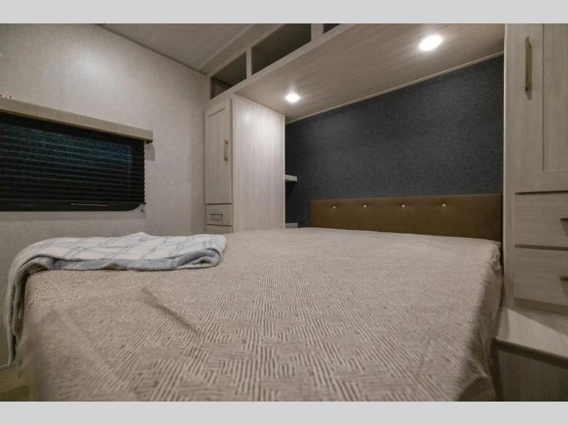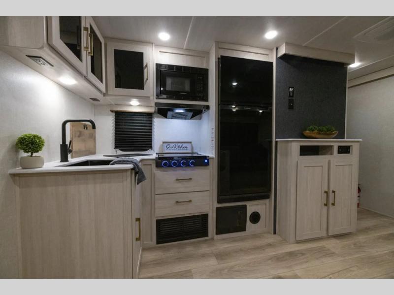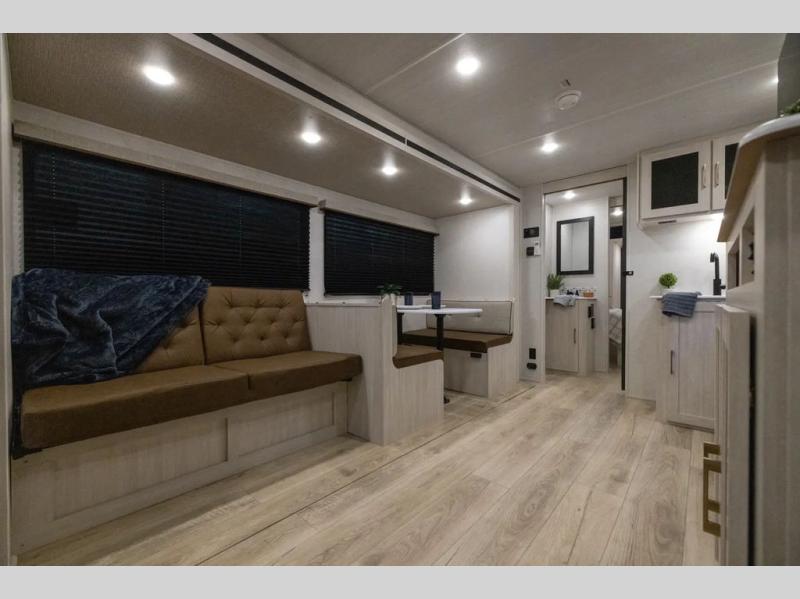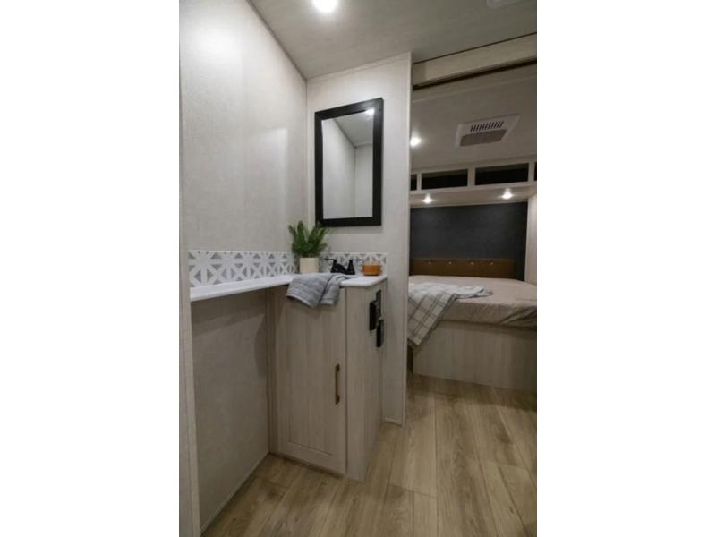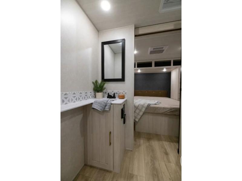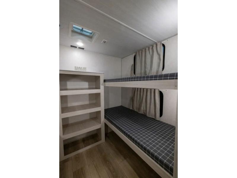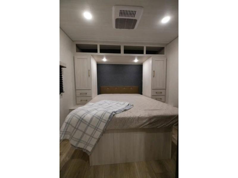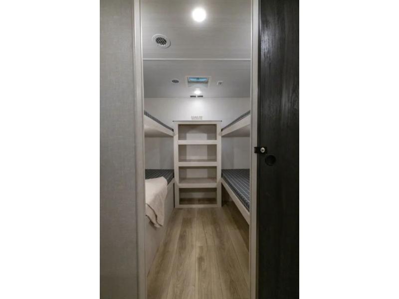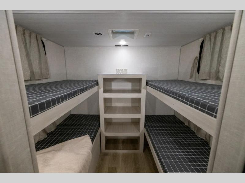 Head to your favorite camping spot with your favorite people in this spacious, dual entry travel trailer! The large slide out houses the booth dinette and sofa where you can relax in the evenings and even let guests sleep over who haven't claimed the quad bunks in the rear bunkhouse. A walk-thru bath is convenient for all, and the full kitchen lets you whip up your best meals in the microwave with an air fryer. And a walk-in pantry with washer and dryer prep makes it easier to go full-time if you choose! When it's time to call it a night, the front master bedroom with a queen bed will provide you with your own space to retreat to, and there are dual bedside wardrobes to keep your clothes organized.