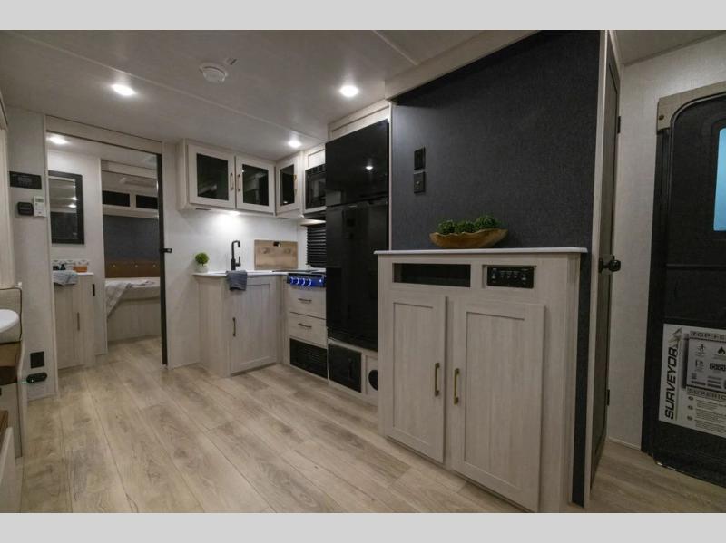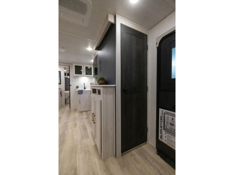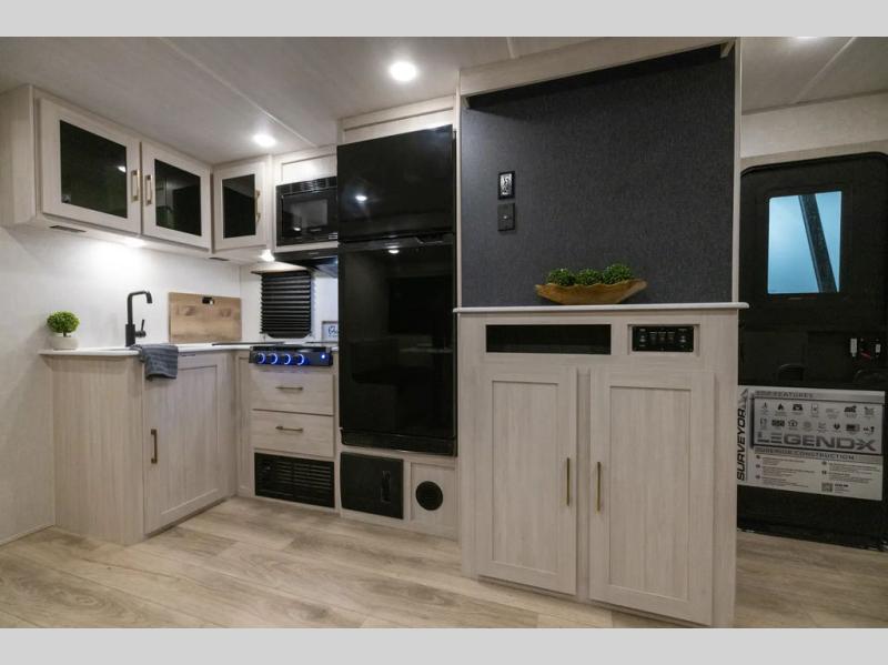 Value and versatility go hand-in-hand with the Surveyor Legend X travel trailers by Forest River. The solid construction includes a 2" aluminum framed floor with block foam insulation and a sealed underbelly with forced heat and radiant foil insulation. A 100-watt roof mounted solar panel will provide some off-grid power, and the power tongue jack will let you easily hitch up and go whenever you're ready. Additional stand-out features include Surf(X) seamless countertops throughout, two A/C units, an electric awning with LED light strip, black glass friction hinge entry door(s), and so much more!