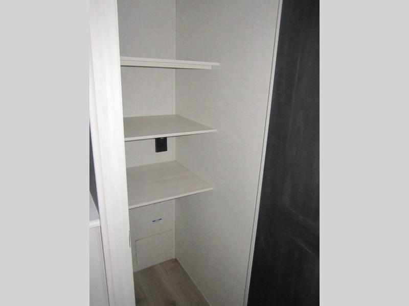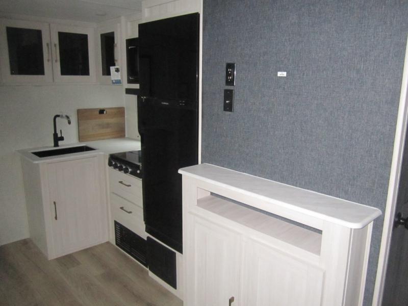 Head to your favorite camping spot with your favorite people in this spacious, dual entry travel trailer! The large slide out houses the booth dinette and sofa where you can relax in the evenings and even let guests sleep over who haven't claimed the quad bunks in the rear bunkhouse. A walk-thru bath is convenient for all, and the full kitchen lets you whip up your best meals in the microwave with an air fryer. And a walk-in pantry with washer and dryer prep makes it easier to go full-time if you choose! When it's time to call it a night, the front master bedroom with a queen bed will provide you with your own space to retreat to, and there are dual bedside wardrobes to keep your clothes organized.