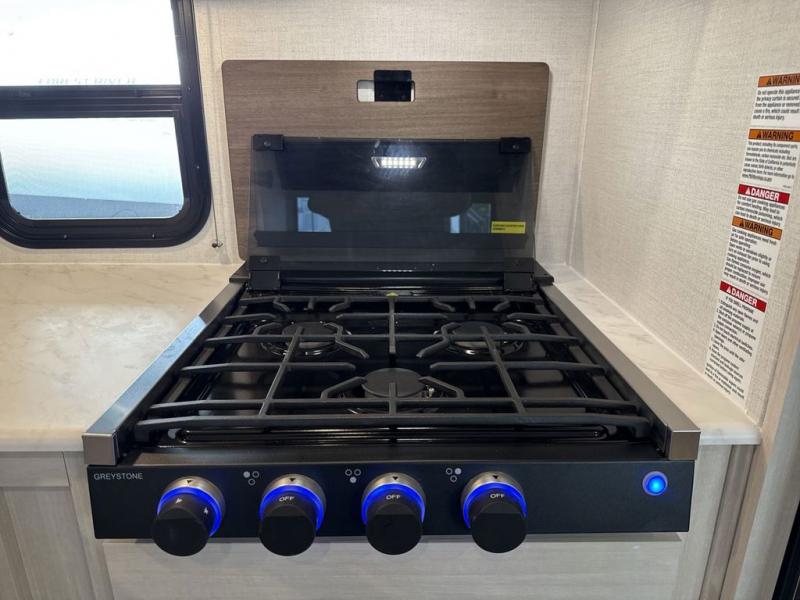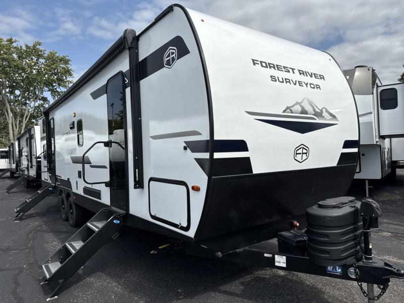 Value and versatility go hand-in-hand with the Surveyor Legend X travel trailers by Forest River. The solid construction includes a 2" aluminum framed floor with block foam insulation and a sealed underbelly with forced heat and radiant foil insulation. A 100-watt roof mounted solar panel will provide some off-grid power, and the power tongue jack will let you easily hitch up and go whenever you're ready. Additional stand-out features include Surf(X) seamless countertops throughout, two A/C units, an electric awning with LED light strip, black glass friction hinge entry door(s), and so much more!