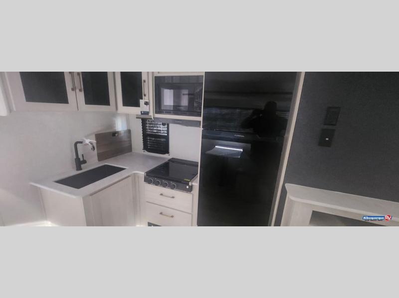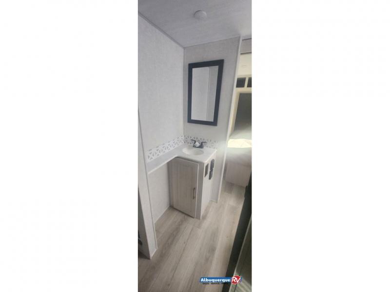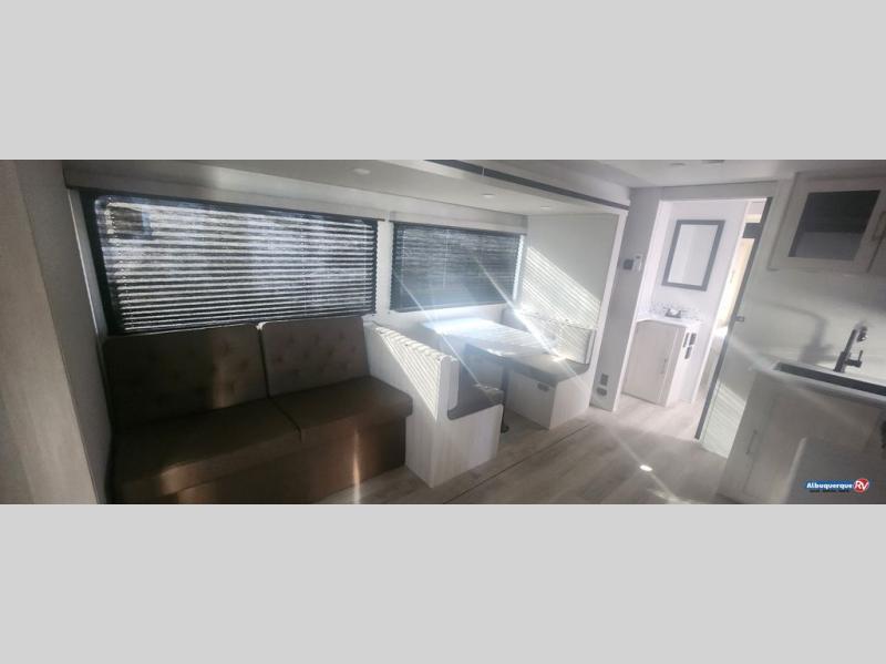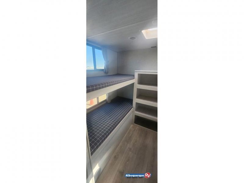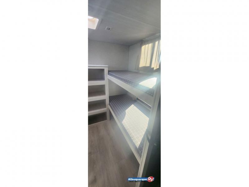 Head to your favorite camping spot with your favorite people in this spacious, dual entry travel trailer! The large slide out houses the booth dinette and sofa where you can relax in the evenings and even let guests sleep over who haven't claimed the quad bunks in the rear bunkhouse. A walk-thru bath is convenient for all, and the full kitchen lets you whip up your best meals in the microwave with an air fryer. And a walk-in pantry with washer and dryer prep makes it easier to go full-time if you choose! When it's time to call it a night, the front master bedroom with a queen bed will provide you with your own space to retreat to, and there are dual bedside wardrobes to keep your clothes organized.