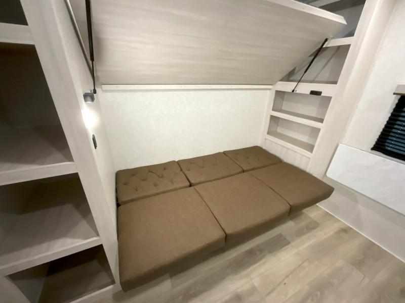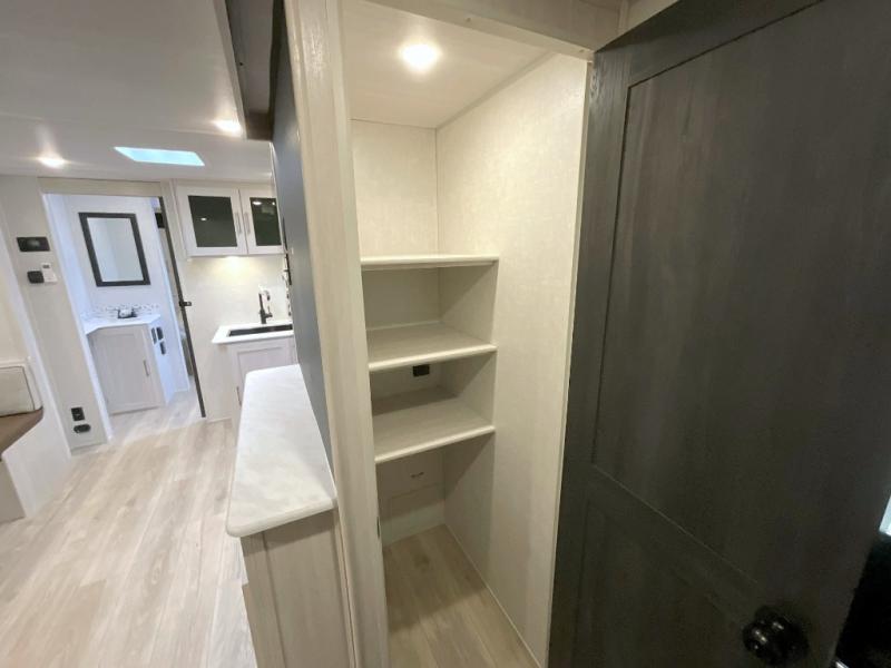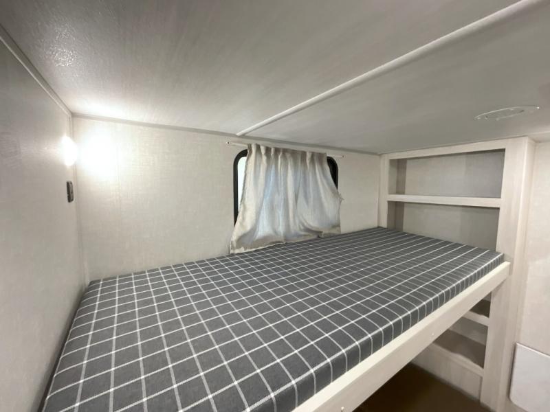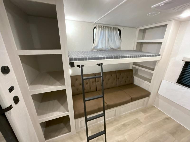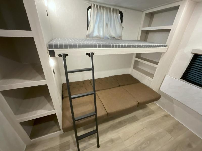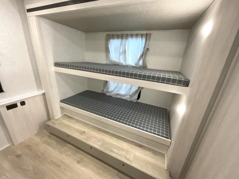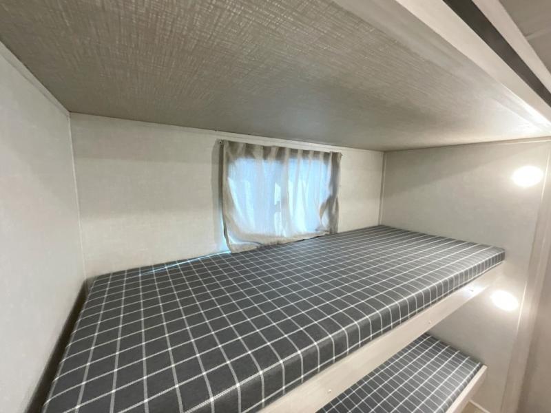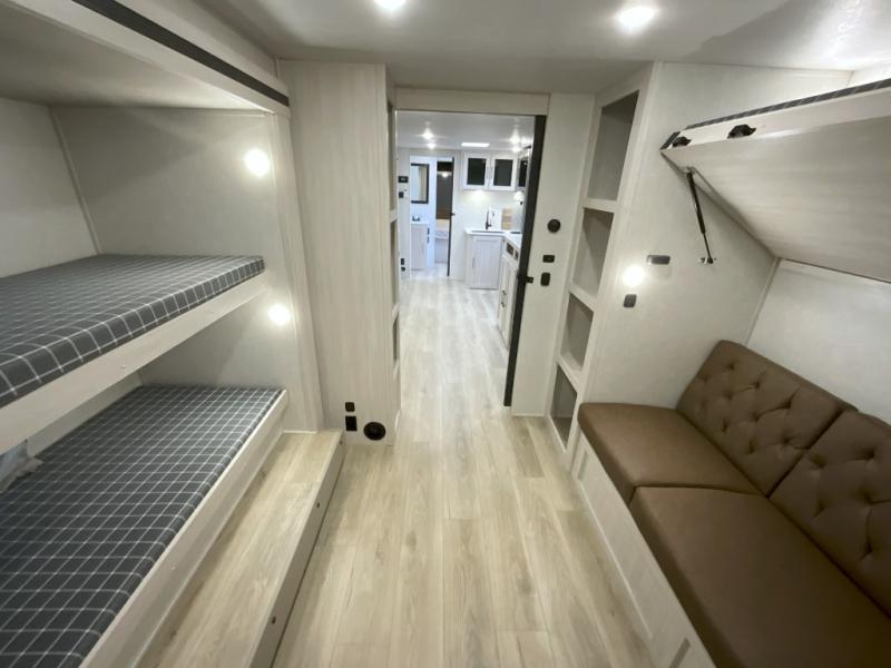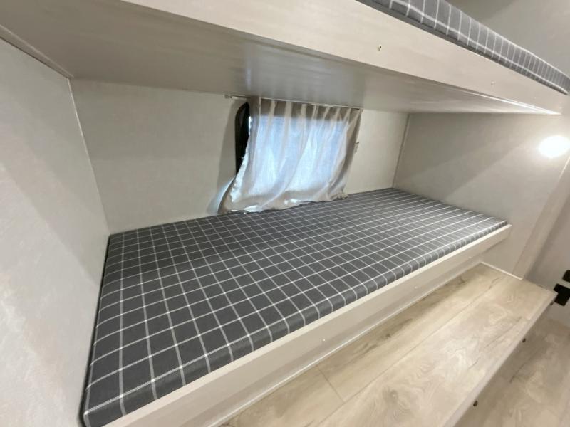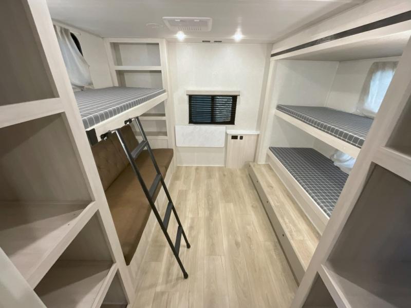 Head to your favorite camping spot with your favorite people in this spacious, dual entry travel trailer! The large slide out houses the booth dinette and sofa where you can relax in the evenings and even let guests sleep over who haven't claimed the triple bunks in the rear bunkhouse. There is also a bunkhouse sofa, two wardrobes, cubbies, and a flip-up desk if you need a space to work. A walk-thru bath is convenient for all, and the full kitchen lets you whip up your best meals in the microwave with an air fryer. There is also a walk-in pantry with washer and dryer prep if you choose to add those appliances. When it's time to call it a night, the front master bedroom with a queen bed will provide you with your own space to retreat to, and there are dual bedside wardrobes to keep your clothes organized.