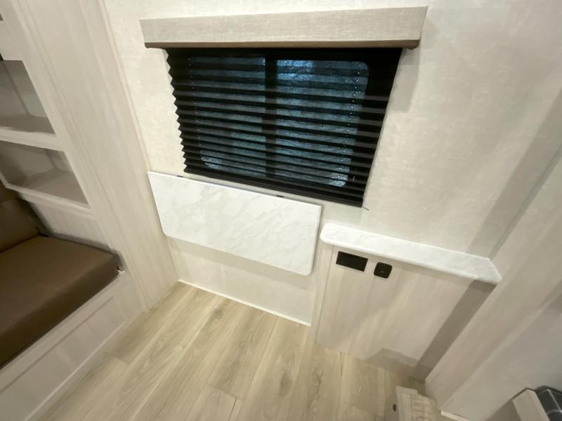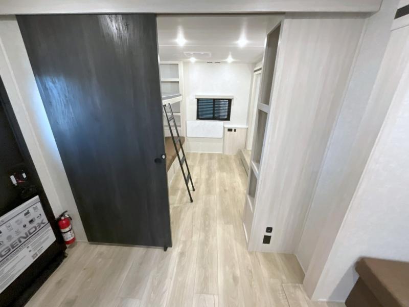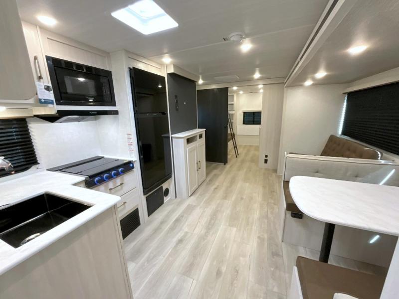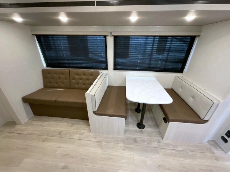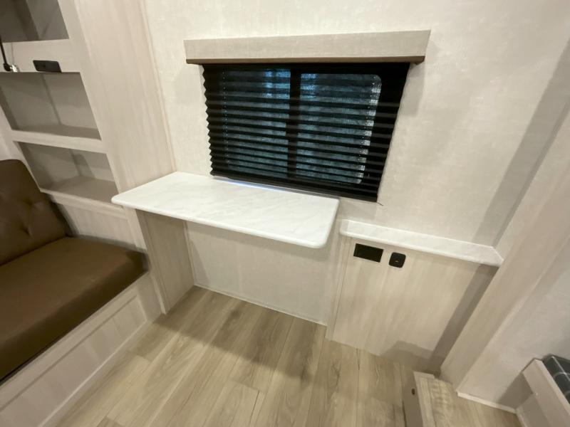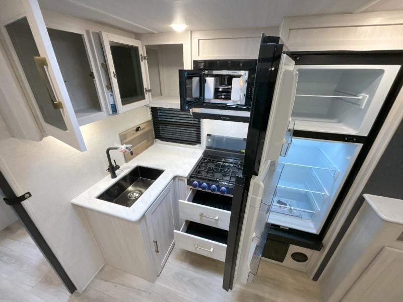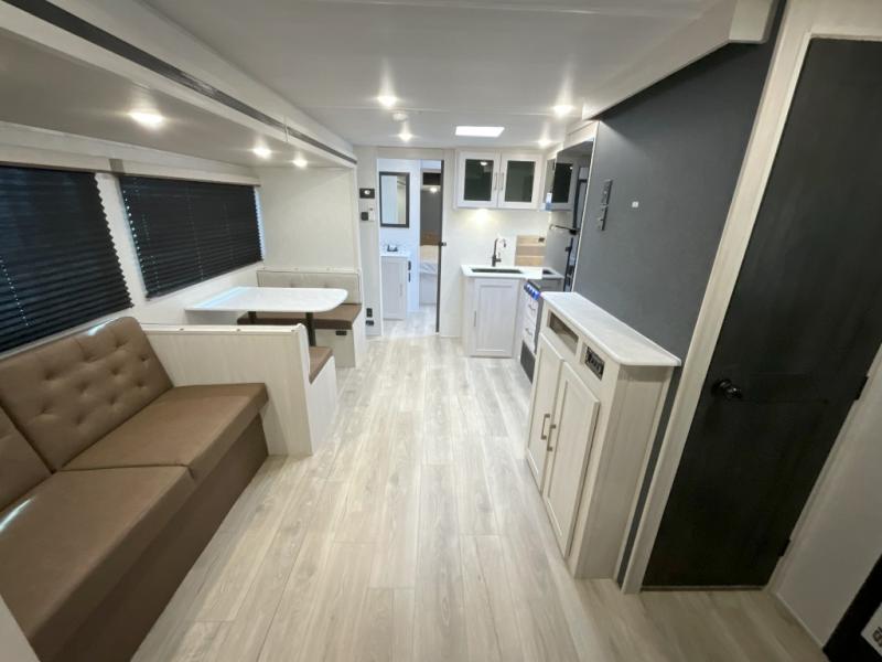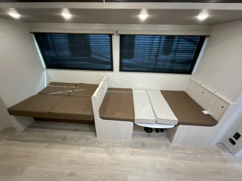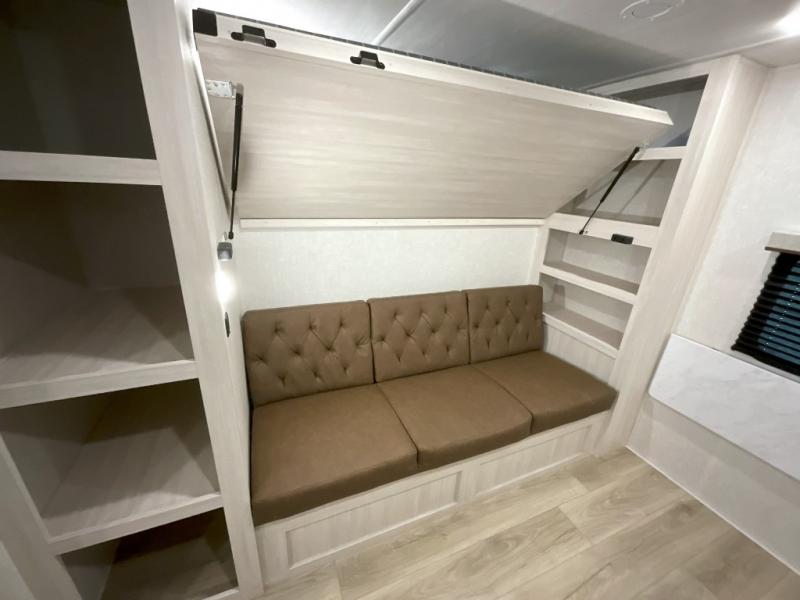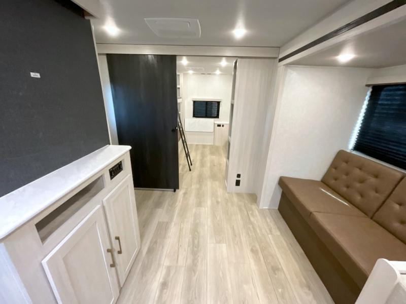 Head to your favorite camping spot with your favorite people in this spacious, dual entry travel trailer! The large slide out houses the booth dinette and sofa where you can relax in the evenings and even let guests sleep over who haven't claimed the triple bunks in the rear bunkhouse. There is also a bunkhouse sofa, two wardrobes, cubbies, and a flip-up desk if you need a space to work. A walk-thru bath is convenient for all, and the full kitchen lets you whip up your best meals in the microwave with an air fryer. There is also a walk-in pantry with washer and dryer prep if you choose to add those appliances. When it's time to call it a night, the front master bedroom with a queen bed will provide you with your own space to retreat to, and there are dual bedside wardrobes to keep your clothes organized.
