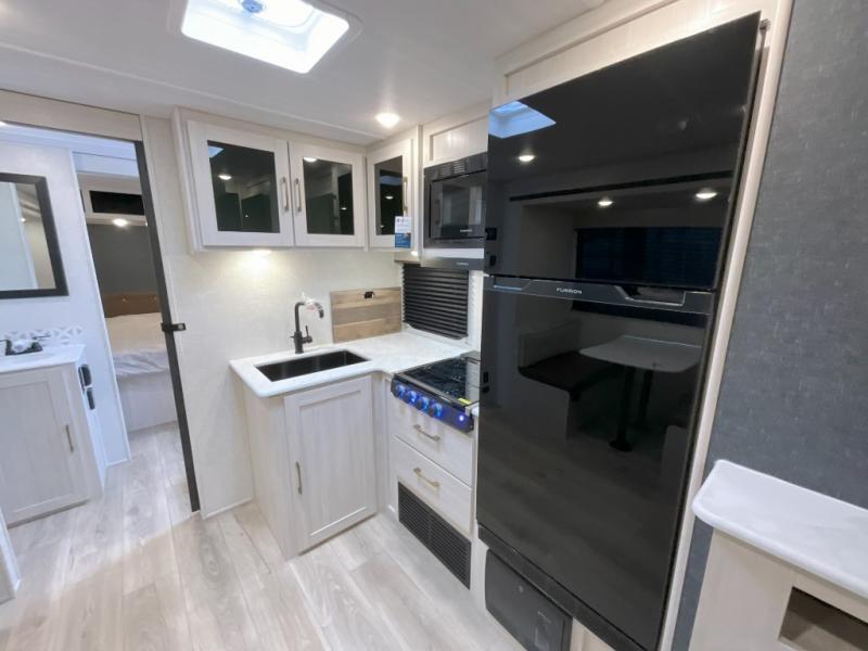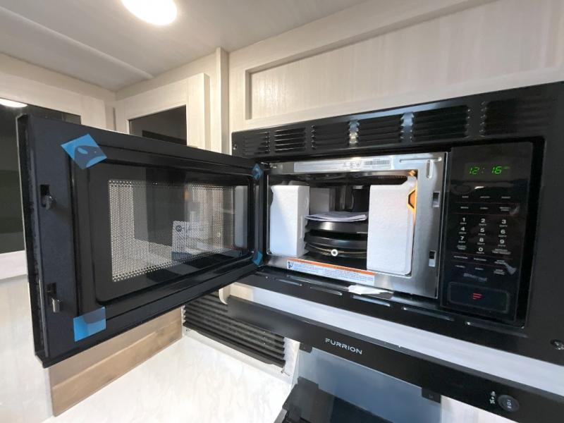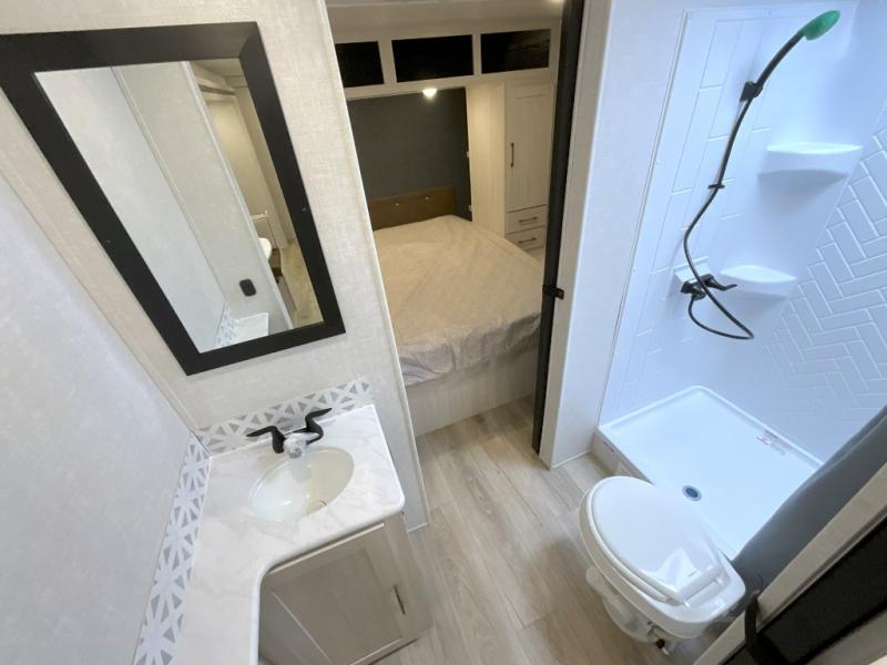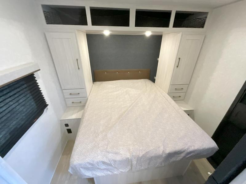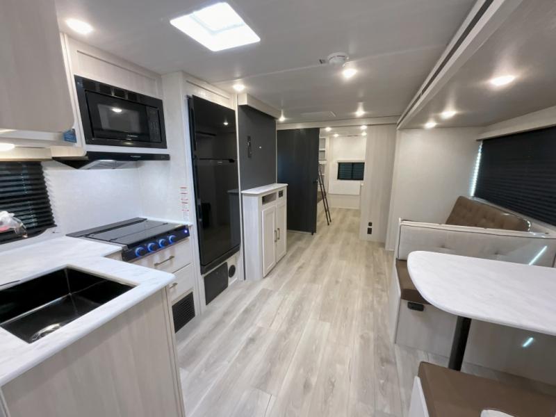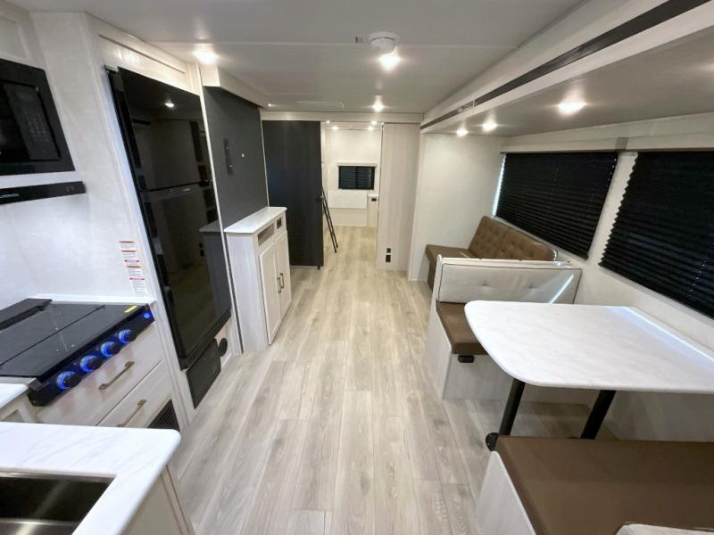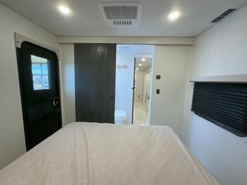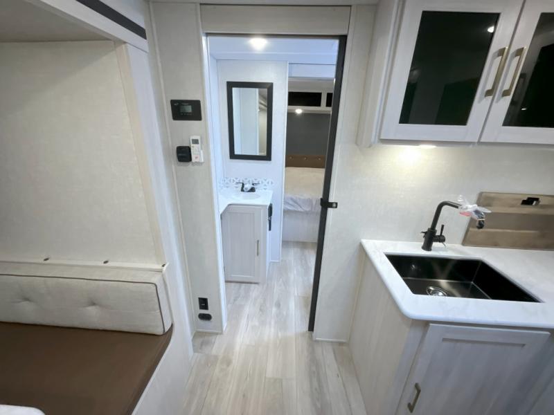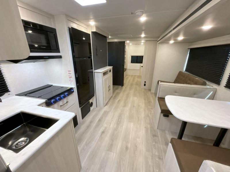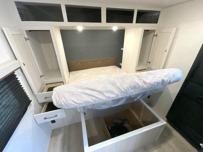 Head to your favorite camping spot with your favorite people in this spacious, dual entry travel trailer! The large slide out houses the booth dinette and sofa where you can relax in the evenings and even let guests sleep over who haven't claimed the triple bunks in the rear bunkhouse. There is also a bunkhouse sofa, two wardrobes, cubbies, and a flip-up desk if you need a space to work. A walk-thru bath is convenient for all, and the full kitchen lets you whip up your best meals in the microwave with an air fryer. There is also a walk-in pantry with washer and dryer prep if you choose to add those appliances. When it's time to call it a night, the front master bedroom with a queen bed will provide you with your own space to retreat to, and there are dual bedside wardrobes to keep your clothes organized.