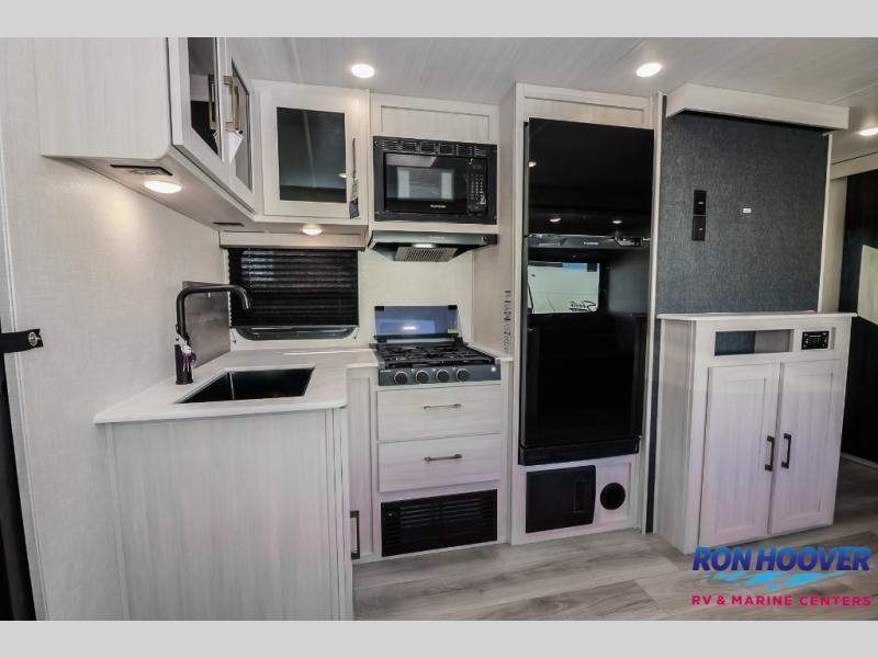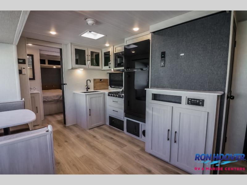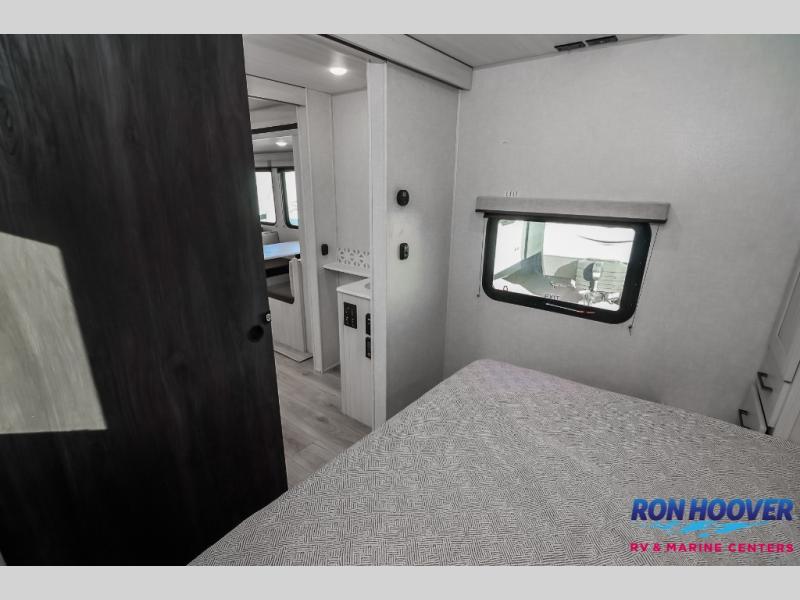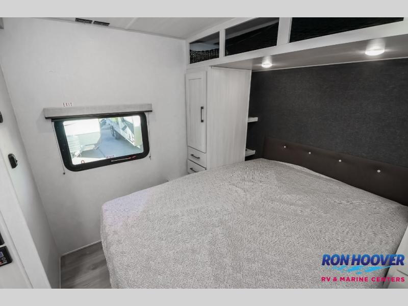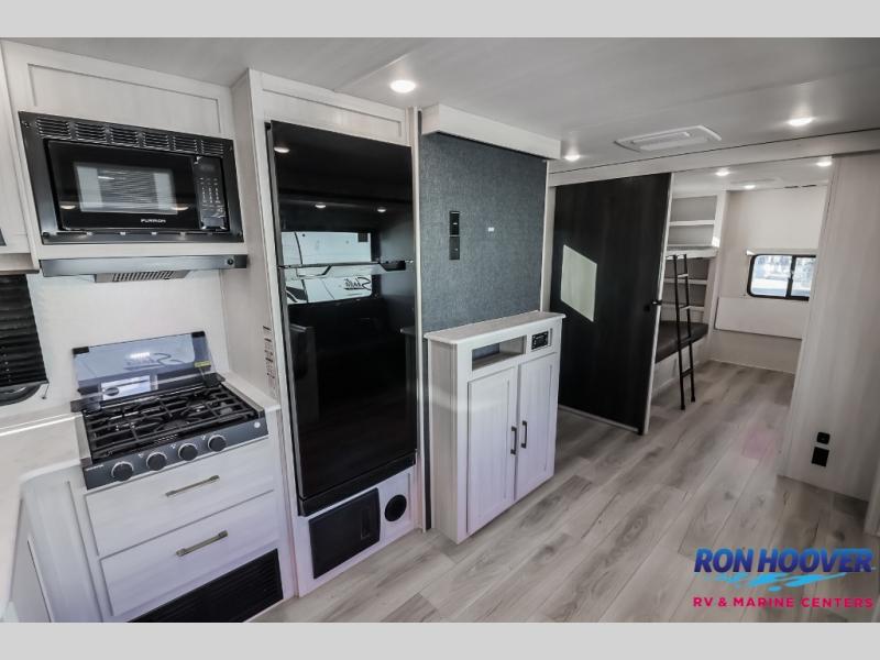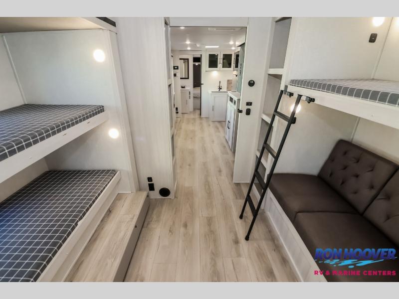 Head to your favorite camping spot with your favorite people in this spacious, dual entry travel trailer! The large slide out houses the booth dinette and sofa where you can relax in the evenings and even let guests sleep over who haven't claimed the triple bunks in the rear bunkhouse. There is also a bunkhouse sofa, two wardrobes, cubbies, and a flip-up desk if you need a space to work. A walk-thru bath is convenient for all, and the full kitchen lets you whip up your best meals in the microwave with an air fryer. There is also a walk-in pantry with washer and dryer prep if you choose to add those appliances. When it's time to call it a night, the front master bedroom with a queen bed will provide you with your own space to retreat to, and there are dual bedside wardrobes to keep your clothes organized.