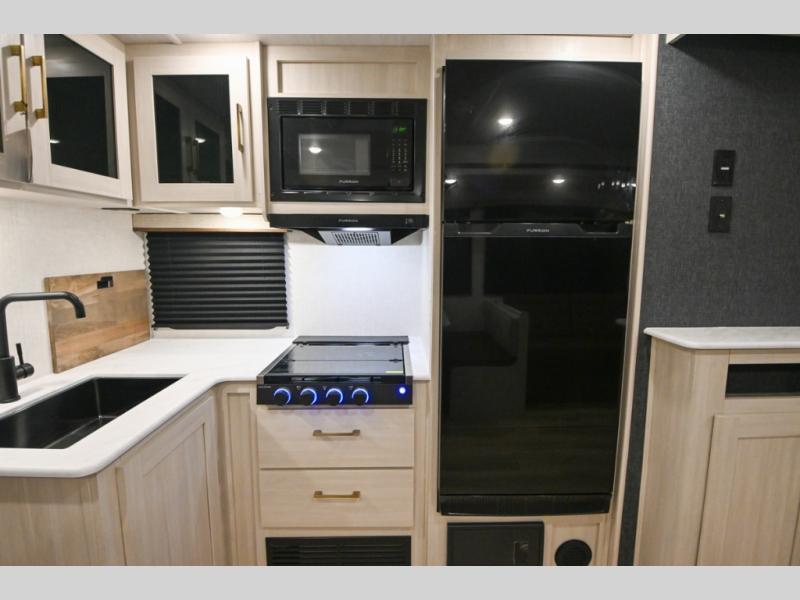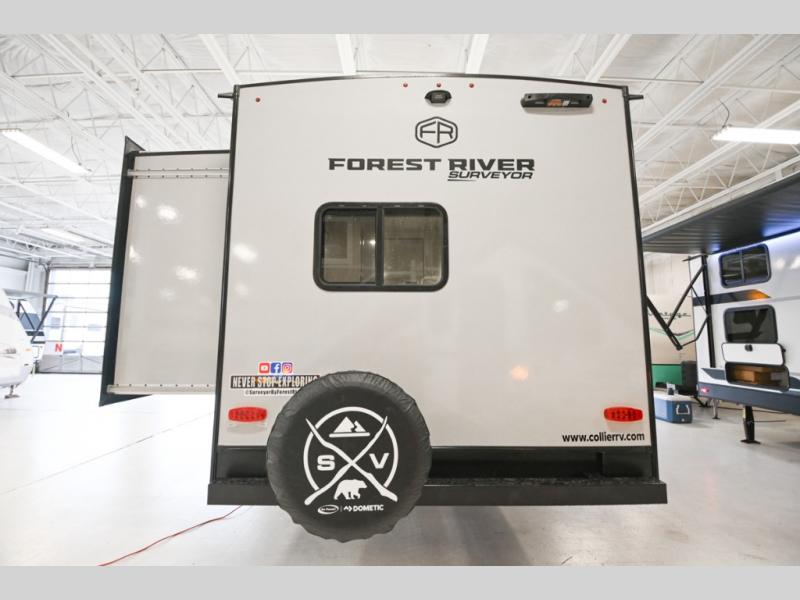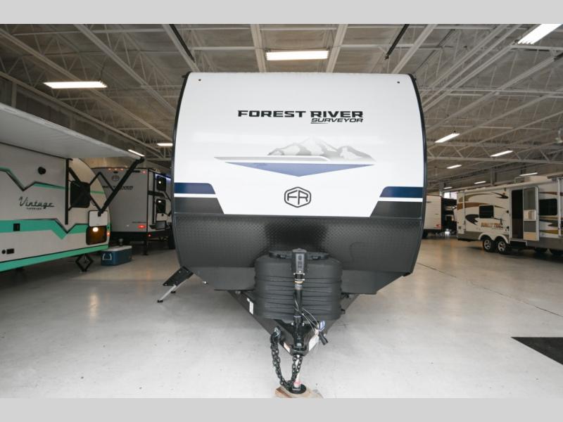 Value and versatility go hand-in-hand with the Surveyor Legend X travel trailers by Forest River. The solid construction includes a 2" aluminum framed floor with block foam insulation and a sealed underbelly with forced heat and radiant foil insulation. A 100-watt roof mounted solar panel will provide some off-grid power, and the power tongue jack will let you easily hitch up and go whenever you're ready. Additional stand-out features include Surf(X) seamless countertops throughout, two A/C units, an electric awning with LED light strip, black glass friction hinge entry door(s), and so much more!