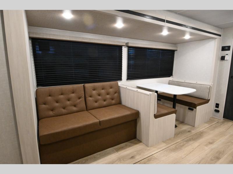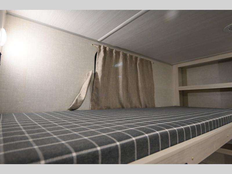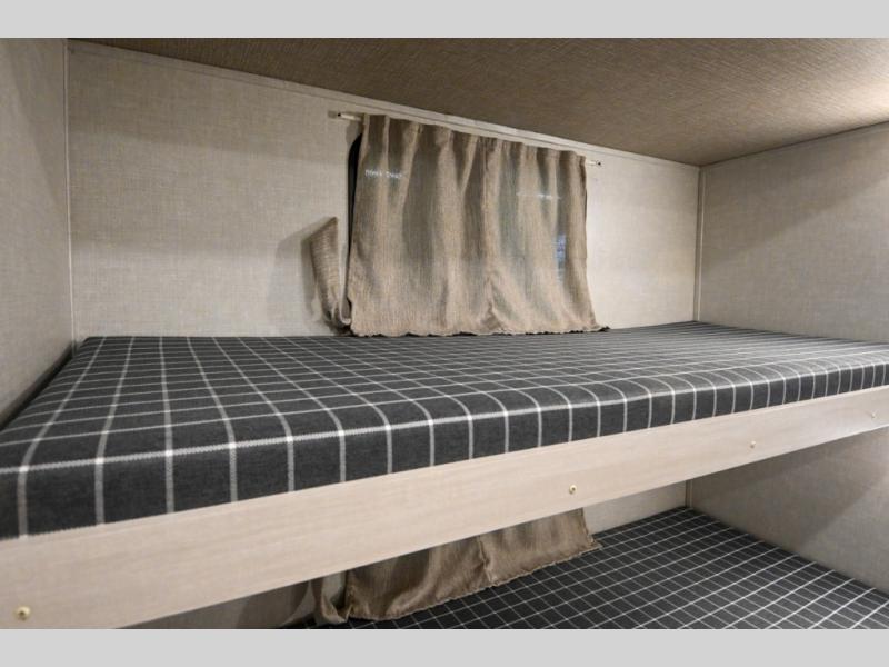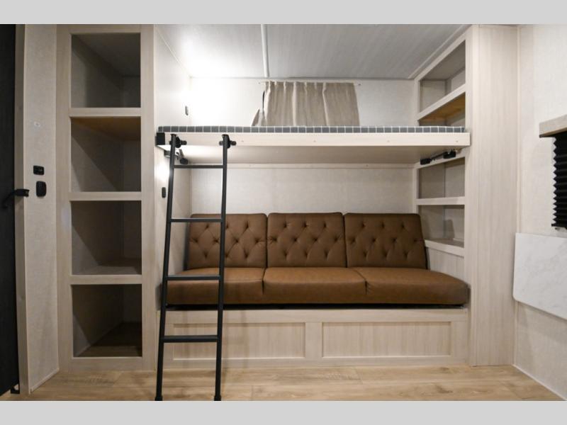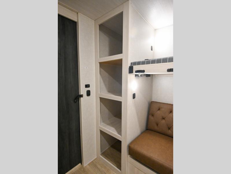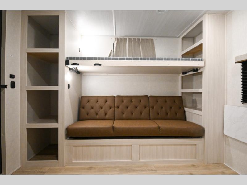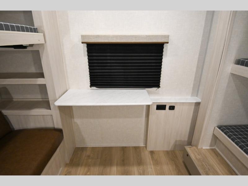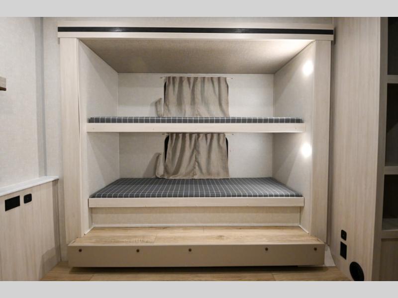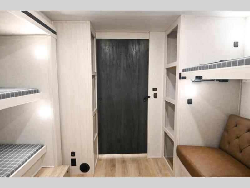 Head to your favorite camping spot with your favorite people in this spacious, dual entry travel trailer! The large slide out houses the booth dinette and sofa where you can relax in the evenings and even let guests sleep over who haven't claimed the triple bunks in the rear bunkhouse. There is also a bunkhouse sofa, two wardrobes, cubbies, and a flip-up desk if you need a space to work. A walk-thru bath is convenient for all, and the full kitchen lets you whip up your best meals in the microwave with an air fryer. There is also a walk-in pantry with washer and dryer prep if you choose to add those appliances. When it's time to call it a night, the front master bedroom with a queen bed will provide you with your own space to retreat to, and there are dual bedside wardrobes to keep your clothes organized.