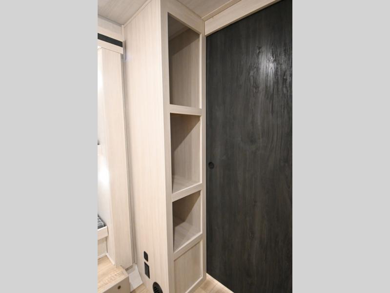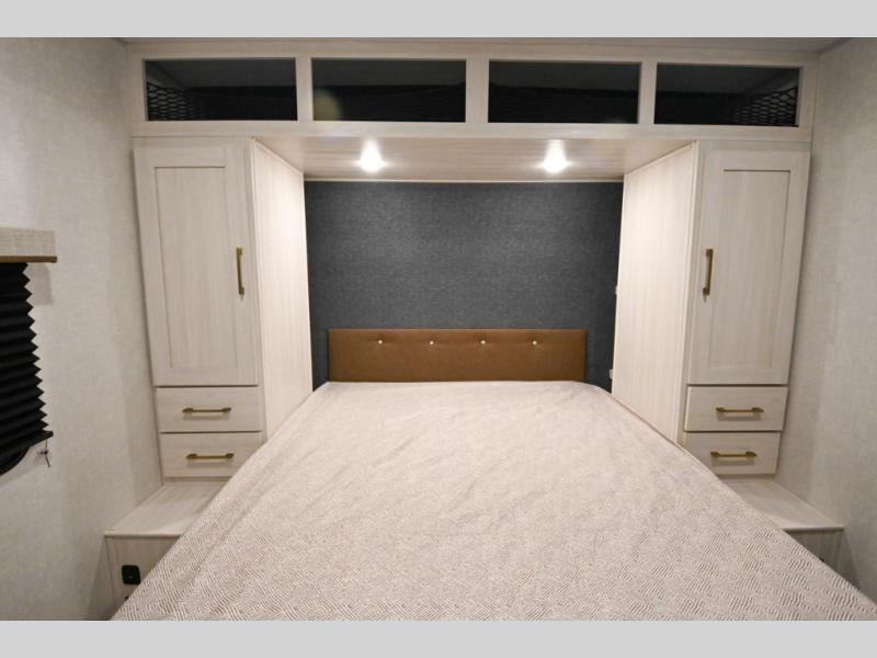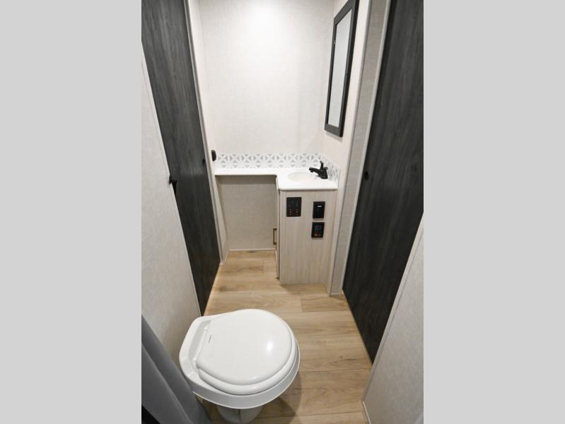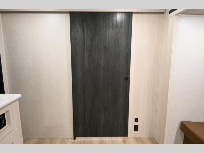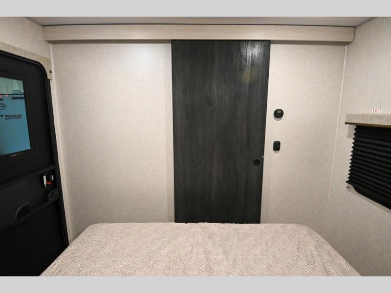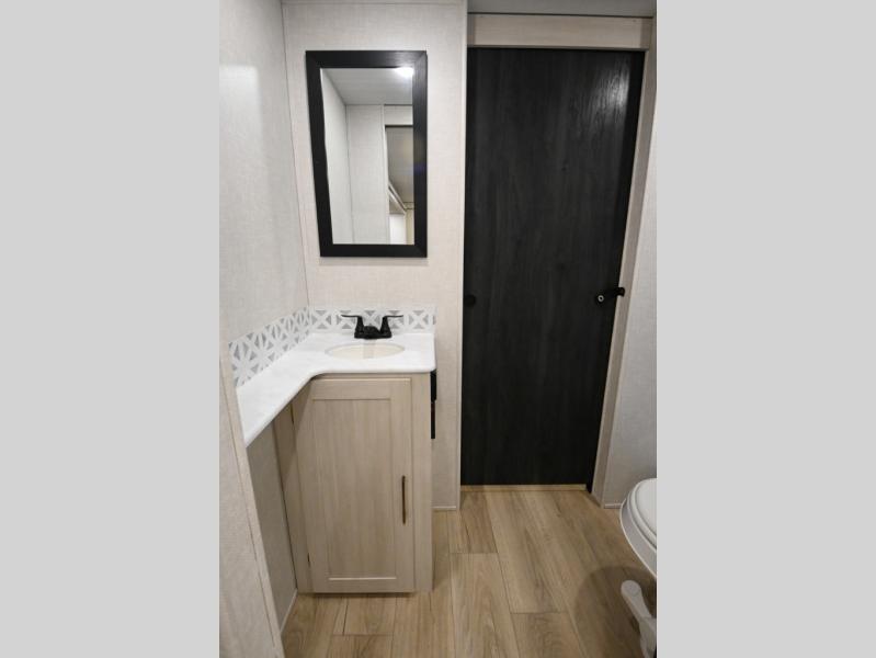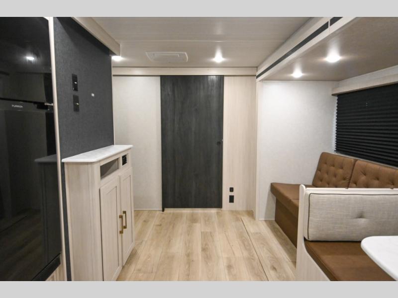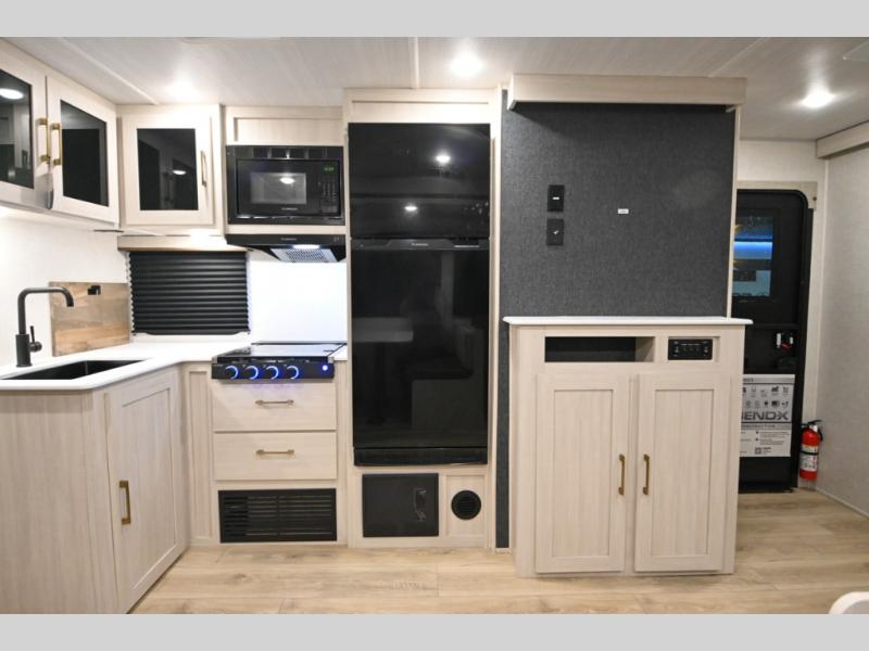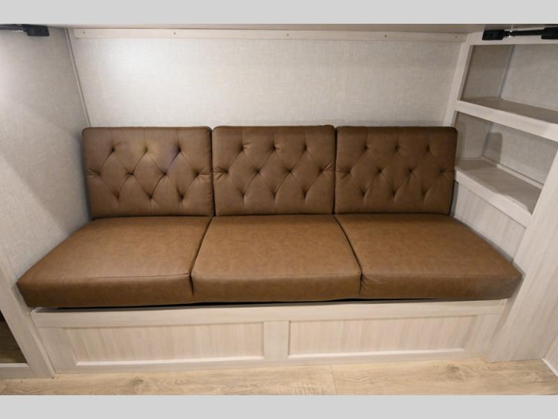 Head to your favorite camping spot with your favorite people in this spacious, dual entry travel trailer! The large slide out houses the booth dinette and sofa where you can relax in the evenings and even let guests sleep over who haven't claimed the triple bunks in the rear bunkhouse. There is also a bunkhouse sofa, two wardrobes, cubbies, and a flip-up desk if you need a space to work. A walk-thru bath is convenient for all, and the full kitchen lets you whip up your best meals in the microwave with an air fryer. There is also a walk-in pantry with washer and dryer prep if you choose to add those appliances. When it's time to call it a night, the front master bedroom with a queen bed will provide you with your own space to retreat to, and there are dual bedside wardrobes to keep your clothes organized.