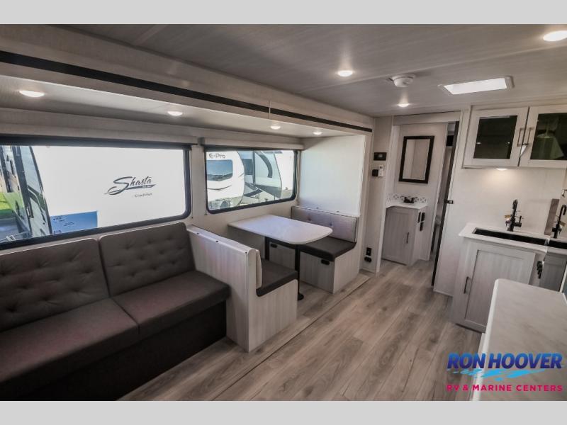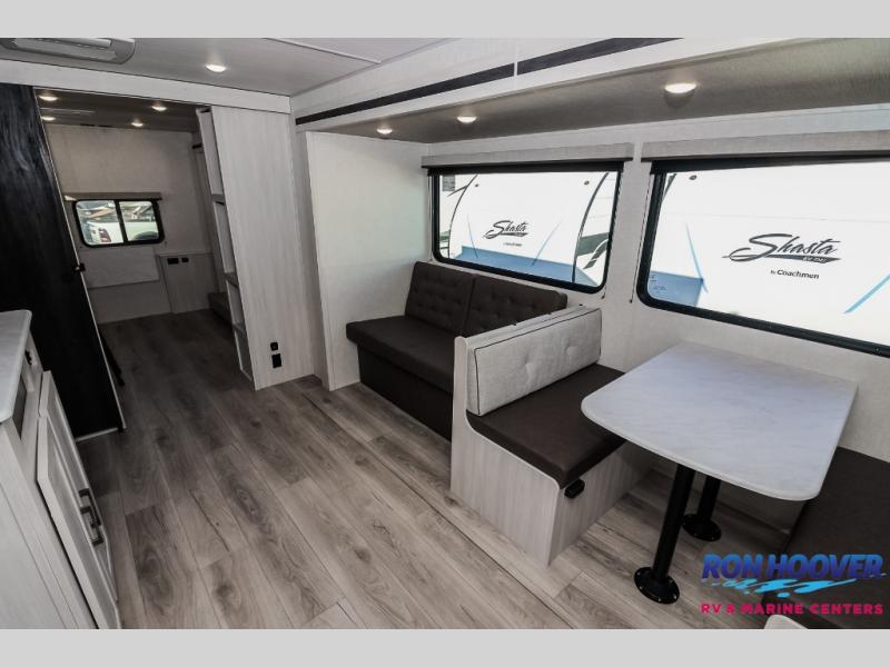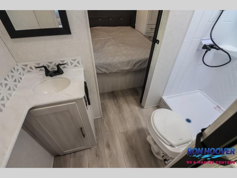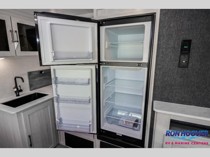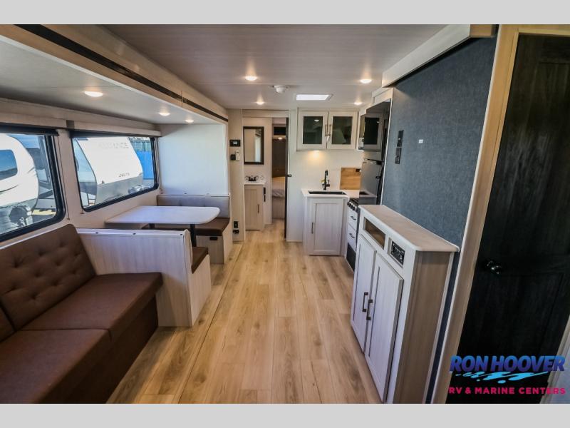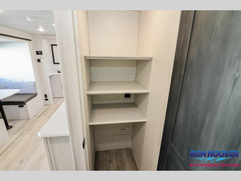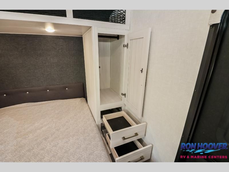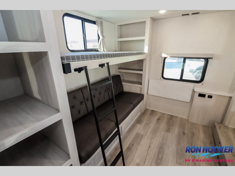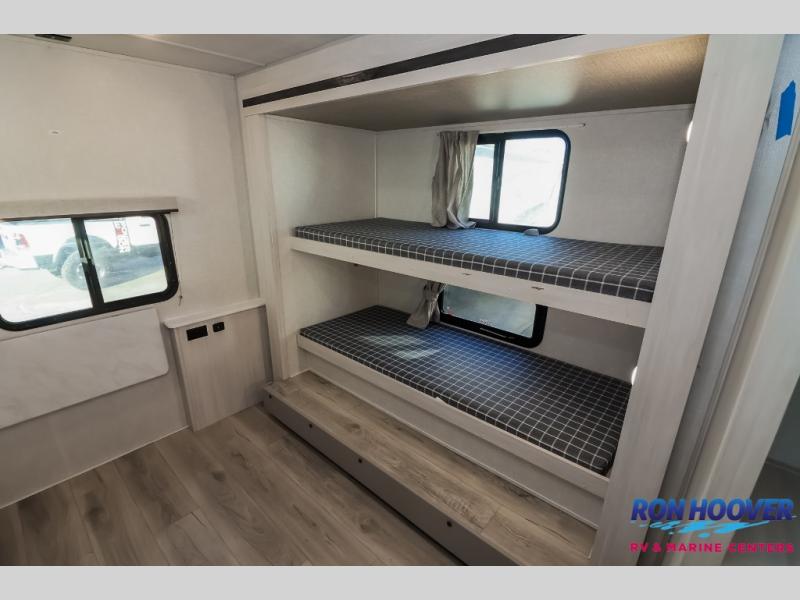 Head to your favorite camping spot with your favorite people in this spacious, dual entry travel trailer! The large slide out houses the booth dinette and sofa where you can relax in the evenings and even let guests sleep over who haven't claimed the triple bunks in the rear bunkhouse. There is also a bunkhouse sofa, two wardrobes, cubbies, and a flip-up desk if you need a space to work. A walk-thru bath is convenient for all, and the full kitchen lets you whip up your best meals in the microwave with an air fryer. There is also a walk-in pantry with washer and dryer prep if you choose to add those appliances. When it's time to call it a night, the front master bedroom with a queen bed will provide you with your own space to retreat to, and there are dual bedside wardrobes to keep your clothes organized.
