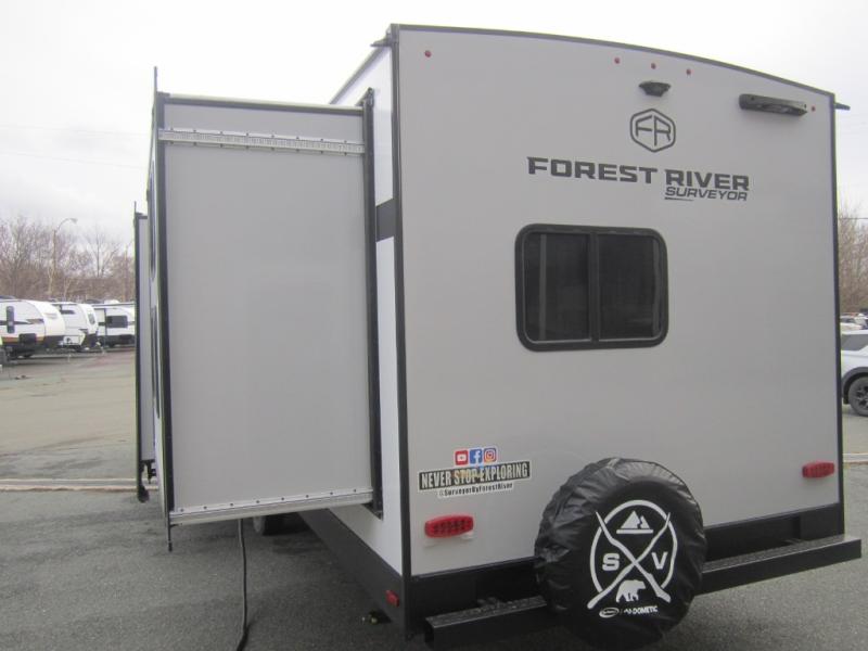 Value and versatility go hand-in-hand with the Surveyor Legend X travel trailers by Forest River. The solid construction includes a 2" aluminum framed floor with block foam insulation and a sealed underbelly with forced heat and radiant foil insulation. A 100-watt roof mounted solar panel will provide some off-grid power, and the power tongue jack will let you easily hitch up and go whenever you're ready. Additional stand-out features include Surf(X) seamless countertops throughout, two A/C units, an electric awning with LED light strip, black glass friction hinge entry door(s), and so much more!