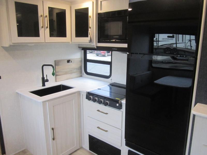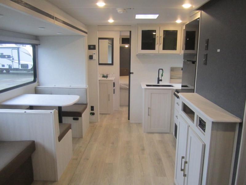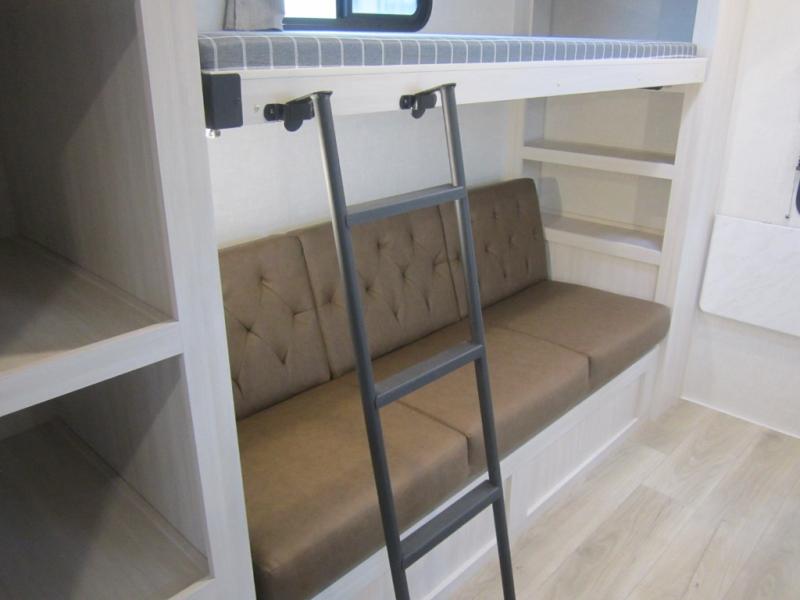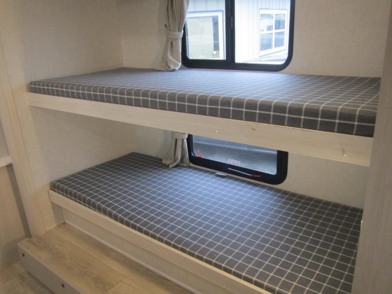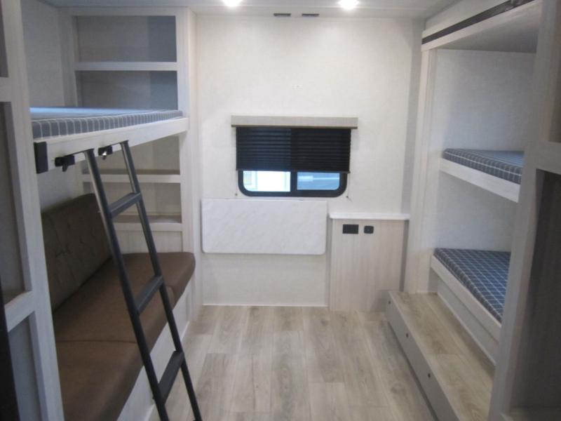 Head to your favorite camping spot with your favorite people in this spacious, dual entry travel trailer! The large slide out houses the booth dinette and sofa where you can relax in the evenings and even let guests sleep over who haven't claimed the triple bunks in the rear bunkhouse. There is also a bunkhouse sofa, two wardrobes, cubbies, and a flip-up desk if you need a space to work. A walk-thru bath is convenient for all, and the full kitchen lets you whip up your best meals in the microwave with an air fryer. There is also a walk-in pantry with washer and dryer prep if you choose to add those appliances. When it's time to call it a night, the front master bedroom with a queen bed will provide you with your own space to retreat to, and there are dual bedside wardrobes to keep your clothes organized.