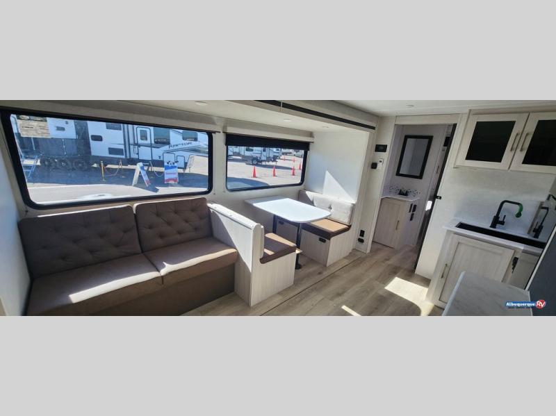 Value and versatility go hand-in-hand with the Surveyor Legend X travel trailers by Forest River. The solid construction includes a 2" aluminum framed floor with block foam insulation and a sealed underbelly with forced heat and radiant foil insulation. A 100-watt roof mounted solar panel will provide some off-grid power, and the power tongue jack will let you easily hitch up and go whenever you're ready. Additional stand-out features include Surf(X) seamless countertops throughout, two A/C units, an electric awning with LED light strip, black glass friction hinge entry door(s), and so much more!