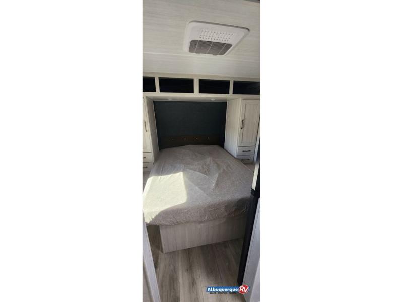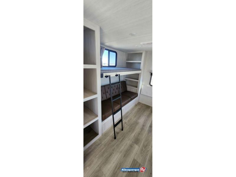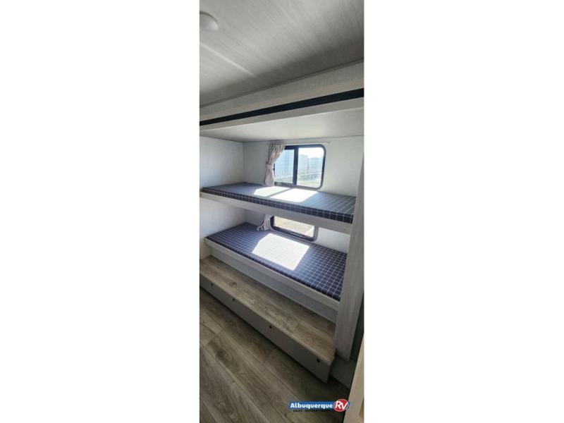 Head to your favorite camping spot with your favorite people in this spacious, dual entry travel trailer! The large slide out houses the booth dinette and sofa where you can relax in the evenings and even let guests sleep over who haven't claimed the triple bunks in the rear bunkhouse. There is also a bunkhouse sofa, two wardrobes, cubbies, and a flip-up desk if you need a space to work. A walk-thru bath is convenient for all, and the full kitchen lets you whip up your best meals in the microwave with an air fryer. There is also a walk-in pantry with washer and dryer prep if you choose to add those appliances. When it's time to call it a night, the front master bedroom with a queen bed will provide you with your own space to retreat to, and there are dual bedside wardrobes to keep your clothes organized.