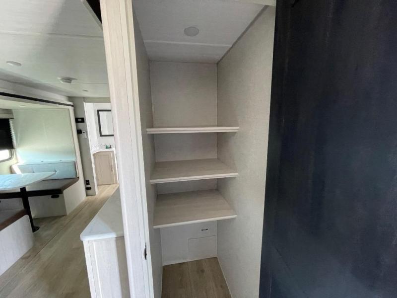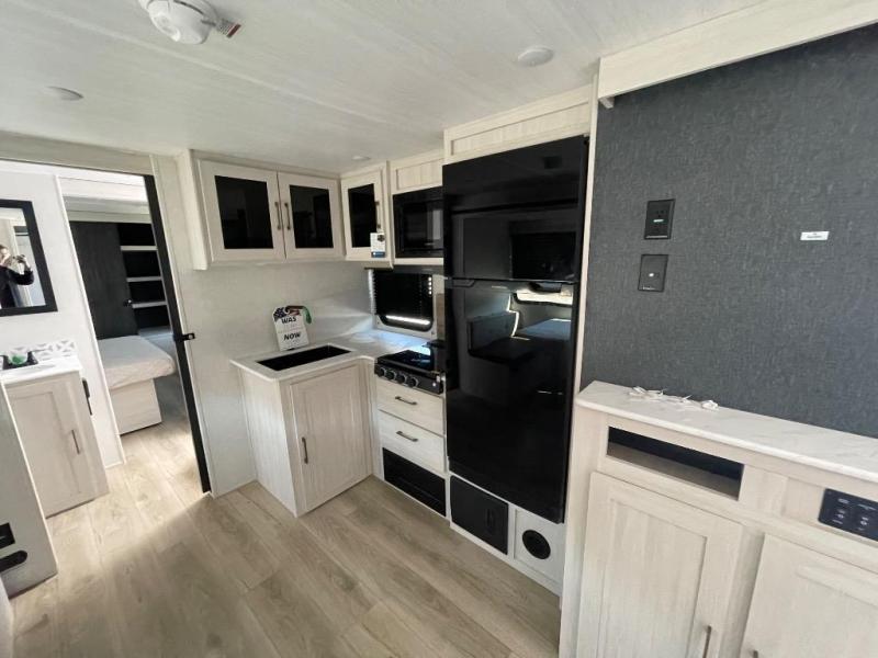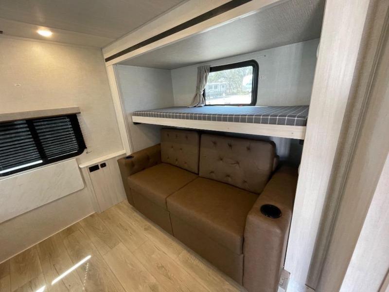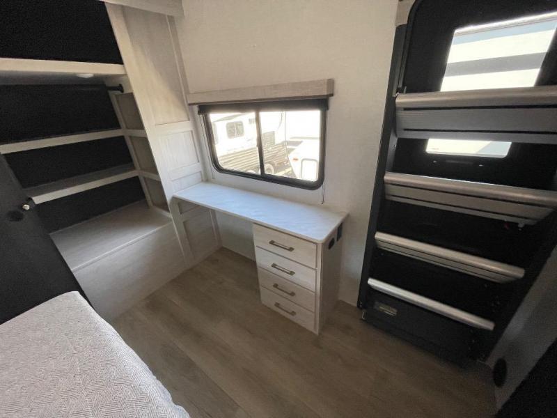 Experience the ultimate in family-friendly RV living with our spacious travel trailer. The rear bunk beds area is a kid's paradise, featuring three cozy bunk beds, while the trifold sofa provides additional sleeping space or a comfortable spot to relax. A convenient wardrobe and flip-up desk provide ample storage and a workspace. Moreover, the kitchen and living room are designed for comfort and functionality, with a sofa, dinette, and entertainment center perfect for family movie nights, the pantry keeps snacks and ingredients organized, and the refrigerator and microwave with an air fryer make meal prep easy and delicious. Additionally, the walk-through bathroom provides easy access, and the front bedroom is a serene retreat featuring a spacious queen-size bed, dresser/desk, and ample wardrobe space. On the exterior, two entry and exit doors provide convenient access, and the 19' awning offers shade and protection, perfect for creating lifelong memories.