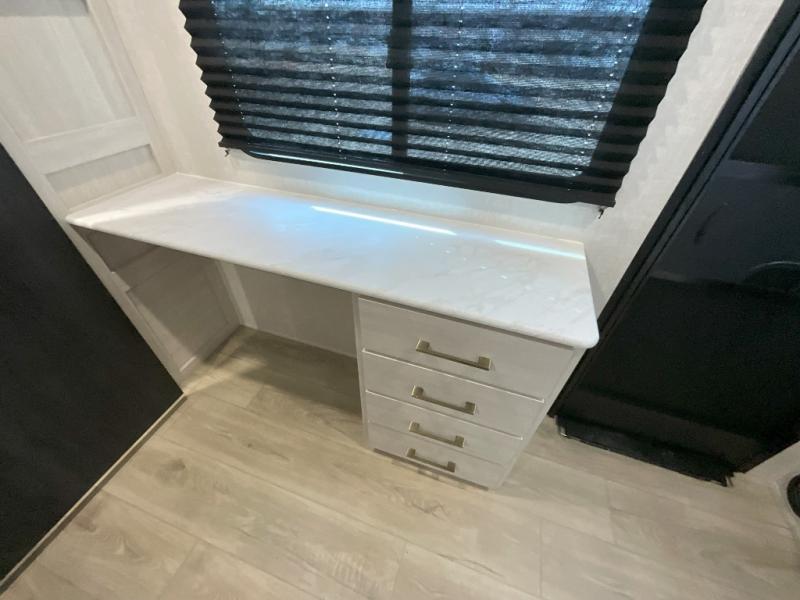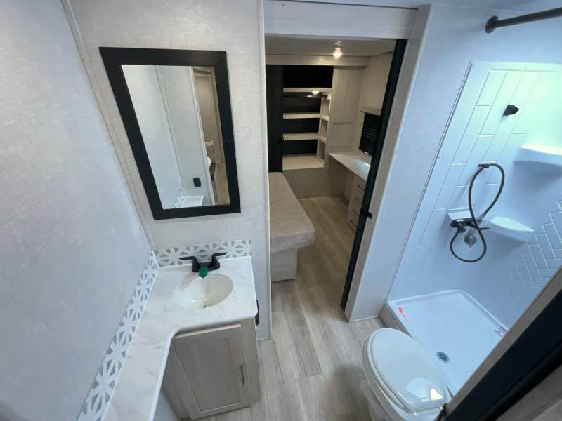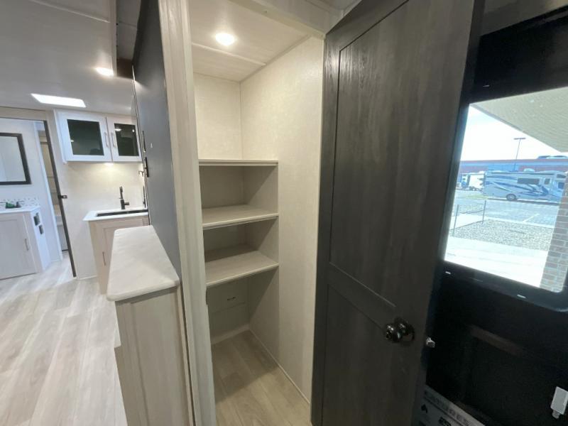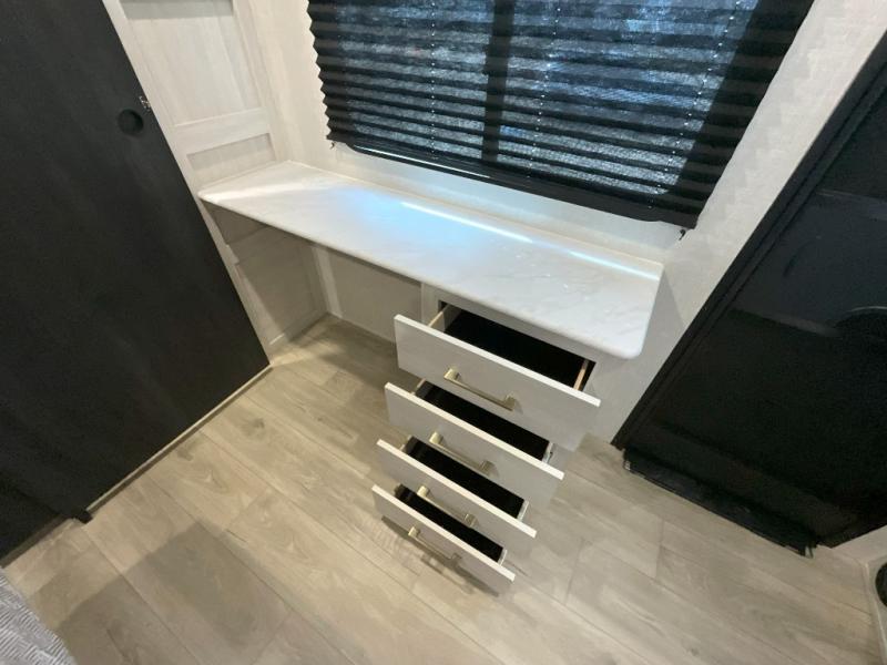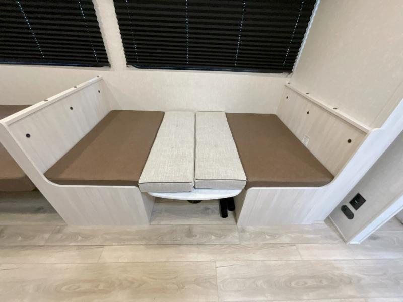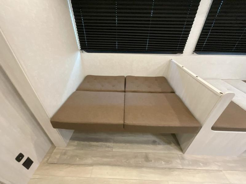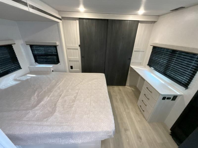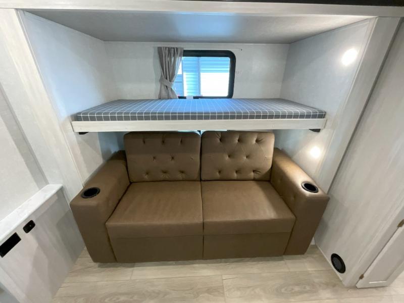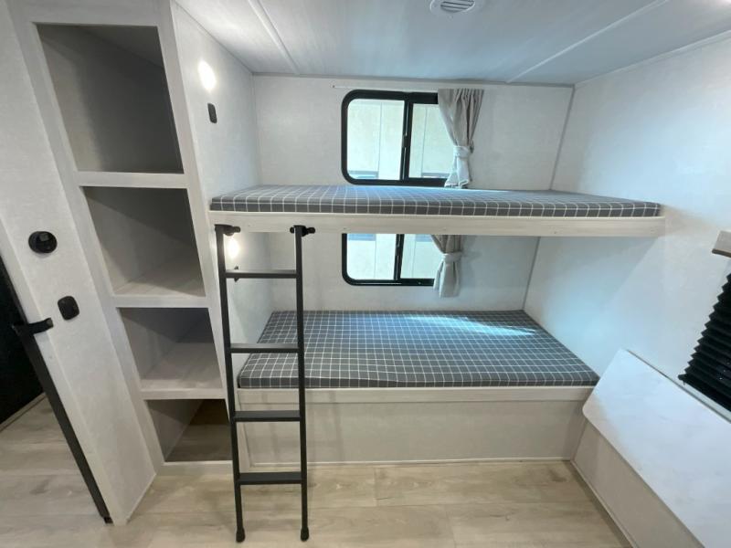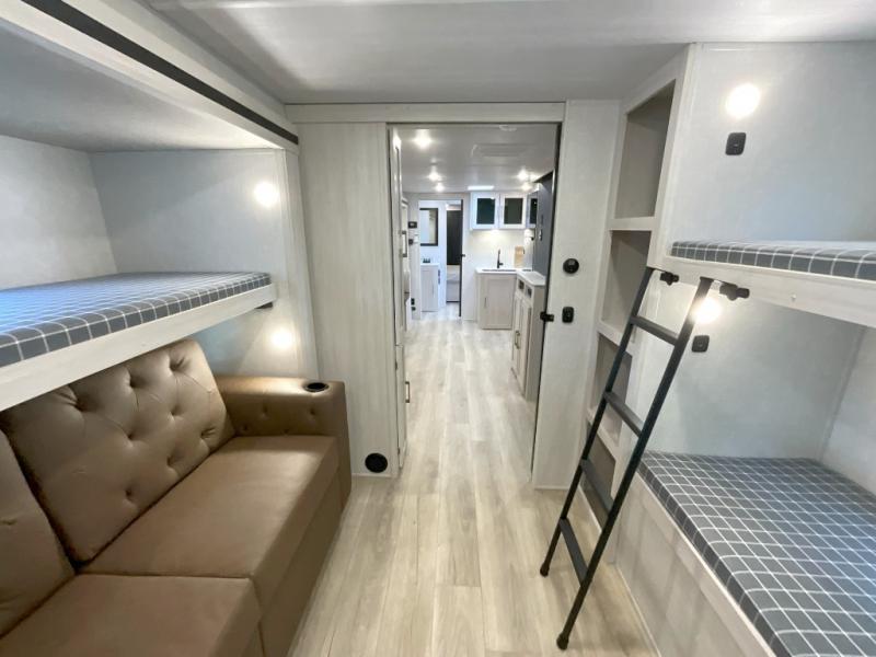 Experience the ultimate in family-friendly RV living with our spacious travel trailer. The rear bunk beds area is a kid's paradise, featuring three cozy bunk beds, while the trifold sofa provides additional sleeping space or a comfortable spot to relax. A convenient wardrobe and flip-up desk provide ample storage and a workspace. Moreover, the kitchen and living room are designed for comfort and functionality, with a sofa, dinette, and entertainment center perfect for family movie nights, the pantry keeps snacks and ingredients organized, and the refrigerator and microwave with an air fryer make meal prep easy and delicious. Additionally, the walk-through bathroom provides easy access, and the front bedroom is a serene retreat featuring a spacious queen-size bed, dresser/desk, and ample wardrobe space. On the exterior, two entry and exit doors provide convenient access, and the 19' awning offers shade and protection, perfect for creating lifelong memories.