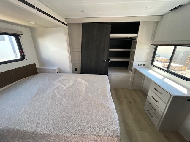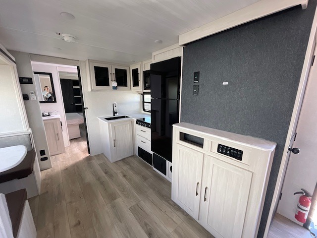 Experience the ultimate in family-friendly RV living with our spacious travel trailer. The rear bunk beds area is a kid's paradise, featuring three cozy bunk beds, while the trifold sofa provides additional sleeping space or a comfortable spot to relax. A convenient wardrobe and flip-up desk provide ample storage and a workspace. Moreover, the kitchen and living room are designed for comfort and functionality, with a sofa, dinette, and entertainment center perfect for family movie nights, the pantry keeps snacks and ingredients organized, and the refrigerator and microwave with an air fryer make meal prep easy and delicious. Additionally, the walk-through bathroom provides easy access, and the front bedroom is a serene retreat featuring a spacious queen-size bed, dresser/desk, and ample wardrobe space. On the exterior, two entry and exit doors provide convenient access, and the 19' awning offers shade and protection, perfect for creating lifelong memories.