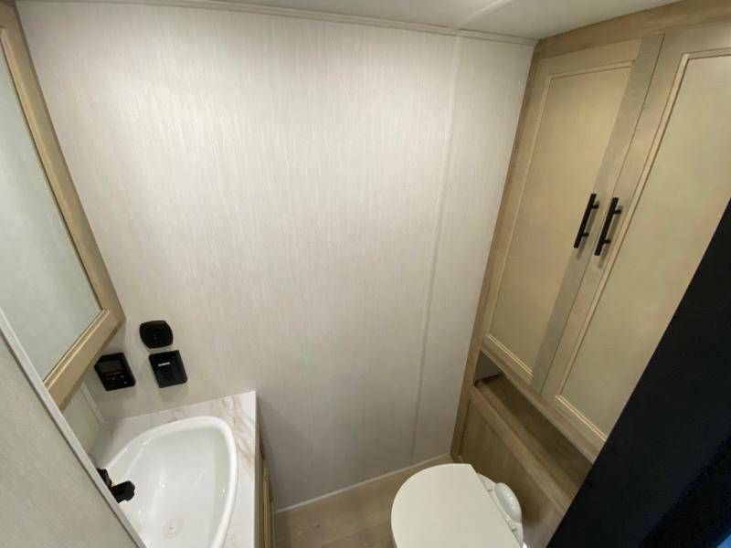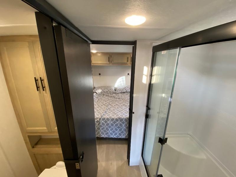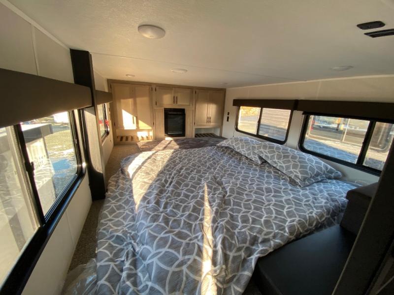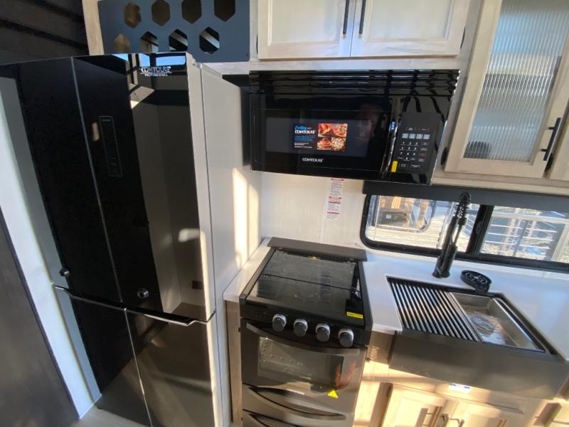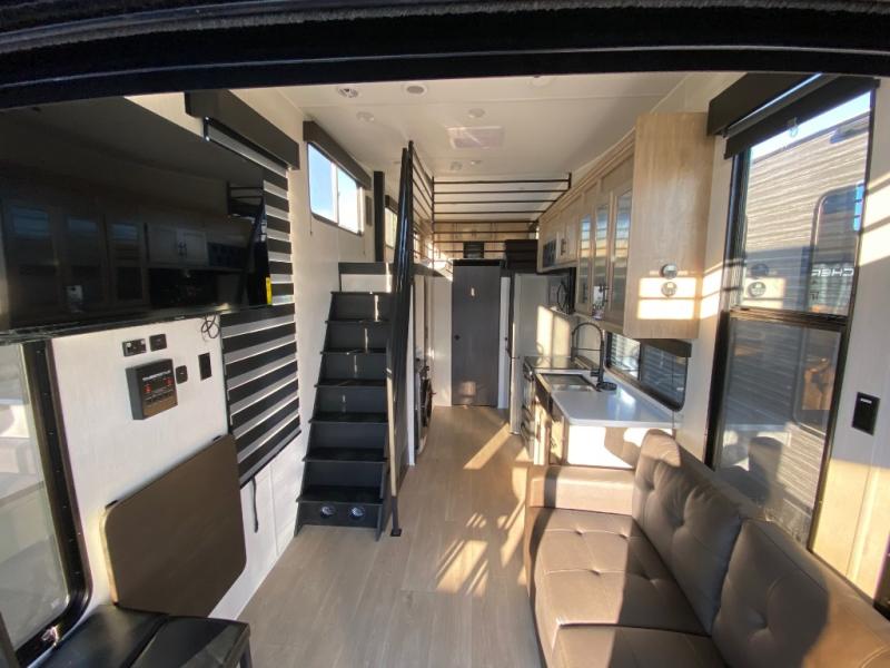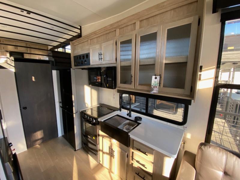 Inside, you’ll find a layout designed to impress: a luxurious king-sized lower bed, a queen plus bunk mattress up in the loft, and a sofa that doubles as extra sleeping space—so you’re prepared for up to eight guests or family members. The kitchen makes cooking on the road a pleasure, featuring a full-size fridge (~18 cu ft), a 3-burner cooktop, and high-end touches like a dishwasher and residential-style sink (with the “Limited Package” upgrades).Meanwhile, the bathroom is generous, the on-demand tankless water heater ensures hot water on command, and the dual-loft plus covered deck off the rear adds extra flair and living space.
