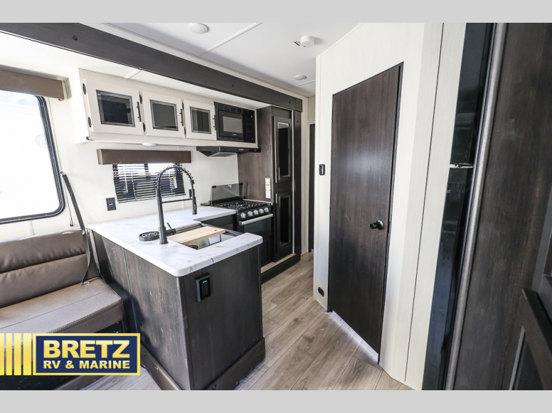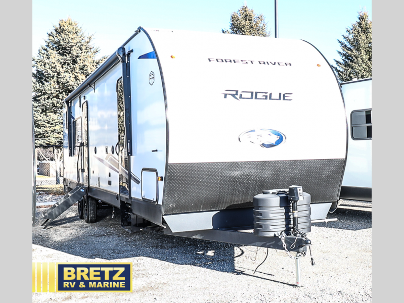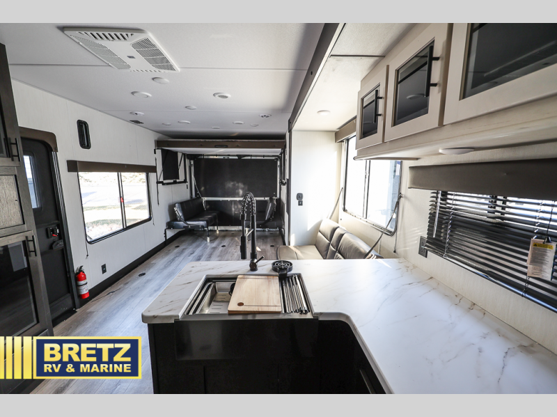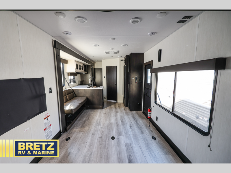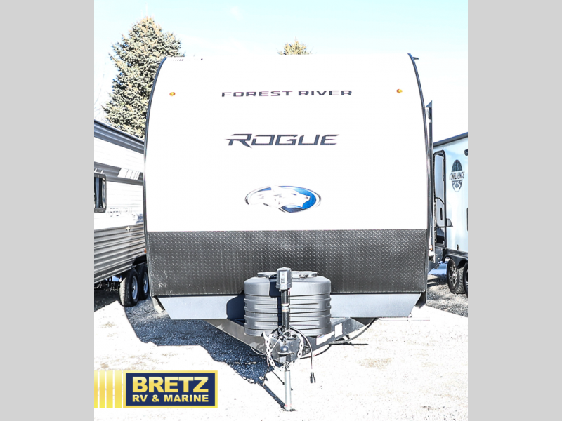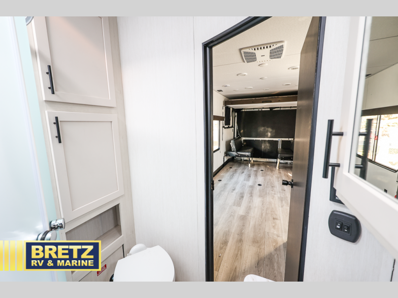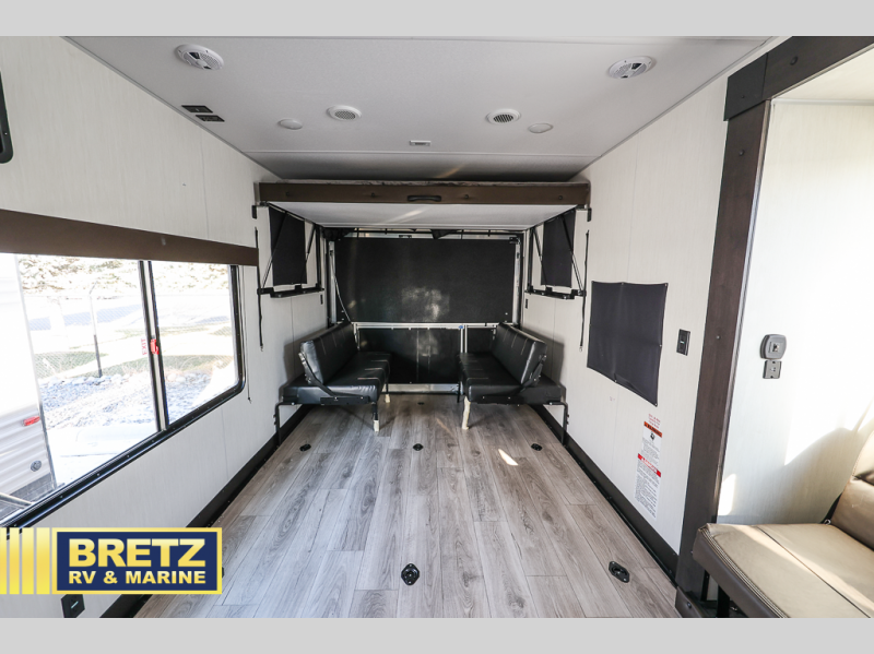 You're going to love this spacious toy hauler with a kitchen slide out! There is a 10' 6" garage with 15' 10" total garage space if you include the main living area where the flip-up sofa and optional lounge chairs are. Once your toys are unloaded, your crew can relax on the roll-over sofas, and at night they can sleep on the quick set queen bed system. You will enjoy the front master bedroom with a Rogue king bed, dual wardrobes, and a private entrance into the dual entry bath!
