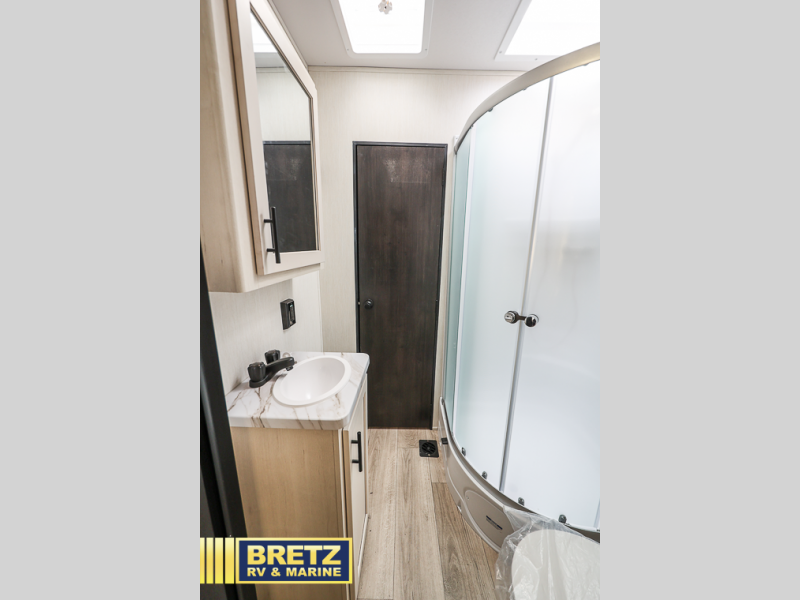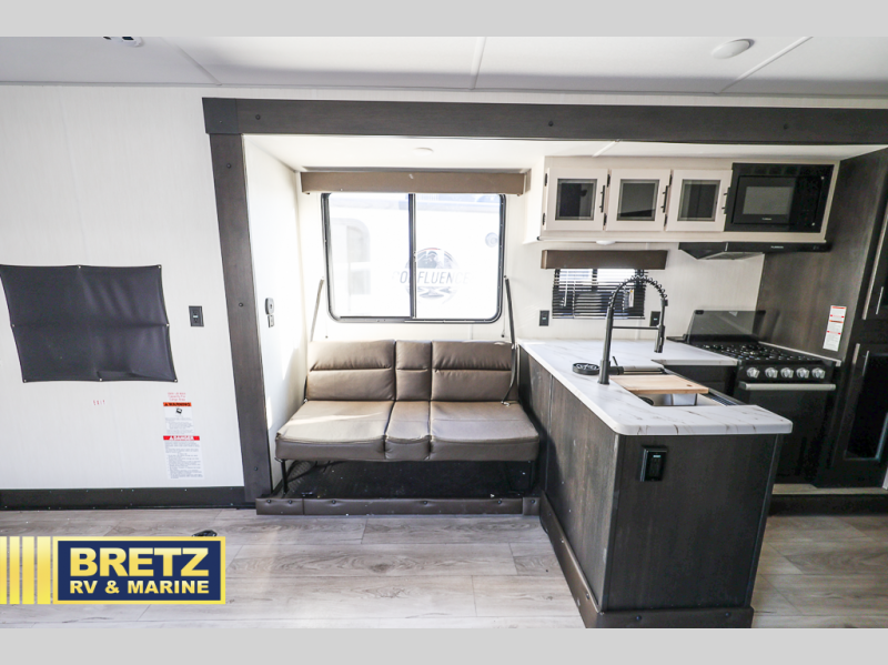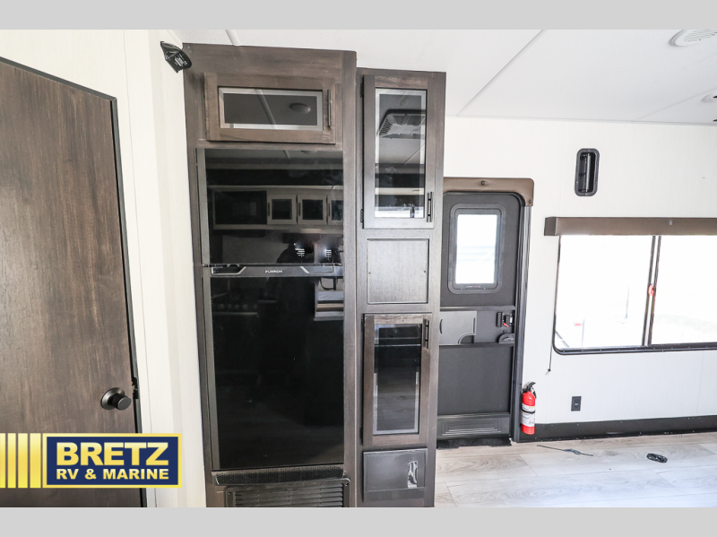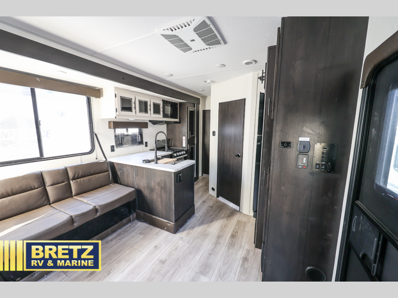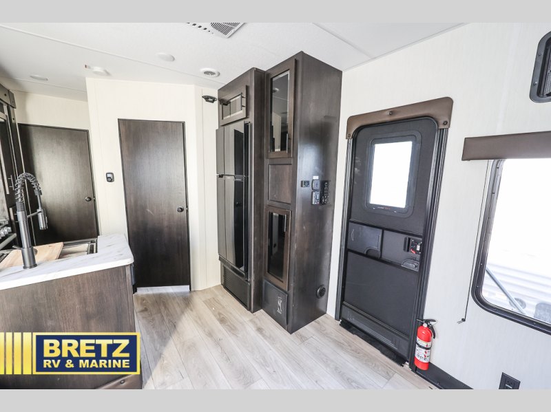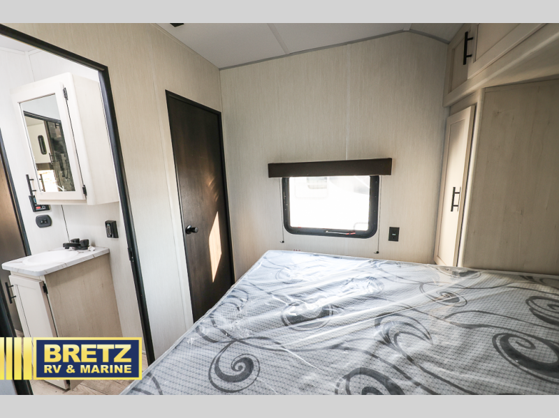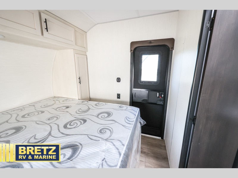 You're going to love this spacious toy hauler with a kitchen slide out! There is a 10' 6" garage with 15' 10" total garage space if you include the main living area where the flip-up sofa and optional lounge chairs are. Once your toys are unloaded, your crew can relax on the roll-over sofas, and at night they can sleep on the quick set queen bed system. You will enjoy the front master bedroom with a Rogue king bed, dual wardrobes, and a private entrance into the dual entry bath!
