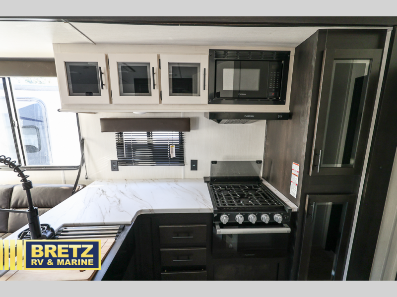 With any Vengeance Rouge SUT toy hauler travel trailer or fifth wheel by Forest River you can bring along your favorite ride-on toys, while still enjoying at-home comforts. Each one is built with a seamless roofing membrane with heat reflectivity and an armored underbelly tank enclosure for added strength and durability, and the 8' 6" wide body construction means you can bring along your favorite ride-on toys. Inside, you'll find a 1000 watt microwave and a three burner cooktop with an oven, seamless countertops, plus zebra shades that filters light and are blackout capable. These toy haulers also include 12V heat pads on all the holding tanks, a 15,000 BTU A/C unit, and many more amenities to make camping easier than ever.