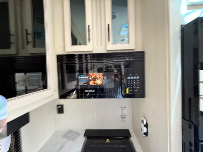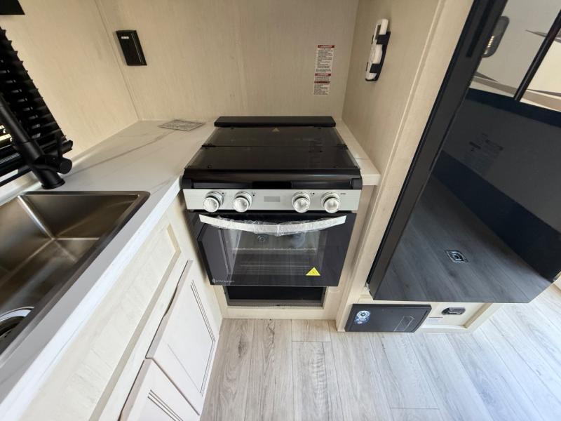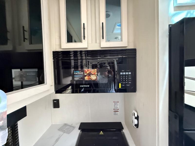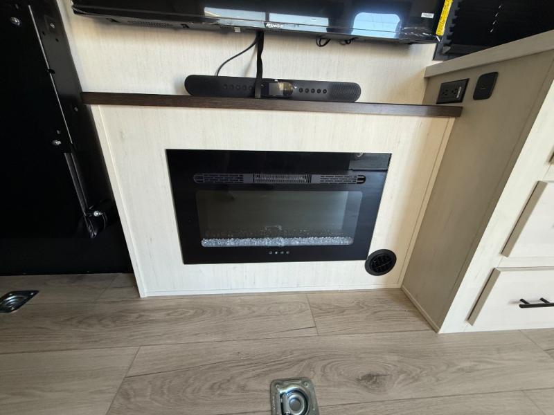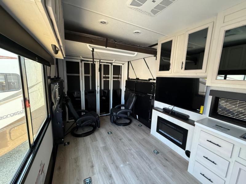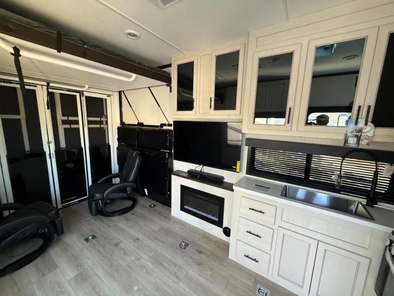 Head for the trails with this toy hauler in tow! Once your toys are unloaded from the 14' 1" garage, you can relax on the dual flip-up sofas with a queen bed above. There are also dual lounge chairs across from the entertainment center with a cozy fireplace and a hidden pantry behind for movies, games and more! The chef of your crew can make meals inside on the three burner cooktop, or head outdoors to utilize the outside kitchen. When you're ready to call it a night, retreat to the front private bedroom for a great night's rest on the trailer king bed slide out. There is also a large dresser here to keep your things organized.