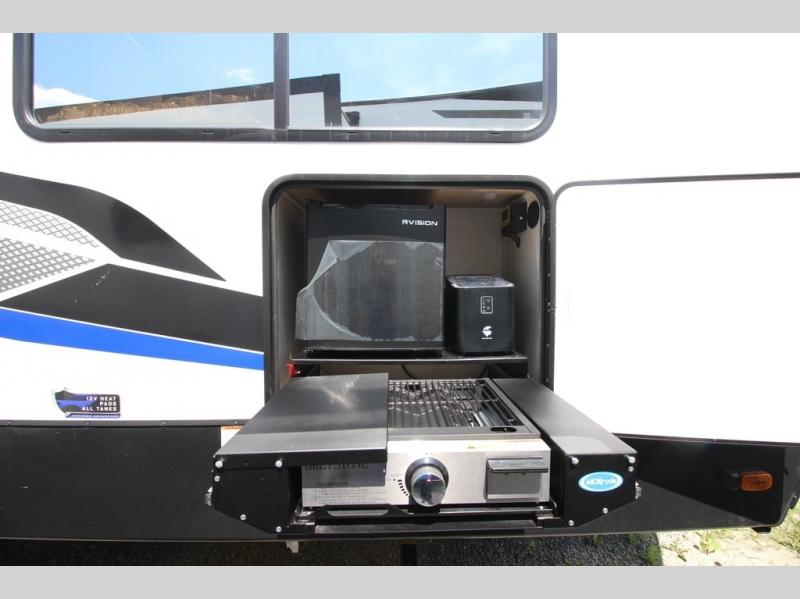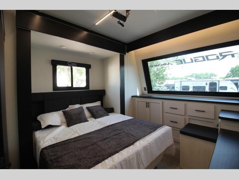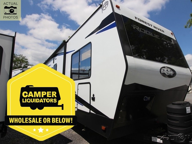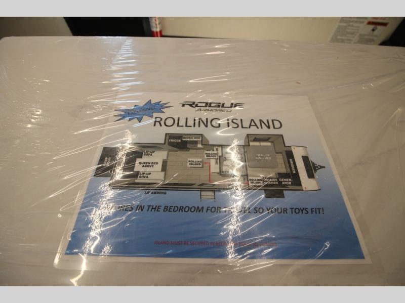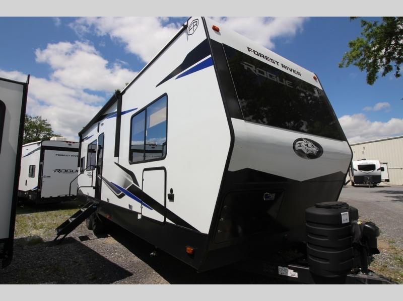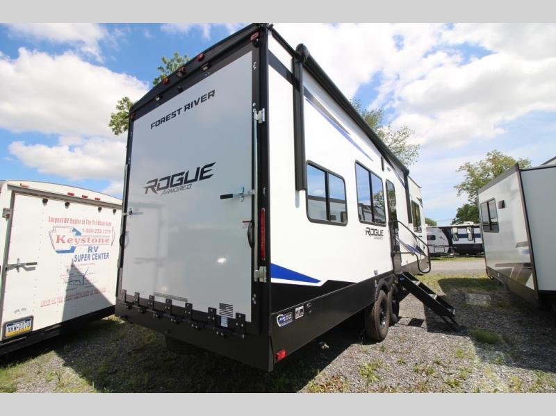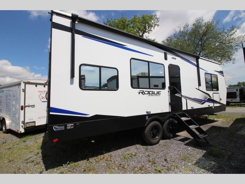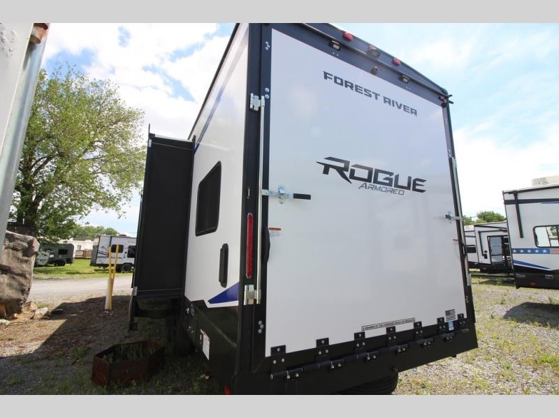 Every one of these Forest River Vengeance Rogue Armored travel trailer toy haulers come with the features you want most at an affordable price tag! The DuraPoxy gas/oil resistant floor has 5,000 lb. tie downs to ensure your toys will arrive safely without damaging the flooring, plus the 3,000 lb. rated ramp door makes it easy to load them. A 15,000 BTU A/C will keep you cool even on the hottest summer days, and an Armored underbelly keeps your unit's vitals protected all year long. The Rogue Ready package comes a fuel station with a pump, a ramp door patio system, a TST tire pressure monitoring system, and many more stand-out features. And don't overlook the Rogue Premium Package with an 8' weatherproof ramp door, an exterior TV hookup for the option to add a television, blue accent wheels, and solar reflective safety glass windows to name a few conveniences.