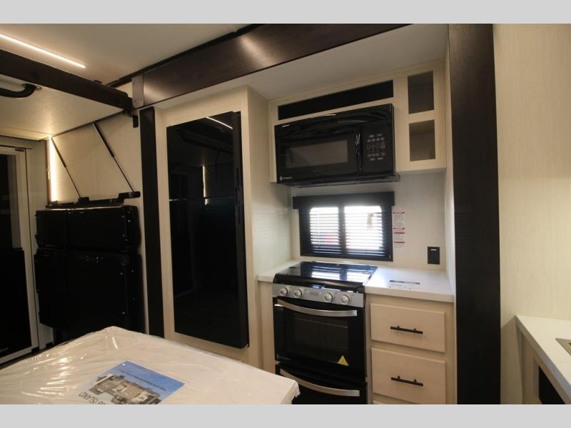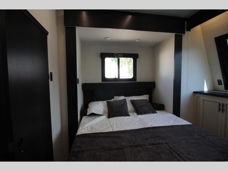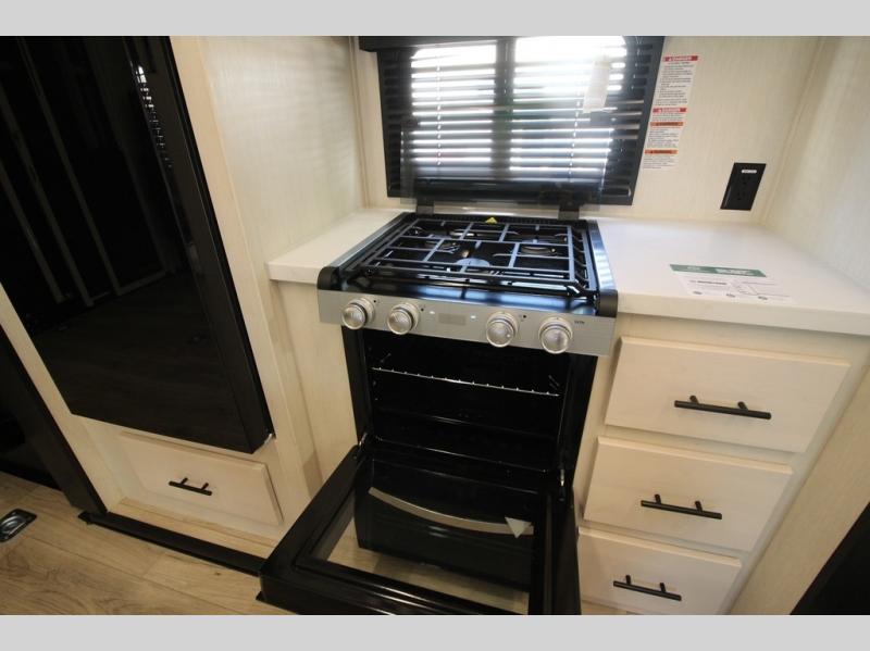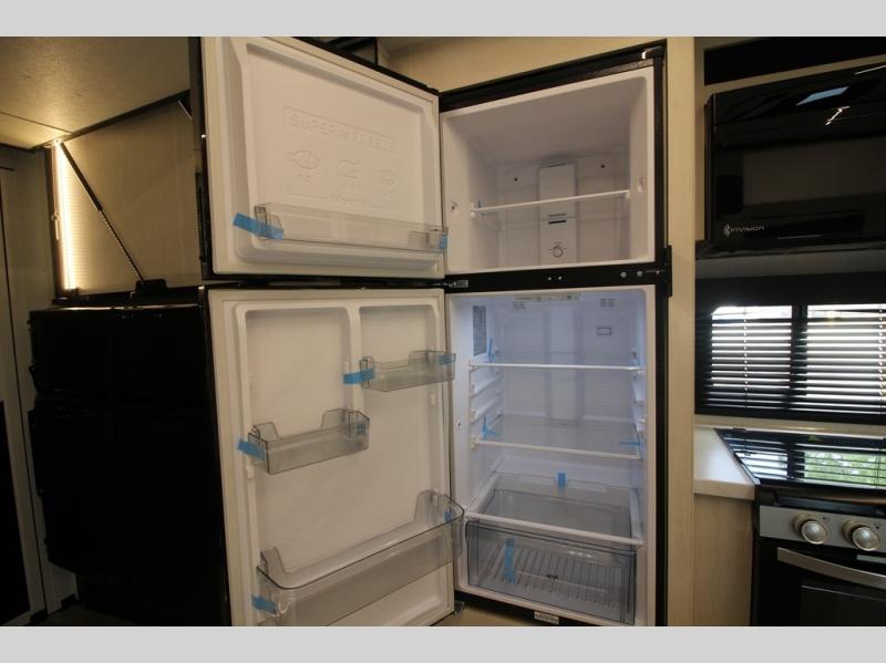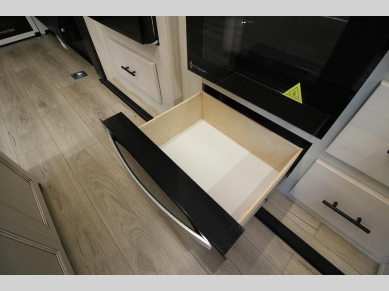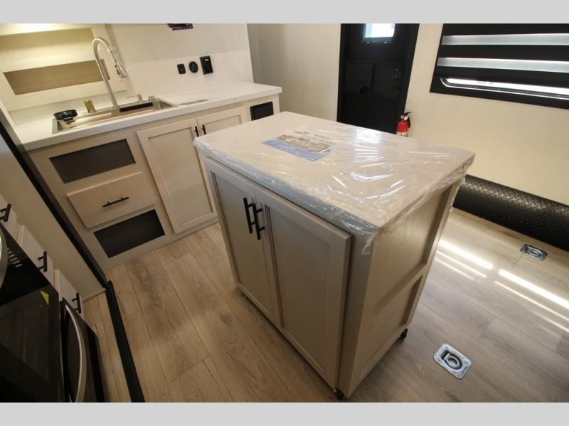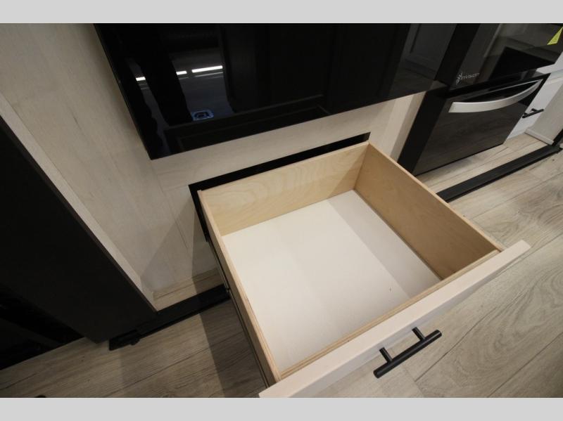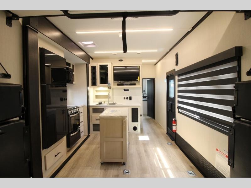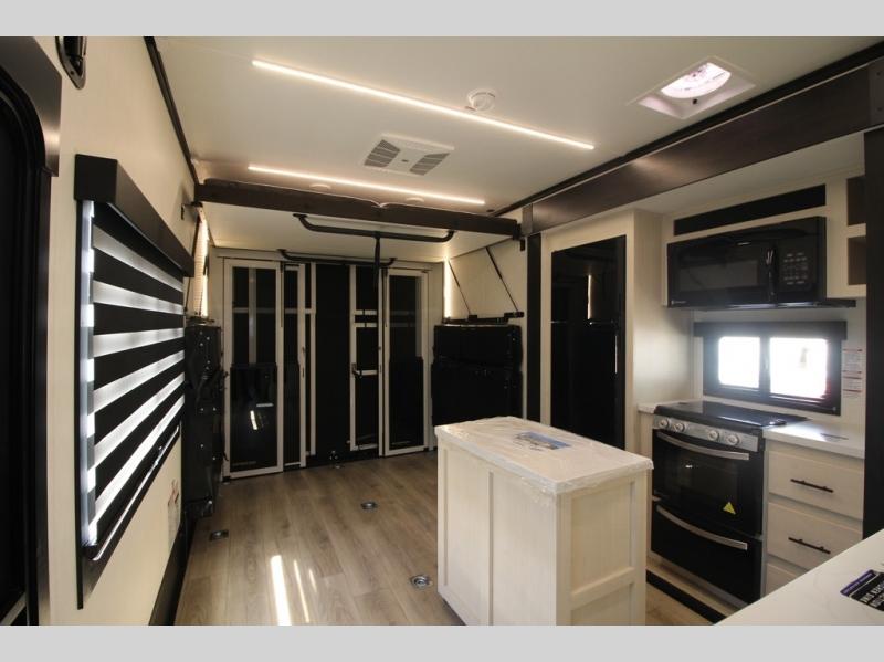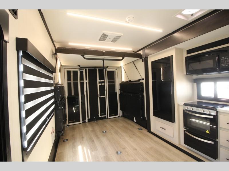 This double slide out toy hauler is ready for adventure when you are! Once your toys are unloaded using the ramp door, you can set up the flip-up sofas or set up the drop-down queen bed for guests to sleep on. You'll enjoy the front private bedroom all to yourselves that includes a king bed slide and a large dresser to keep your things organized. A three burner range and 30" microwave will let you make meals each day, and the 10.7 cu. ft. 12V refrigerator will keep your food stored away.