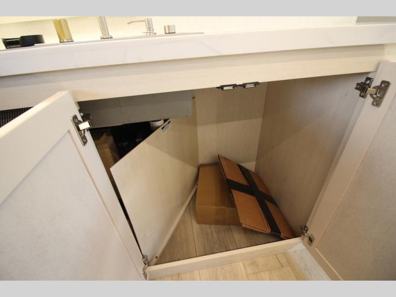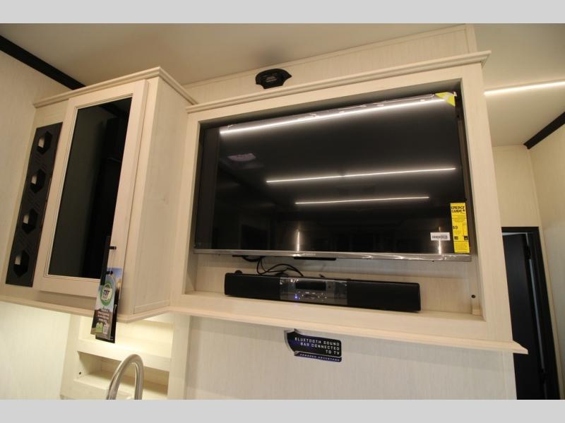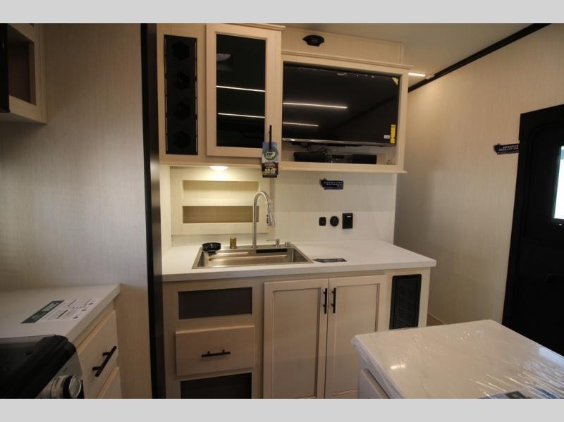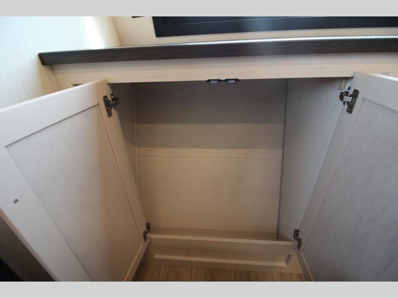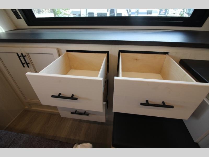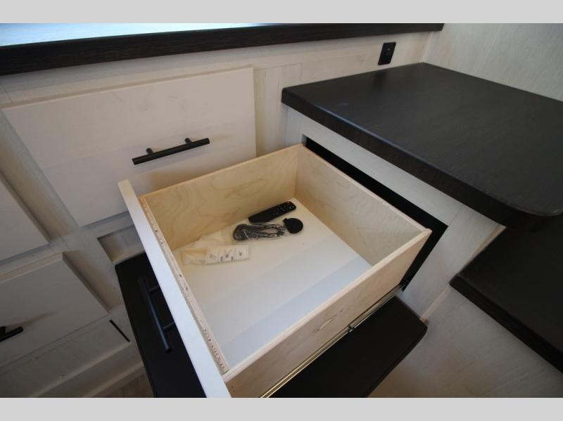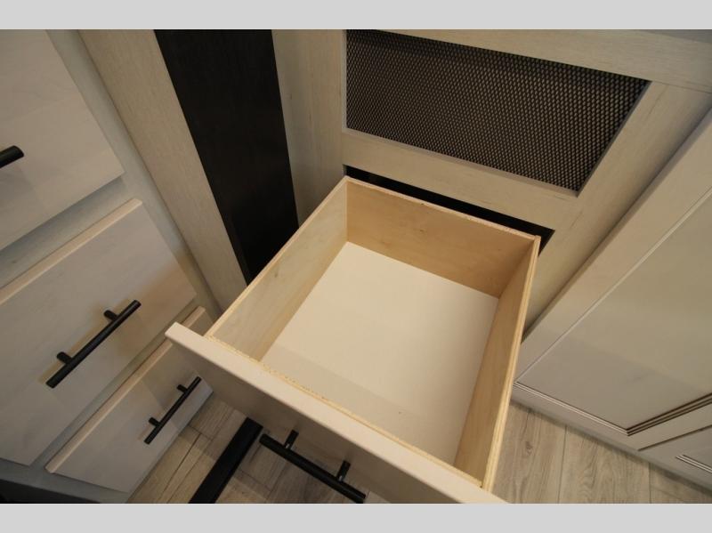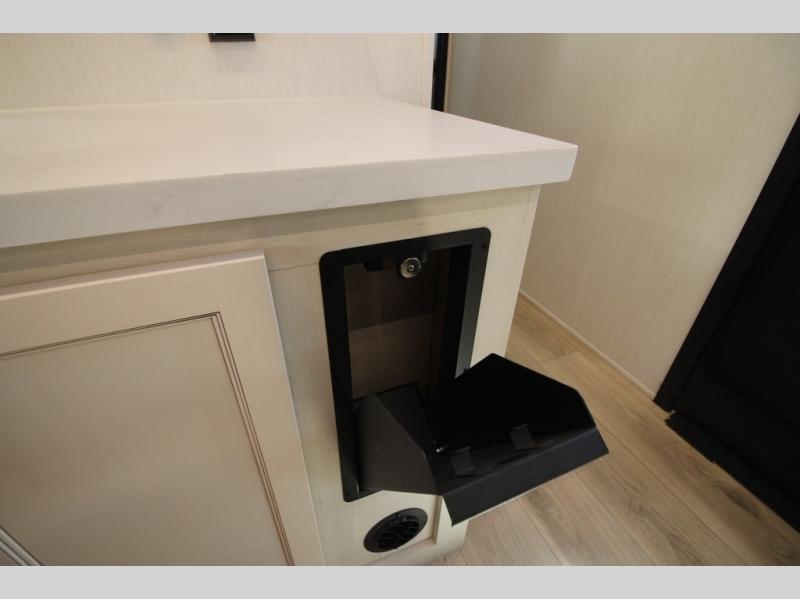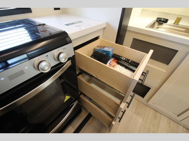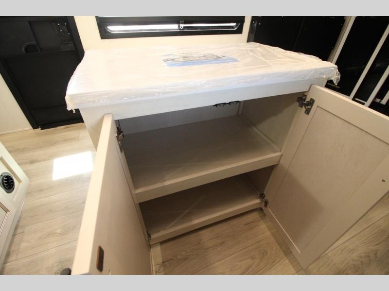 This double slide out toy hauler is ready for adventure when you are! Once your toys are unloaded using the ramp door, you can set up the flip-up sofas or set up the drop-down queen bed for guests to sleep on. You'll enjoy the front private bedroom all to yourselves that includes a king bed slide and a large dresser to keep your things organized. A three burner range and 30" microwave will let you make meals each day, and the 10.7 cu. ft. 12V refrigerator will keep your food stored away.