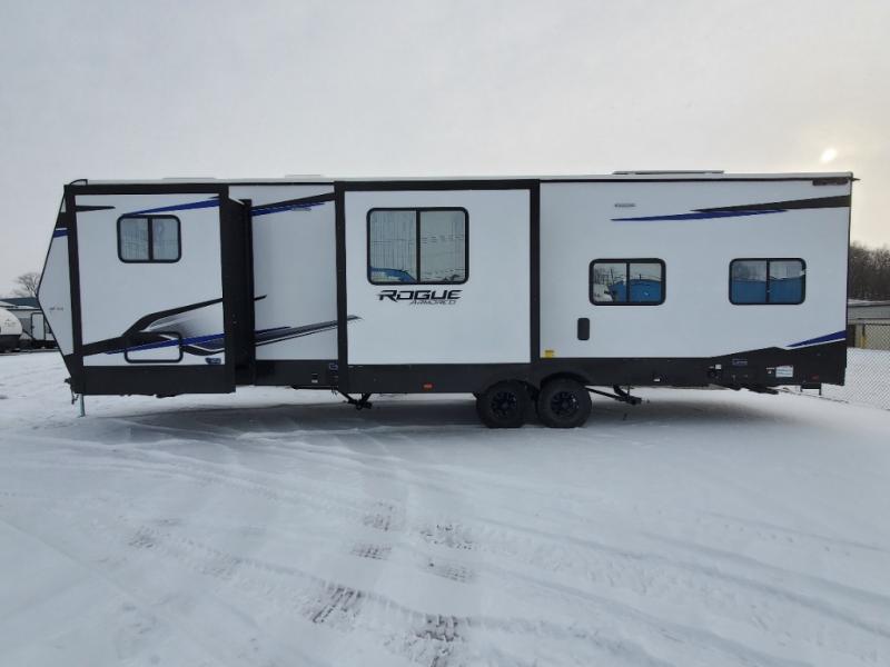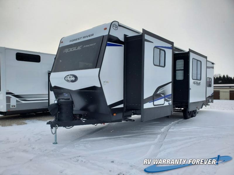 Every one of these Forest River Vengeance Rogue Armored travel trailer toy haulers come with the features you want most at an affordable price tag! The DuraPoxy gas/oil resistant floor has 5,000 lb. tie downs to ensure your toys will arrive safely without damaging the flooring, plus the 3,000 lb. rated ramp door makes it easy to load them. A 15,000 BTU A/C will keep you cool even on the hottest summer days, and an Armored underbelly keeps your unit's vitals protected all year long. The Rogue Ready package comes a fuel station with a pump, a ramp door patio system, a TST tire pressure monitoring system, and many more stand-out features. And don't overlook the Rogue Premium Package with an 8' weatherproof ramp door, an exterior TV hookup for the option to add a television, blue accent wheels, and solar reflective safety glass windows to name a few conveniences.