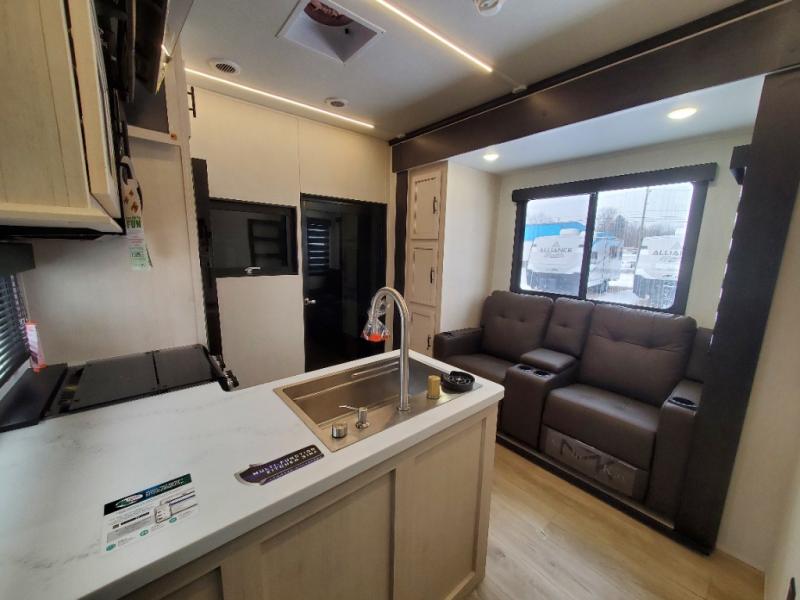 This double slide out toy hauler is ready for adventure when you are! Once your toys are unloaded from the separate garage, you can set up the flip-up sofas or set up the drop-down queen bed for guests to sleep on, and there is even a half bath here for added convenience. You'll enjoy the front private bedroom all to yourselves that includes a king bed slide and a large dresser to keep your things organized. The combined kitchen and living area includes a three burner range and 30" microwave to make meals, a sofa with recliners to relax on, plus a 12V refrigerator and pantry for food storage.