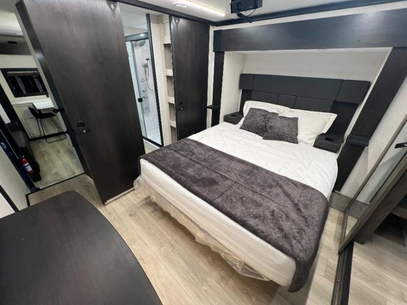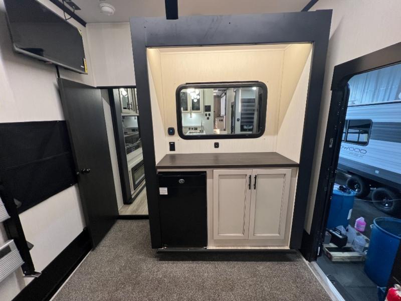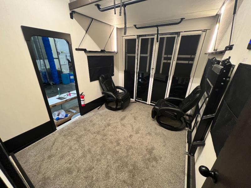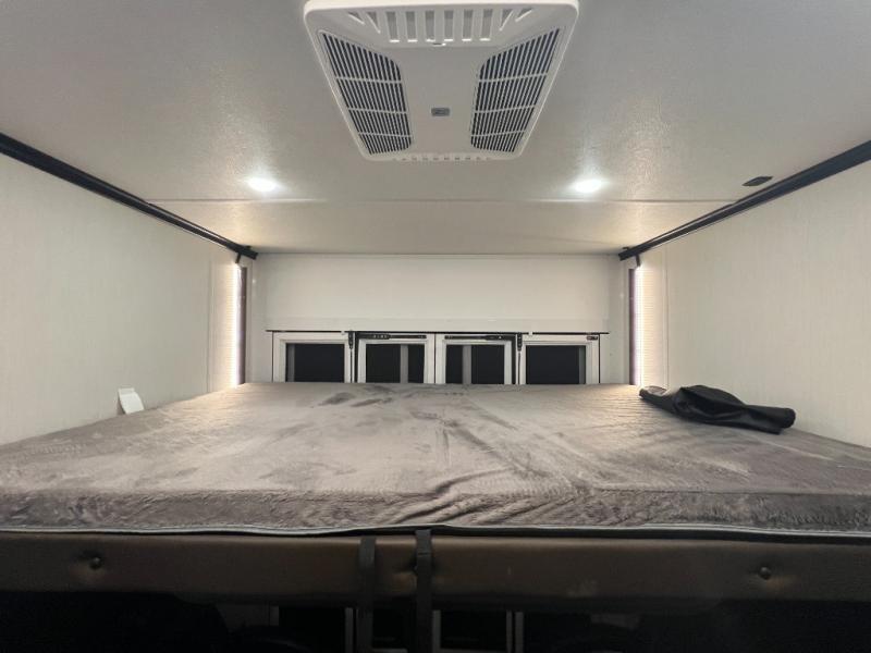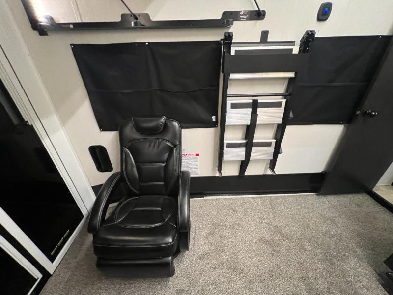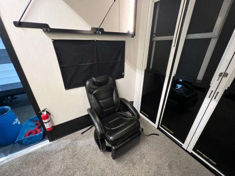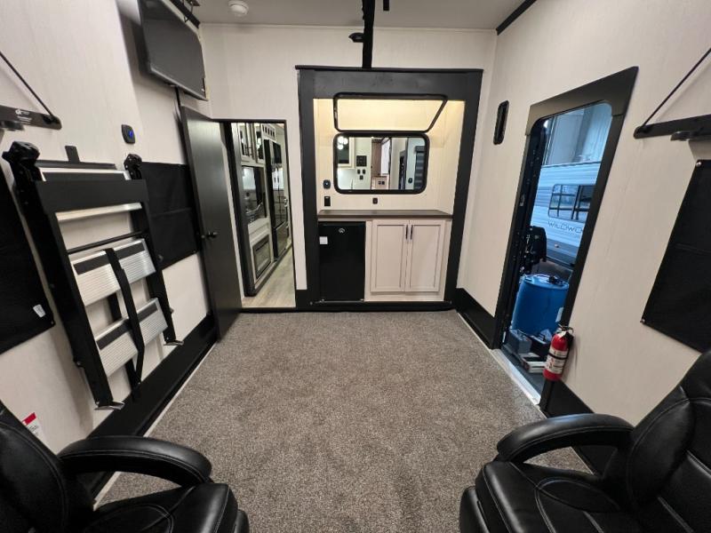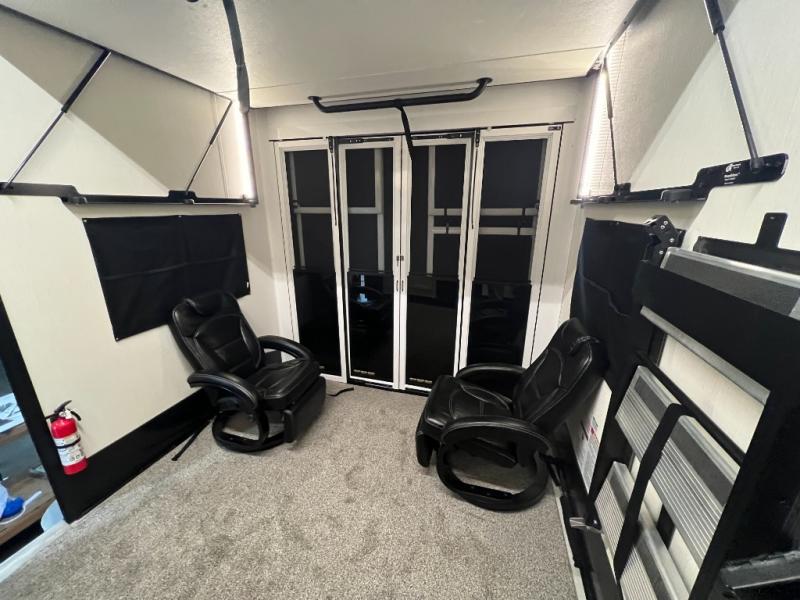 This toy hauler with an 11' separate garage is sure to meet your needs! After you've unloaded your toys, you can relax on the Euro recliners or set up the drop-down queen bed for guests if it's getting late. There is also a window in the garage that opens to the main living area to keep everyone connected, and the flip-up table on the other side of the window provides a place to dine at. A counter peninsula will give the chef of your group more space to prep meals, and the dual opposing slides in this space make it more open. You'll also enjoy the sofa with recliners across from the entertainment center with a fireplace. A full bath with a spacious shower is perfect for cleaning up after a day of trail riding, and the front private bedroom with a queen bed slide is sure to have you feeling right at home!