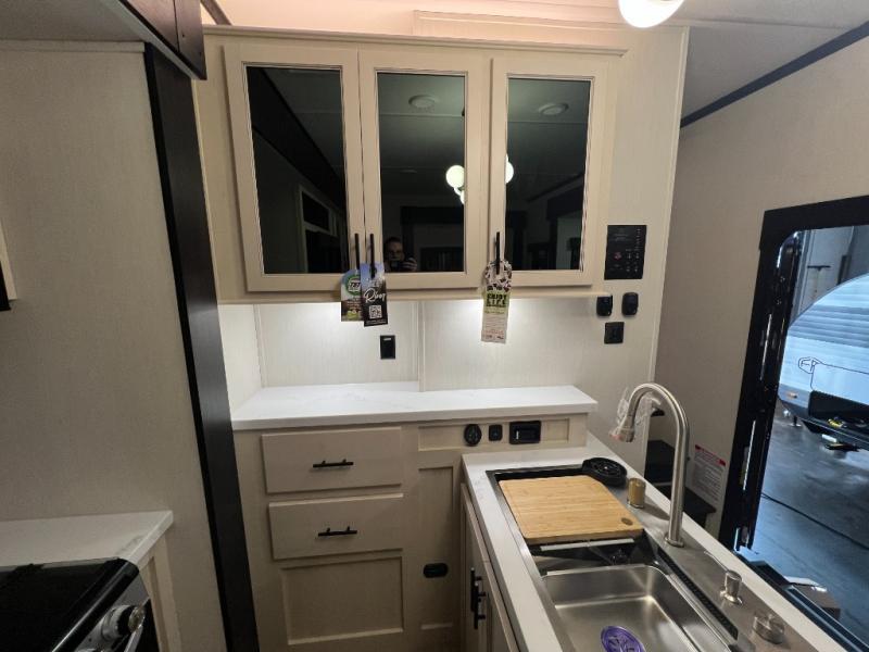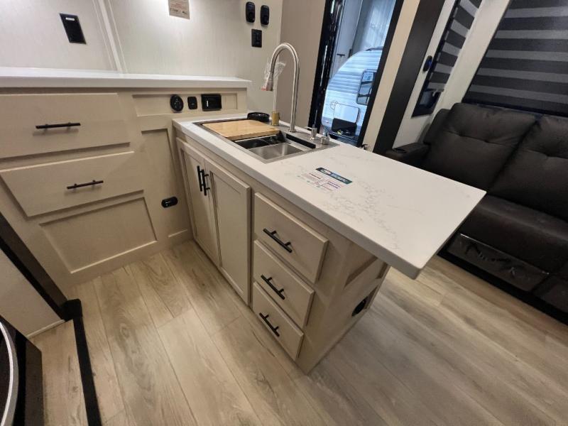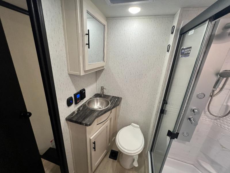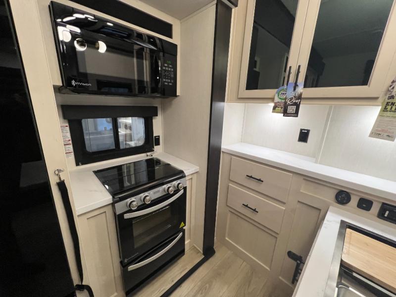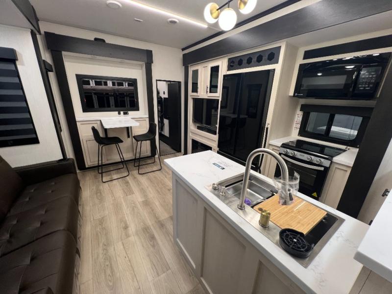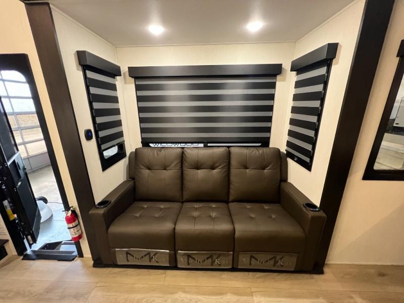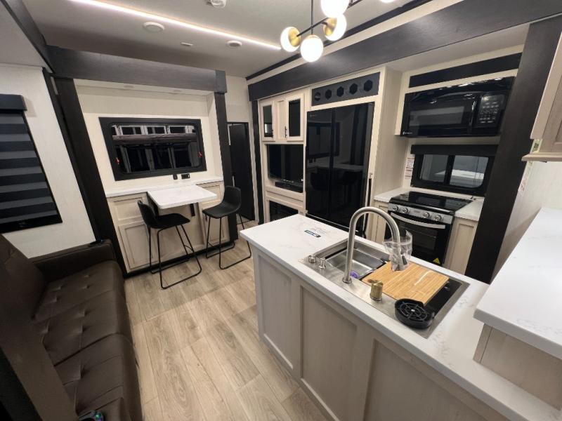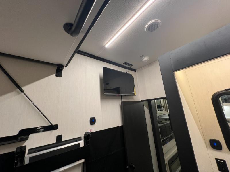 This toy hauler with an 11' separate garage is sure to meet your needs! After you've unloaded your toys, you can relax on the Euro recliners or set up the drop-down queen bed for guests if it's getting late. There is also a window in the garage that opens to the main living area to keep everyone connected, and the flip-up table on the other side of the window provides a place to dine at. A counter peninsula will give the chef of your group more space to prep meals, and the dual opposing slides in this space make it more open. You'll also enjoy the sofa with recliners across from the entertainment center with a fireplace. A full bath with a spacious shower is perfect for cleaning up after a day of trail riding, and the front private bedroom with a queen bed slide is sure to have you feeling right at home!