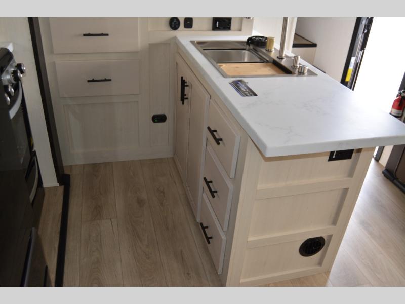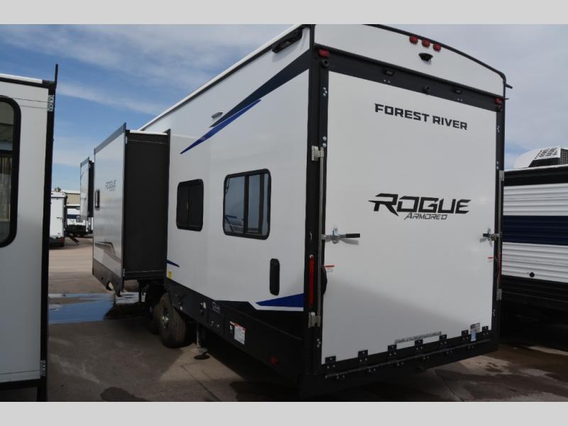 Every one of these Forest River Vengeance Rogue Armored fifth wheel toy haulers come with the features you want most at an affordable price tag! The DuraPoxy gas/oil resistant floor has 5,000 lb. tie downs to ensure your toys will arrive safely without damaging the flooring, plus the 3,000 lb. rated ramp door makes it easy to load them. Two 15,000 BTU A/Cs are "Super H Ducted" to keep you cool even on the hottest summer days, and an Armored underbelly keeps your unit's vitals protected all year long. The Rogue Ready package comes with a six point leveling system, a power MAXX storage system, a TST tire pressure monitoring system, and many more stand-out features. And don't overlook the Rogue Premium Package with an 8' weatherproof ramp door, an exterior TV hookup for the option to add a television, blue accent wheels, and solar reflective safety glass windows to name a few conveniences.