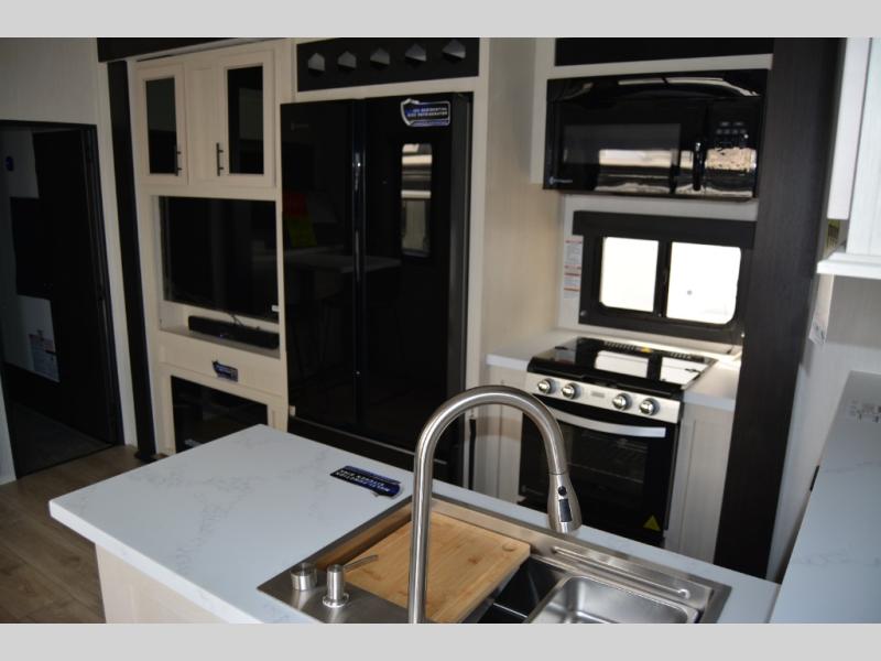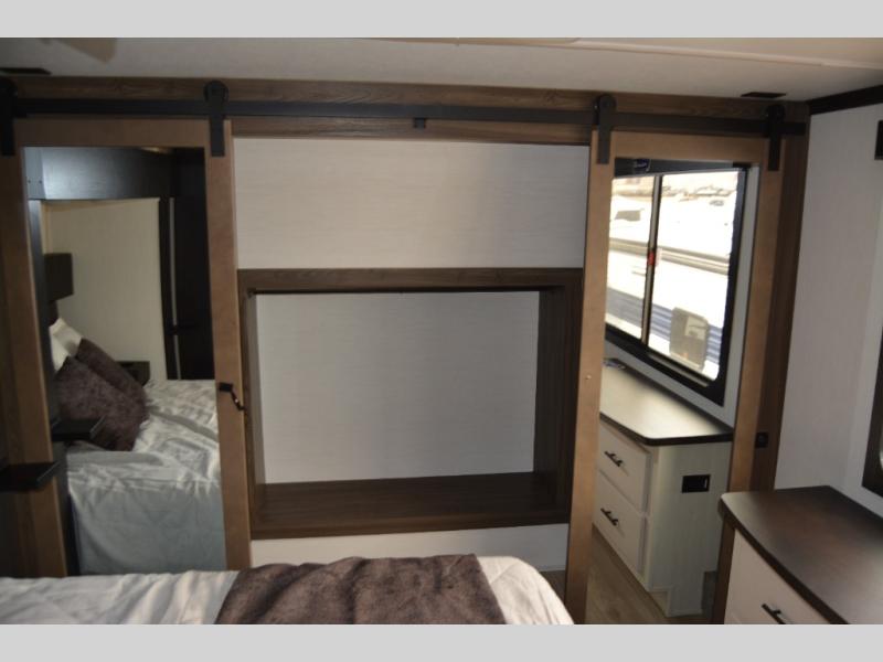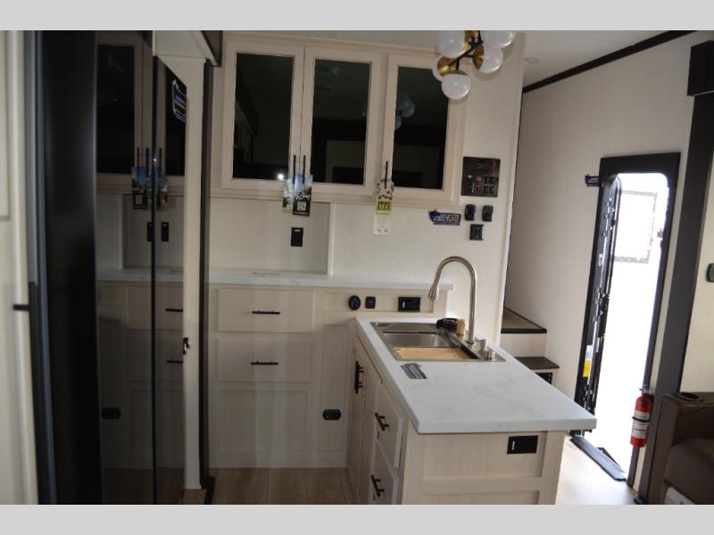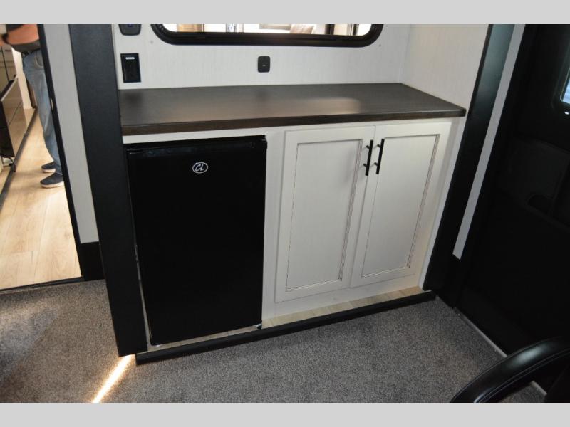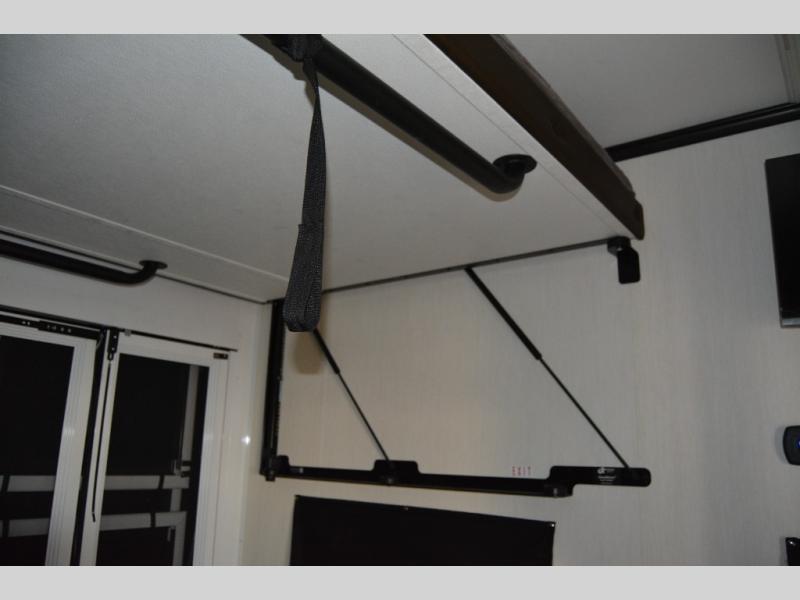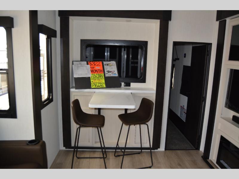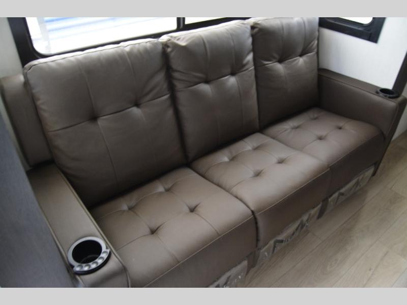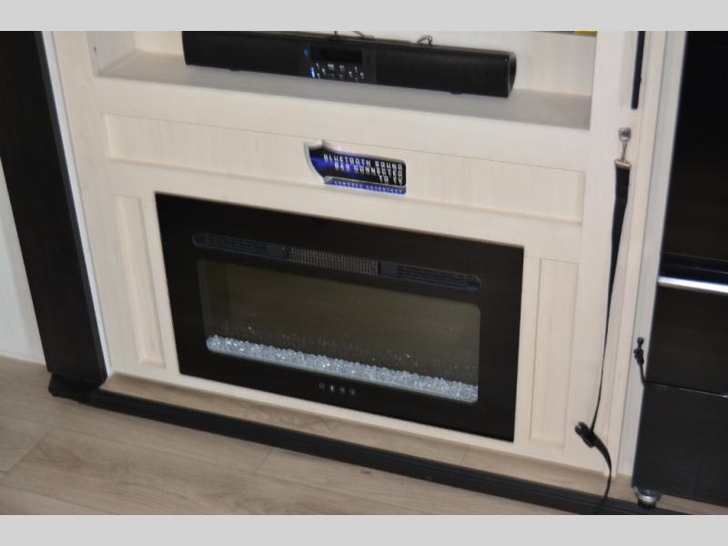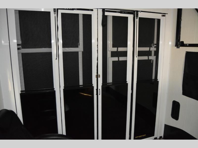 This toy hauler with an 11' separate garage is sure to meet your needs! After you've unloaded your toys, you can relax on the Euro recliners or set up the drop-down queen bed for guests if it's getting late. There is also a window in the garage that opens to the main living area to keep everyone connected, and the flip-up table on the other side of the window provides a place to dine at. A counter peninsula will give the chef of your group more space to prep meals, and the dual opposing slides in this space make it more open. You'll also enjoy the sofa with recliners across from the entertainment center with a fireplace. A full bath with a spacious shower is perfect for cleaning up after a day of trail riding, and the front private bedroom with a queen bed slide is sure to have you feeling right at home!