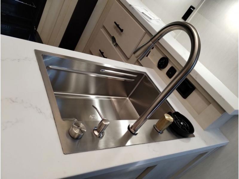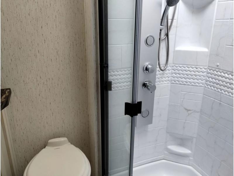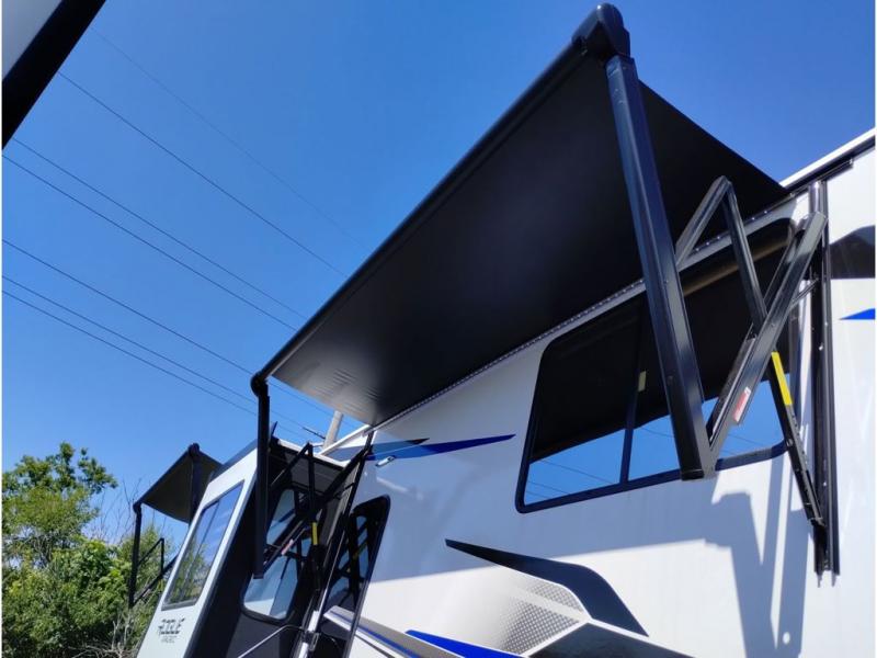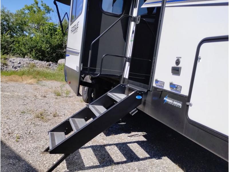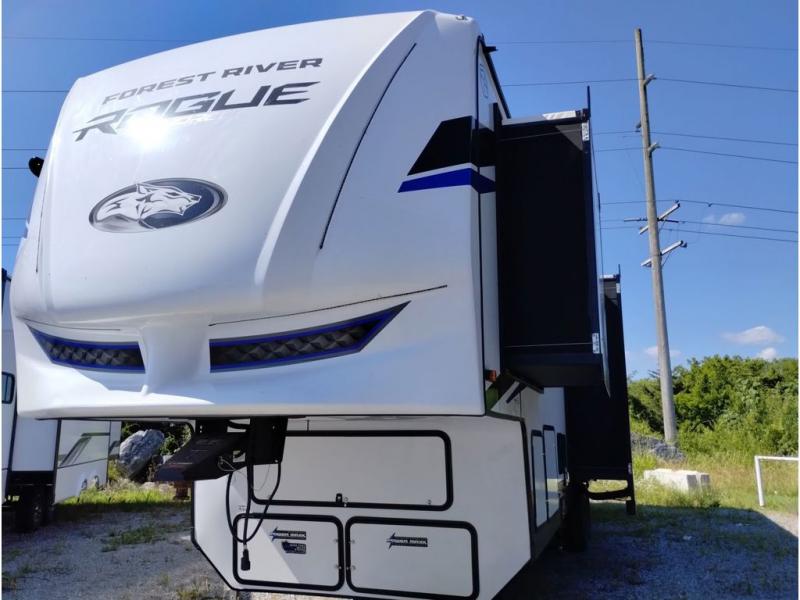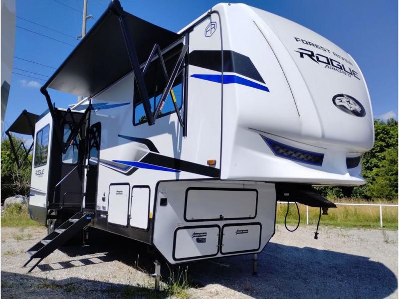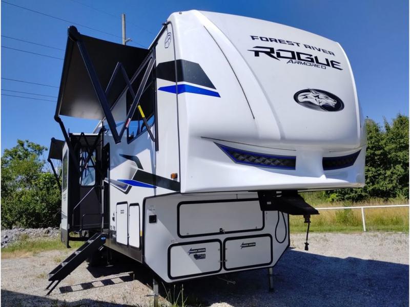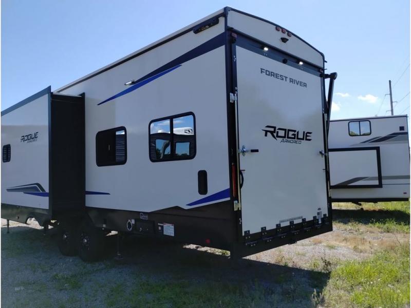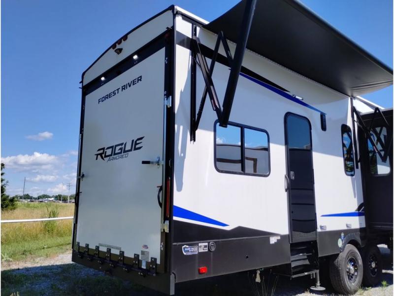 Every one of these Forest River Vengeance Rogue Armored fifth wheel toy haulers come with the features you want most at an affordable price tag! The DuraPoxy gas/oil resistant floor has 5,000 lb. tie downs to ensure your toys will arrive safely without damaging the flooring, plus the 3,000 lb. rated ramp door makes it easy to load them. Two 15,000 BTU A/Cs are "Super H Ducted" to keep you cool even on the hottest summer days, and an Armored underbelly keeps your unit's vitals protected all year long. The Rogue Ready package comes with a six point leveling system, a power MAXX storage system, a TST tire pressure monitoring system, and many more stand-out features. And don't overlook the Rogue Premium Package with an 8' weatherproof ramp door, an exterior TV hookup for the option to add a television, blue accent wheels, and solar reflective safety glass windows to name a few conveniences.
