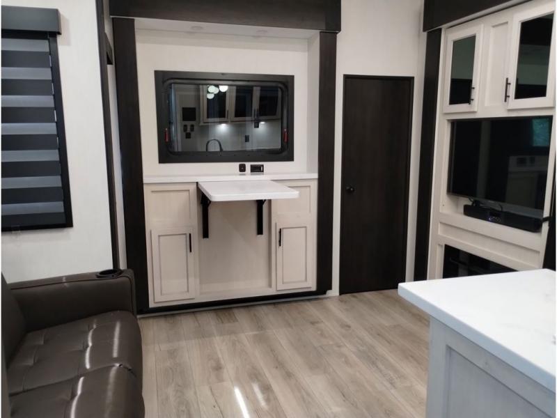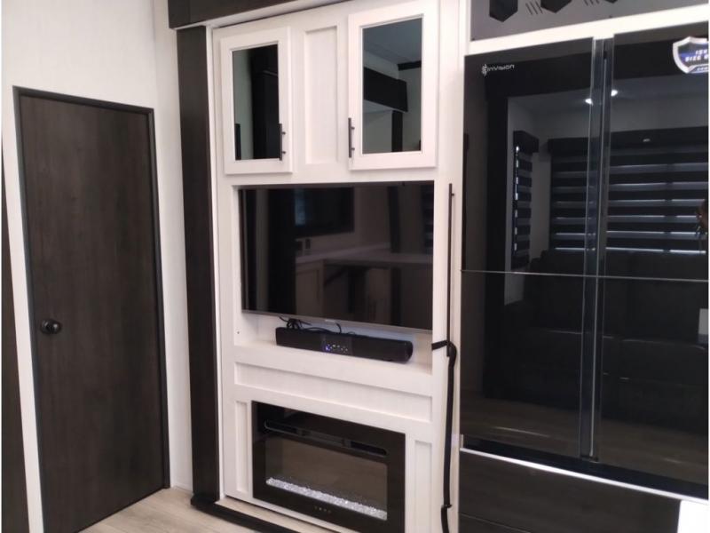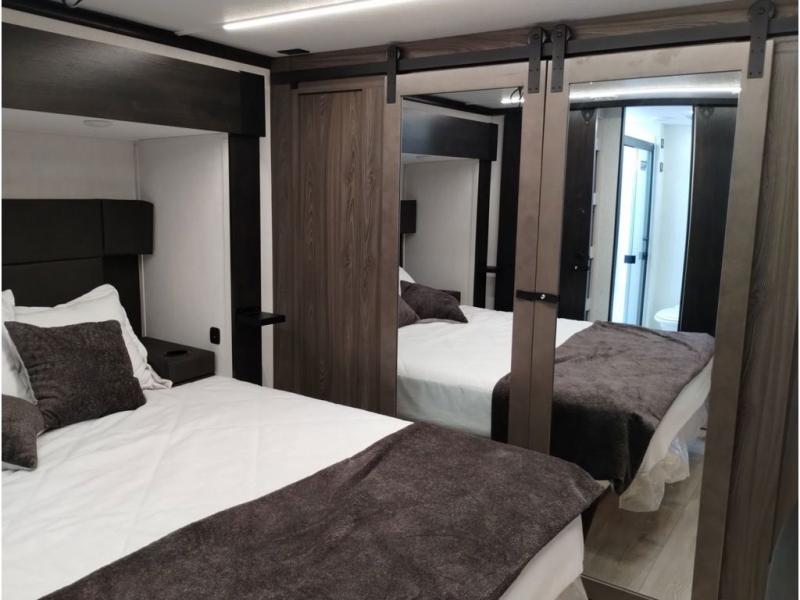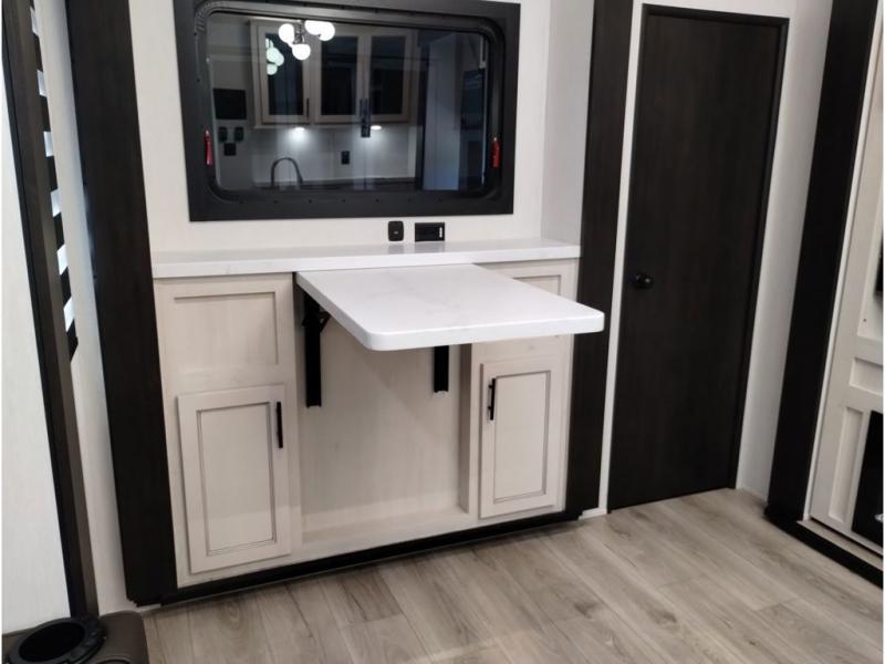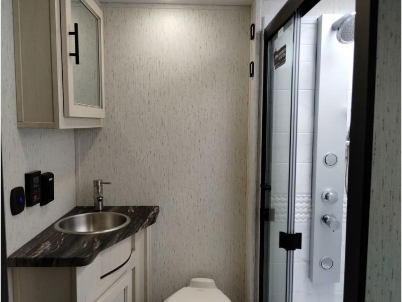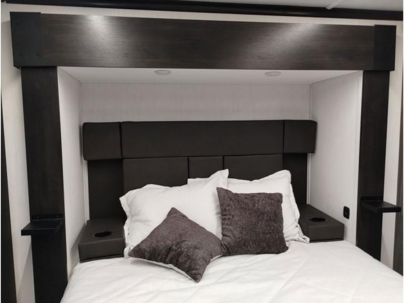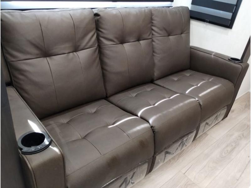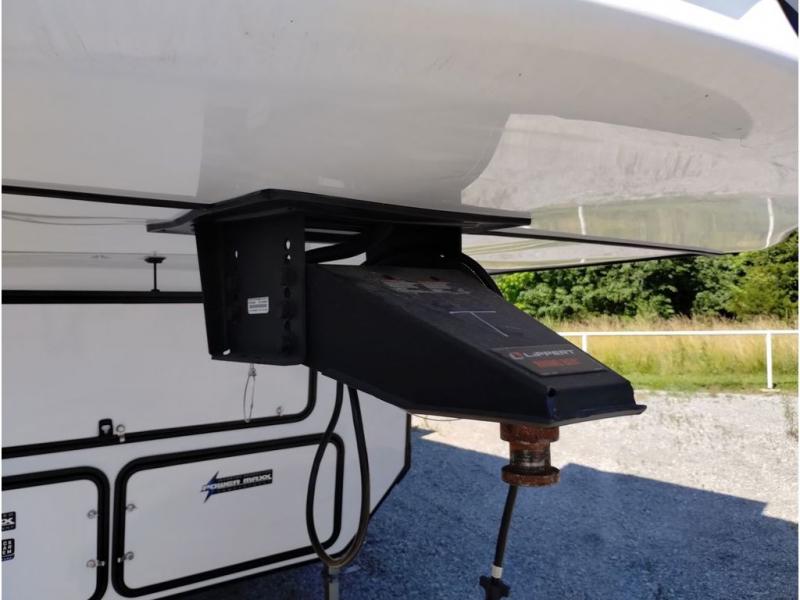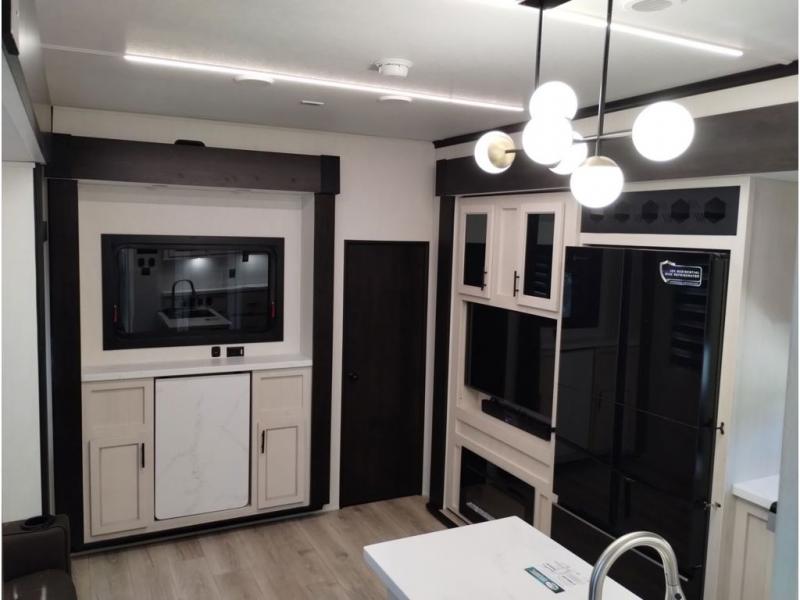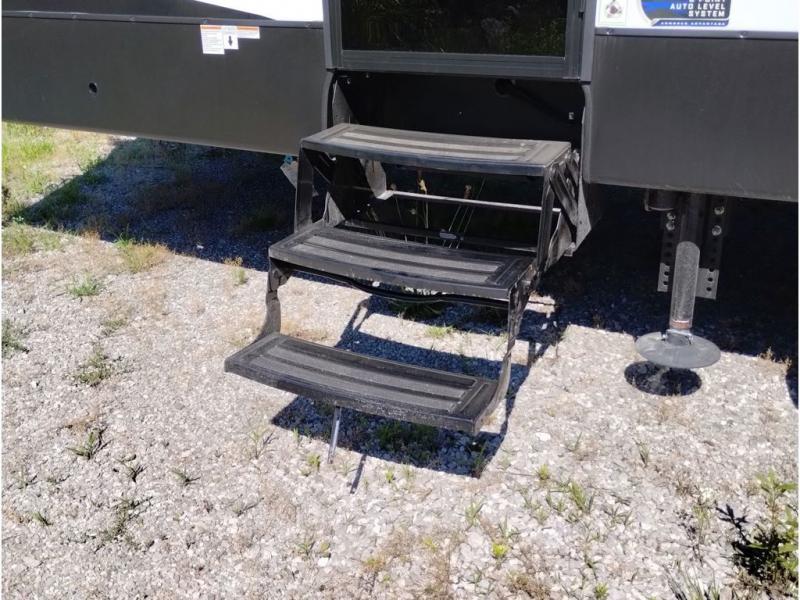 This toy hauler with an 11' separate garage is sure to meet your needs! After you've unloaded your toys, you can relax on the Euro recliners or set up the drop-down queen bed for guests if it's getting late. There is also a window in the garage that opens to the main living area to keep everyone connected, and the flip-up table on the other side of the window provides a place to dine at. A counter peninsula will give the chef of your group more space to prep meals, and the dual opposing slides in this space make it more open. You'll also enjoy the sofa with recliners across from the entertainment center with a fireplace. A full bath with a spacious shower is perfect for cleaning up after a day of trail riding, and the front private bedroom with a queen bed slide is sure to have you feeling right at home!