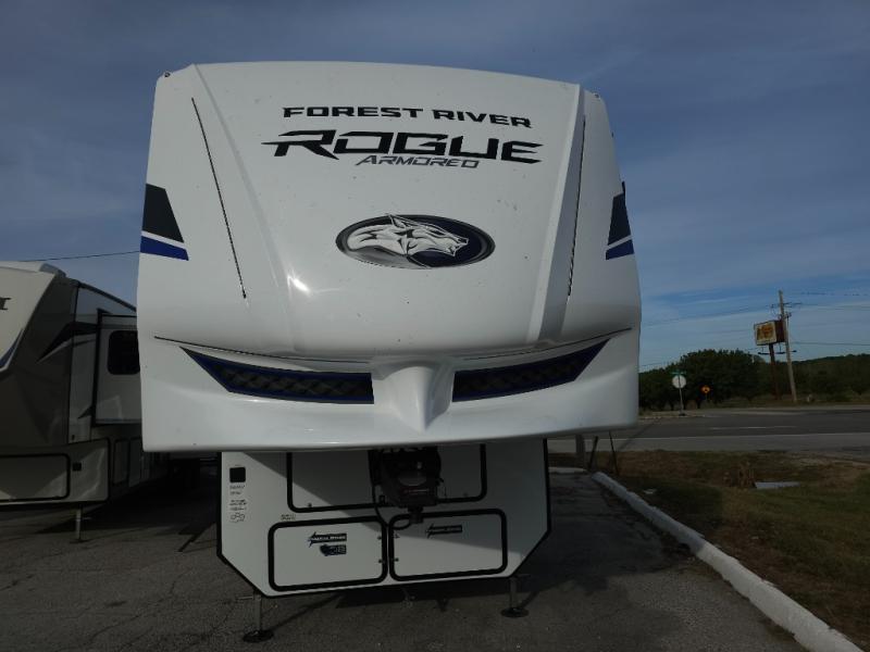 Every one of these Forest River Vengeance Rogue Armored fifth wheel toy haulers come with the features you want most at an affordable price tag! The DuraPoxy gas/oil resistant floor has 5,000 lb. tie downs to ensure your toys will arrive safely without damaging the flooring, plus the 3,000 lb. rated ramp door makes it easy to load them. Two 15,000 BTU A/Cs are "Super H Ducted" to keep you cool even on the hottest summer days, and an enclosed and heated underbelly keeps your unit's vitals protected all year long. The Rogue Armored package comes with a six point leveling system, a comfort plus adjustable powered king bed system, and a ramp door patio rail system. There are also two additional packages packed with features to make camping hassle-free!