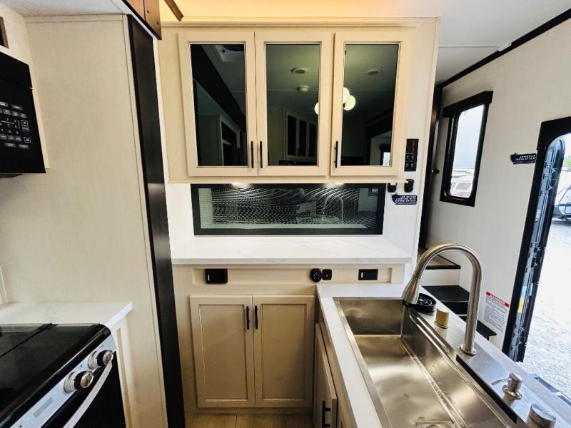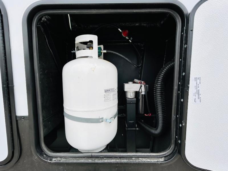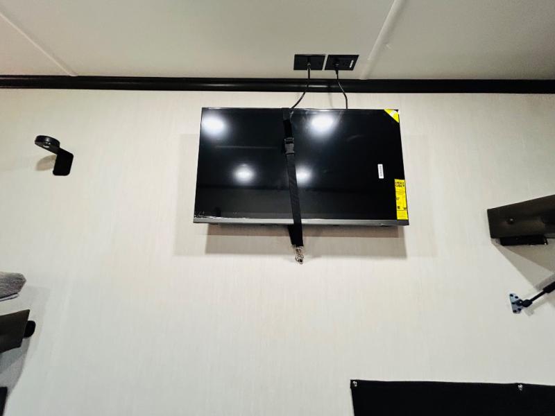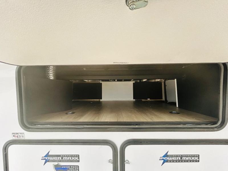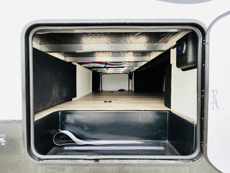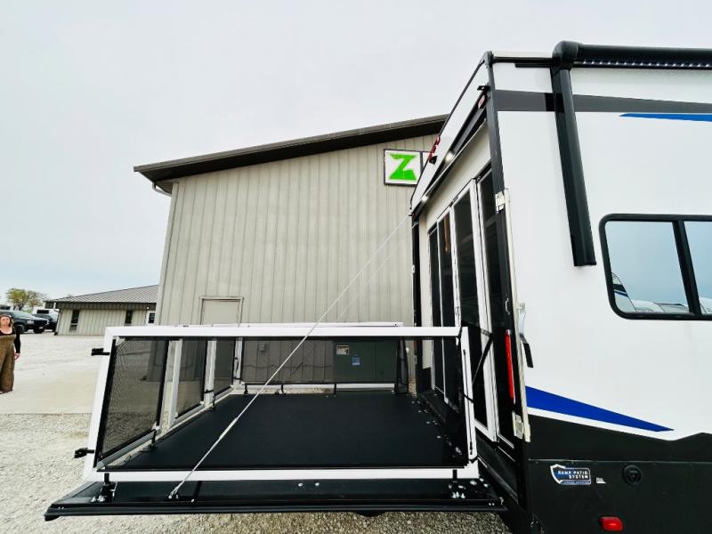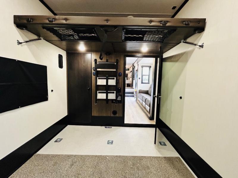 The 15' 6" garage area of this fifth wheel toy hauler has enough space for you to bring along your favorite off-road toys! The garage area also has opposing flip-up sofas with a table in between and a raised queen bed above, plus a loft and a half bath/utility bath. There is plenty of interior space in the central combined living/kitchen area thanks to the large slide out sofa with recliners, as well as the refrigerator and three burner cooktop slide. The front dual entry bathroom has a radius shower for you to freshen up in each morning and an entrance into a private bedroom with king bed and lots of storage!