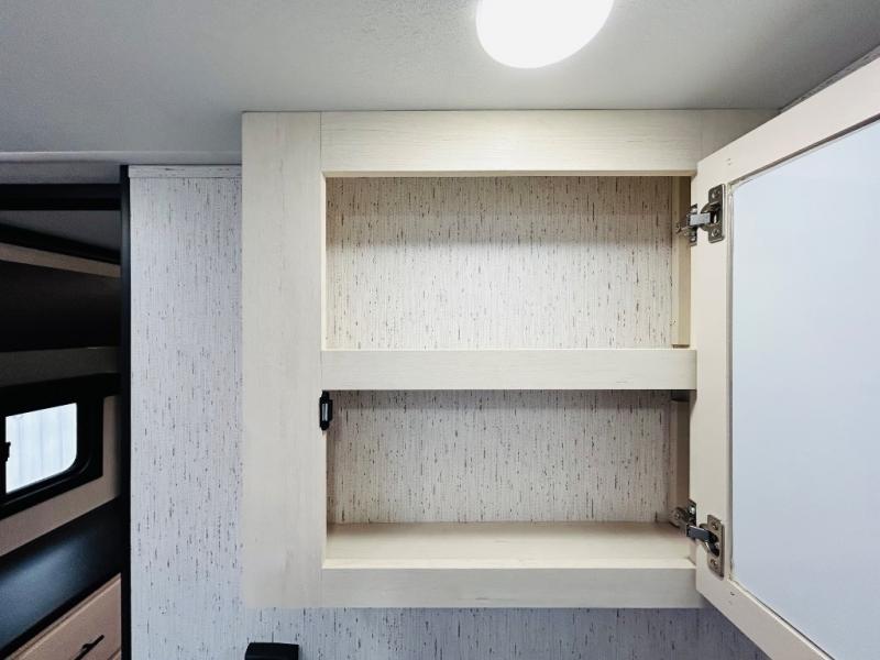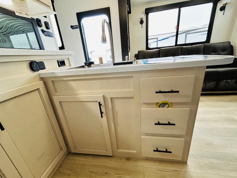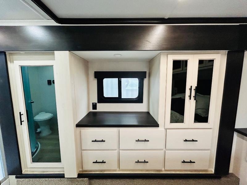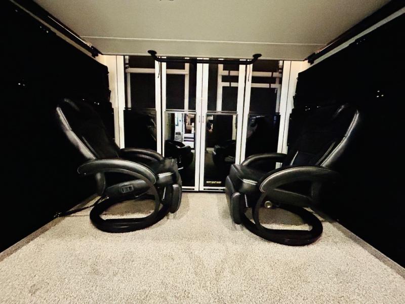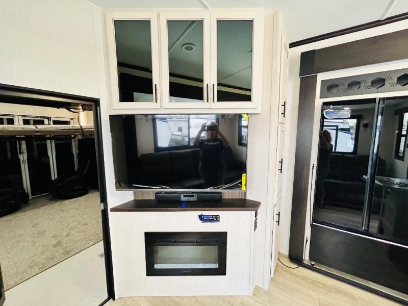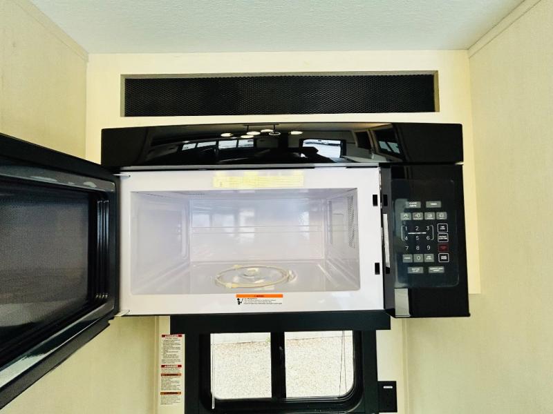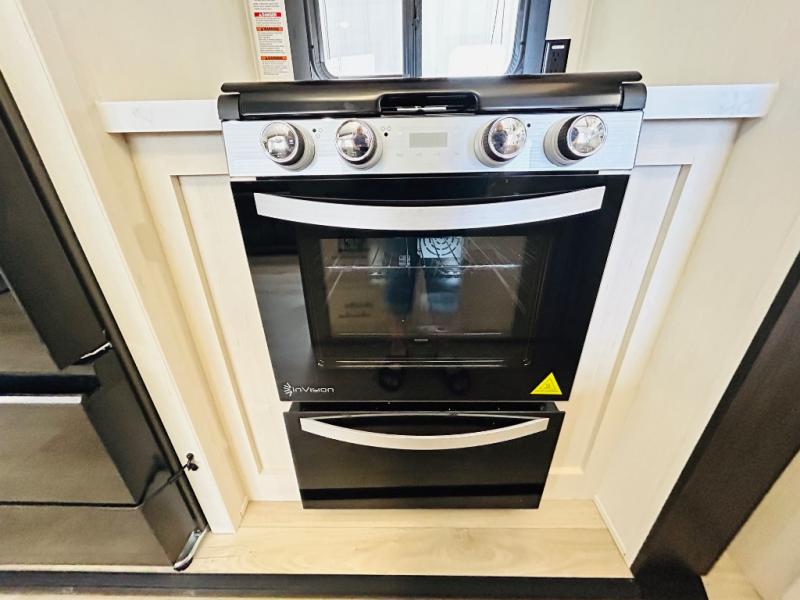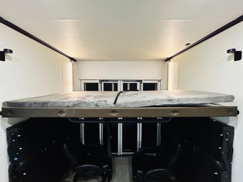 The 15' 6" garage area of this fifth wheel toy hauler has enough space for you to bring along your favorite off-road toys! The garage area also has opposing flip-up sofas with a table in between and a raised queen bed above, plus a loft and a half bath/utility bath. There is plenty of interior space in the central combined living/kitchen area thanks to the large slide out sofa with recliners, as well as the refrigerator and three burner cooktop slide. The front dual entry bathroom has a radius shower for you to freshen up in each morning and an entrance into a private bedroom with king bed and lots of storage!