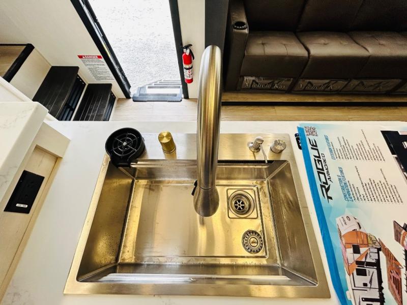 Every one of these Forest River Vengeance Rogue Armored fifth wheel toy haulers come with the features you want most at an affordable price tag! The DuraPoxy gas/oil resistant floor has 5,000 lb. tie downs to ensure your toys will arrive safely without damaging the flooring, plus the 3,000 lb. rated ramp door makes it easy to load them. Two 15,000 BTU A/Cs are "Super H Ducted" to keep you cool even on the hottest summer days, and an Armored underbelly helps keep your unit's vitals protected. The Rogue Ready package comes with a six point leveling system, a power MAXX storage system, a TST tire pressure monitoring system, and many more stand-out features. And don't overlook the Rogue Premium Package with an 8' weatherproof ramp door, an exterior TV hookup for the option to add a television, blue accent wheels, and solar reflective safety glass windows to name a few conveniences.