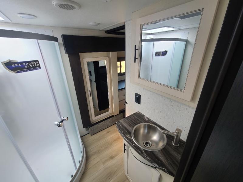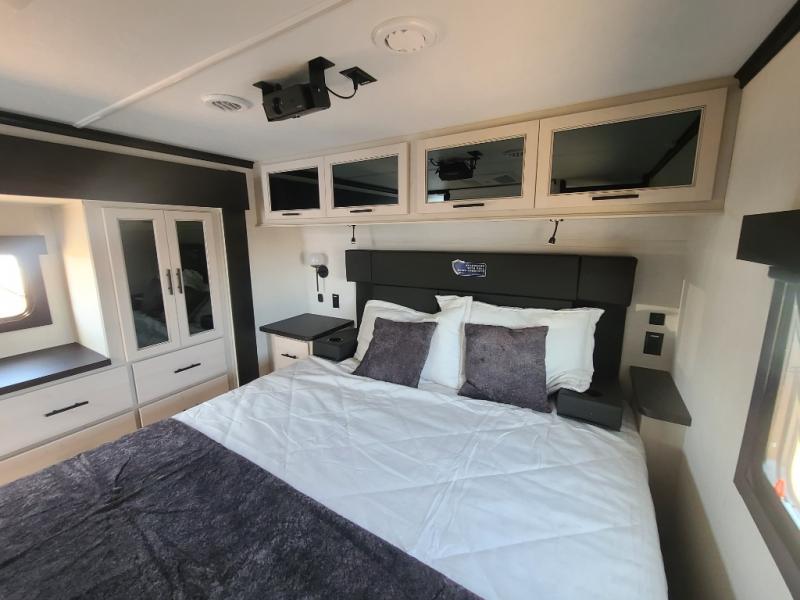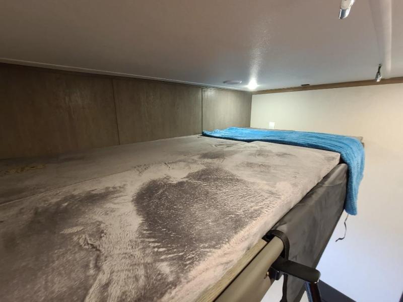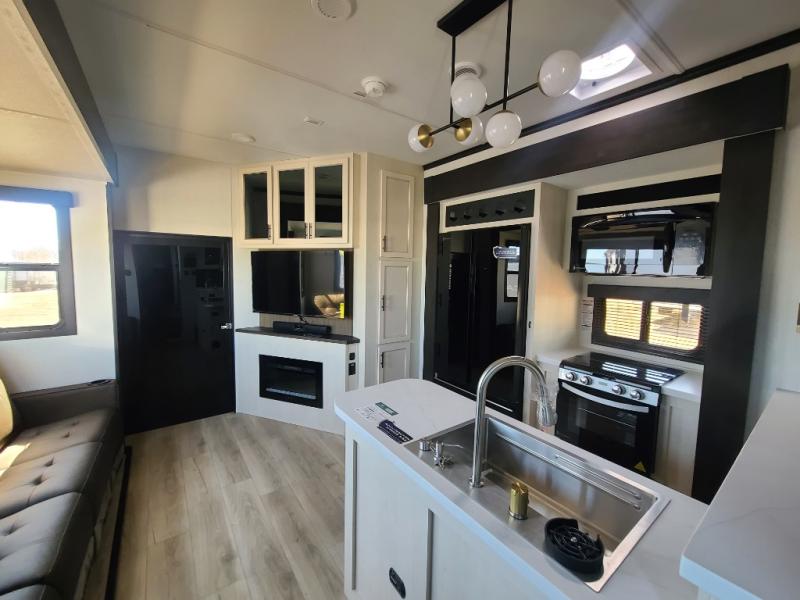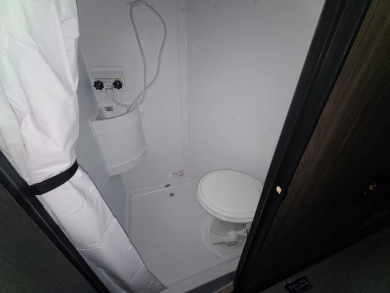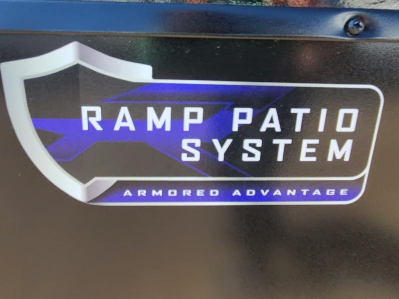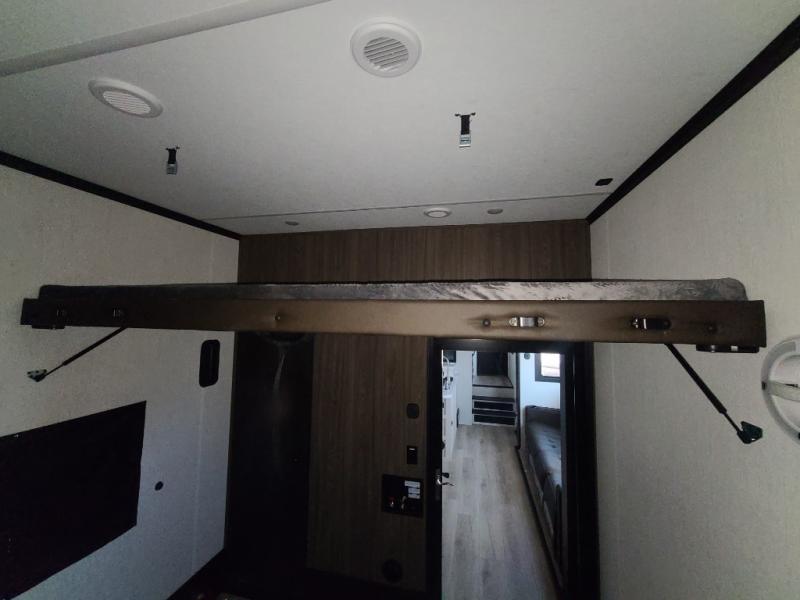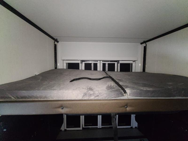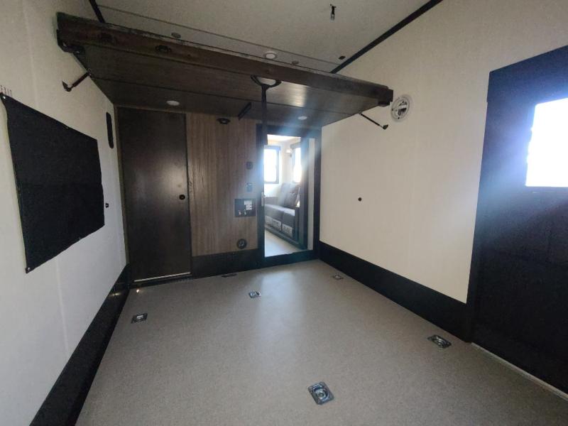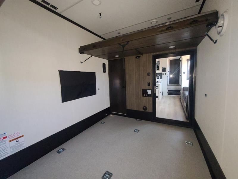 The 15' 6" garage area of this fifth wheel toy hauler has enough space for you to bring along your favorite off-road toys! The garage area also has opposing flip-up sofas with a table in between and a raised queen bed above, plus a loft and a half bath/utility bath. There is plenty of interior space in the central combined living/kitchen area thanks to the large slide out sofa with recliners, as well as the refrigerator and three burner cooktop slide. The front dual entry bathroom has a radius shower for you to freshen up in each morning and an entrance into a private bedroom with king bed and lots of storage!