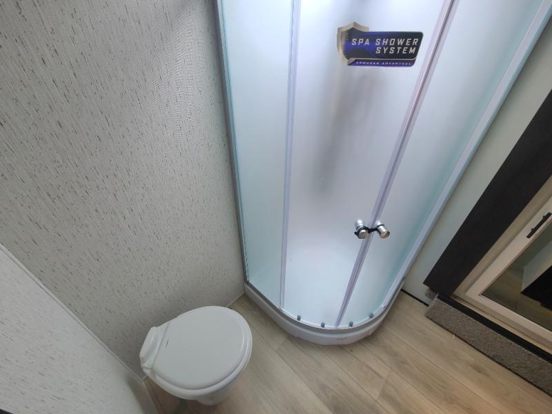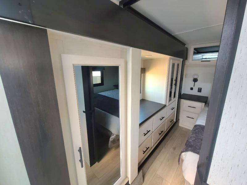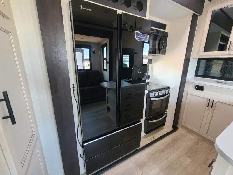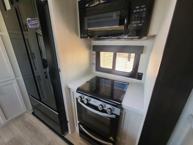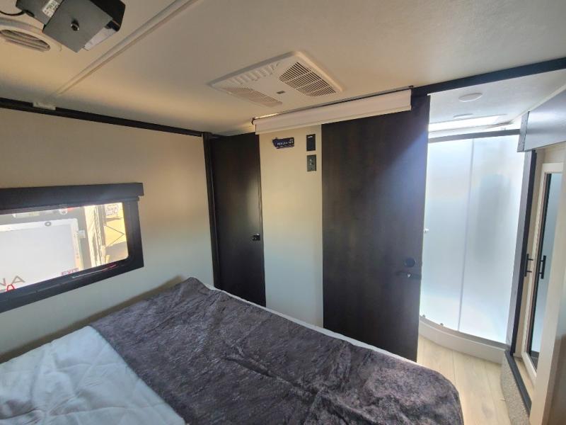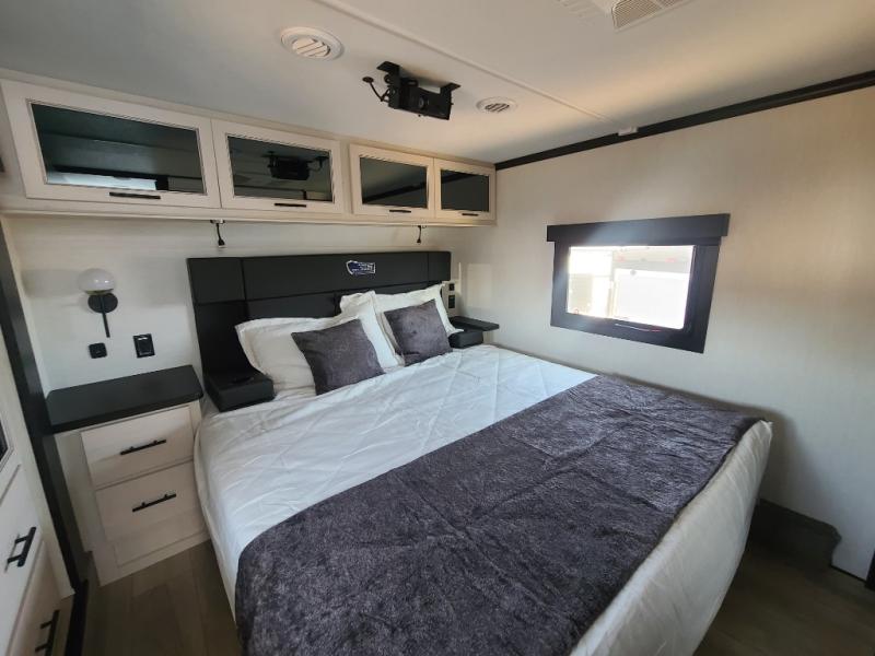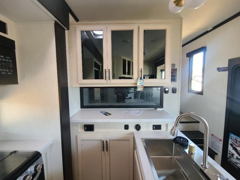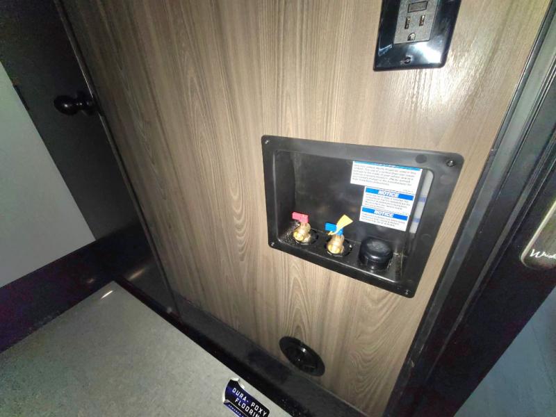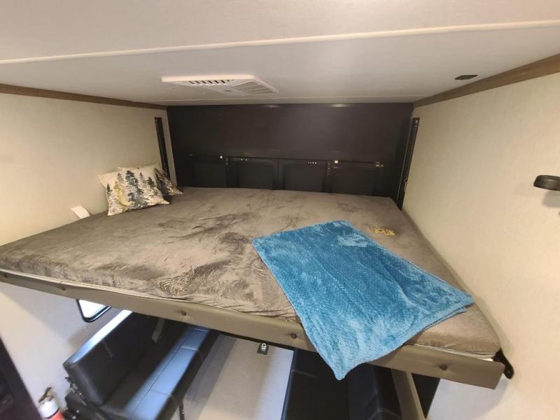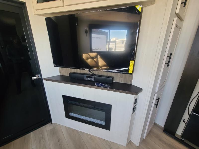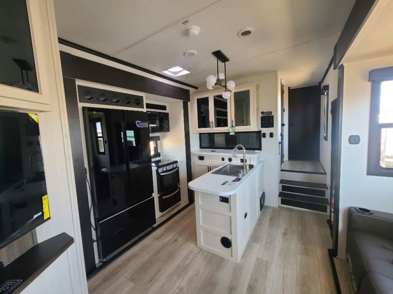 The 15' 6" garage area of this fifth wheel toy hauler has enough space for you to bring along your favorite off-road toys! The garage area also has opposing flip-up sofas with a table in between and a raised queen bed above, plus a loft and a half bath/utility bath. There is plenty of interior space in the central combined living/kitchen area thanks to the large slide out sofa with recliners, as well as the refrigerator and three burner cooktop slide. The front dual entry bathroom has a radius shower for you to freshen up in each morning and an entrance into a private bedroom with king bed and lots of storage!