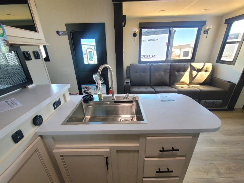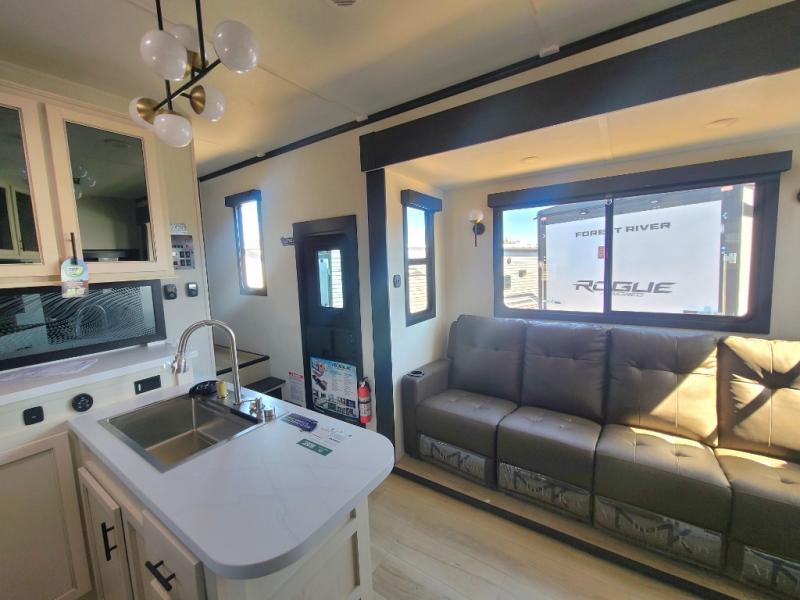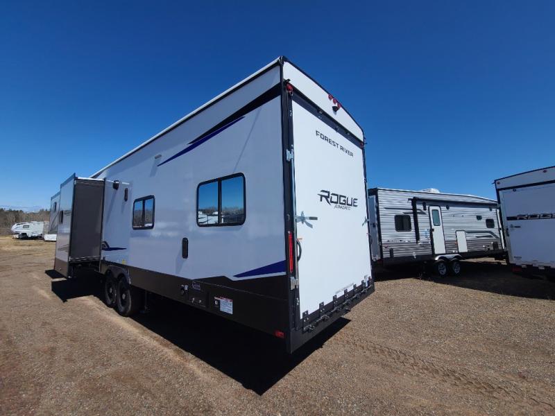 Every one of these Forest River Vengeance Rogue Armored fifth wheel toy haulers come with the features you want most at an affordable price tag! The DuraPoxy gas/oil resistant floor has 5,000 lb. tie downs to ensure your toys will arrive safely without damaging the flooring, plus the 3,000 lb. rated ramp door makes it easy to load them. Two 15,000 BTU A/Cs are "Super H Ducted" to keep you cool even on the hottest summer days, and an Armored underbelly helps keep your unit's vitals protected. The Rogue Ready package comes with a six point leveling system, a power MAXX storage system, a TST tire pressure monitoring system, and many more stand-out features. And don't overlook the Rogue Premium Package with an 8' weatherproof ramp door, an exterior TV hookup for the option to add a television, blue accent wheels, and solar reflective safety glass windows to name a few conveniences.